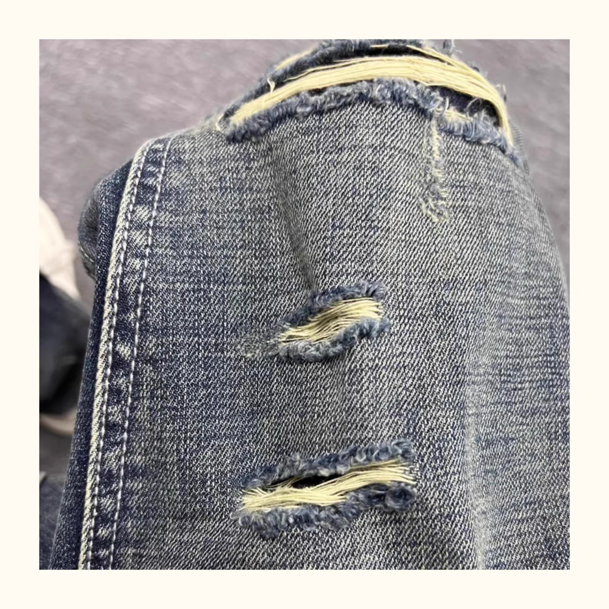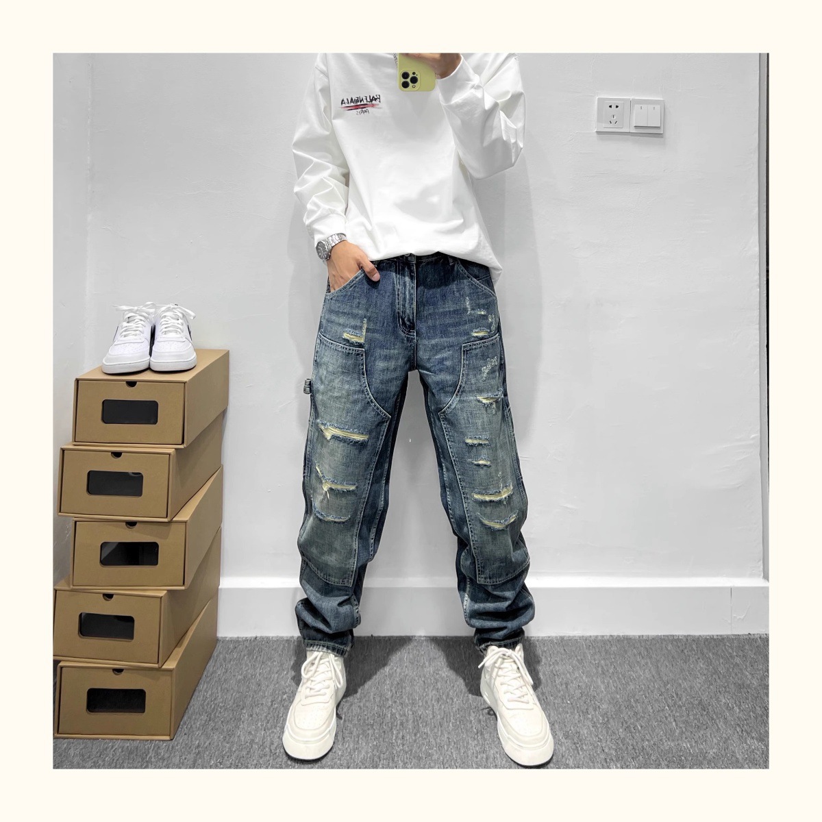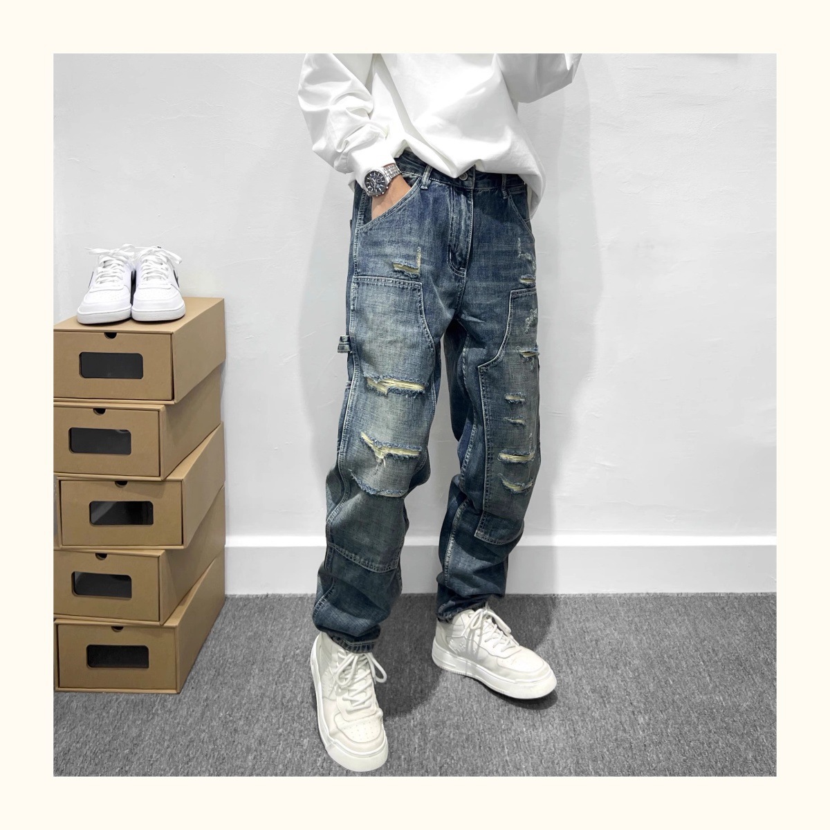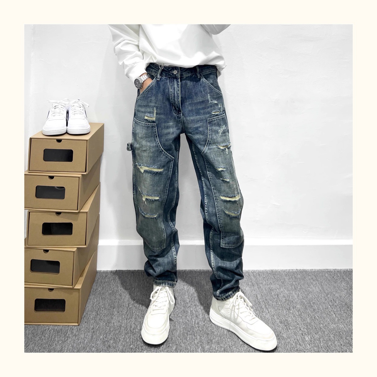 트렌디 한 브랜드 레트로 헤비 리핑 툴링 청바지 남성 아메리칸 스타일 하이 스트리트 느슨한 작은 스트레이트 바지 남성 테이퍼 바지스토어 가기