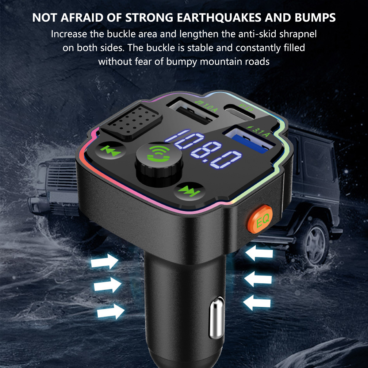 [Con dos puertos USB y PD]El transmisor FM tiene 2 puertos de carga USB y una interfaz PD 20W, y el voltaje de salida es de 5V 1.5A o 5V 3.1A; El voltaje de entrada es de 12-24V,. Que puede cargar varios teléfonos móviles al mismo tiempo.