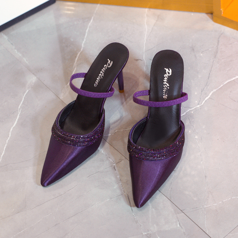 뾰족한 보라색 하이힐 2025 봄 새 도착 신발 얇은 뒤꿈치 라인스톤 새틴 반쪽 슬리퍼스토어 가기