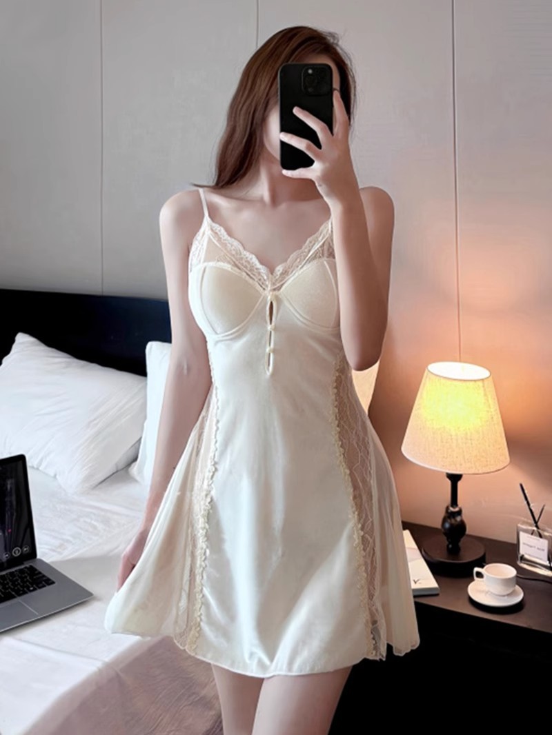 봄과 가을 골든 벨벳 파자마 여성용 긴팔 세트 가을 및 겨울 섹시한 V 넥 가슴 패드 슬링 나이트 가운 투피스 세트