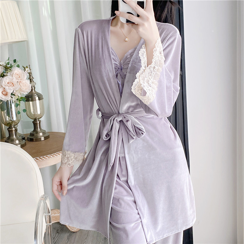 봄과 가을 골든 벨벳 파자마 여성용 긴팔 세트 가을 및 겨울 섹시한 V 넥 가슴 패드 슬링 나이트 가운 투피스 세트스토어 가기