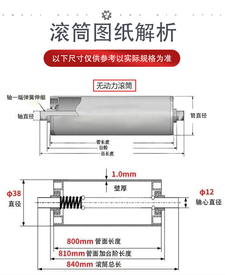 • Φ38-800-840*샤프트 Φ12 롤링 스테인레스 스틸 + 샤프트 철