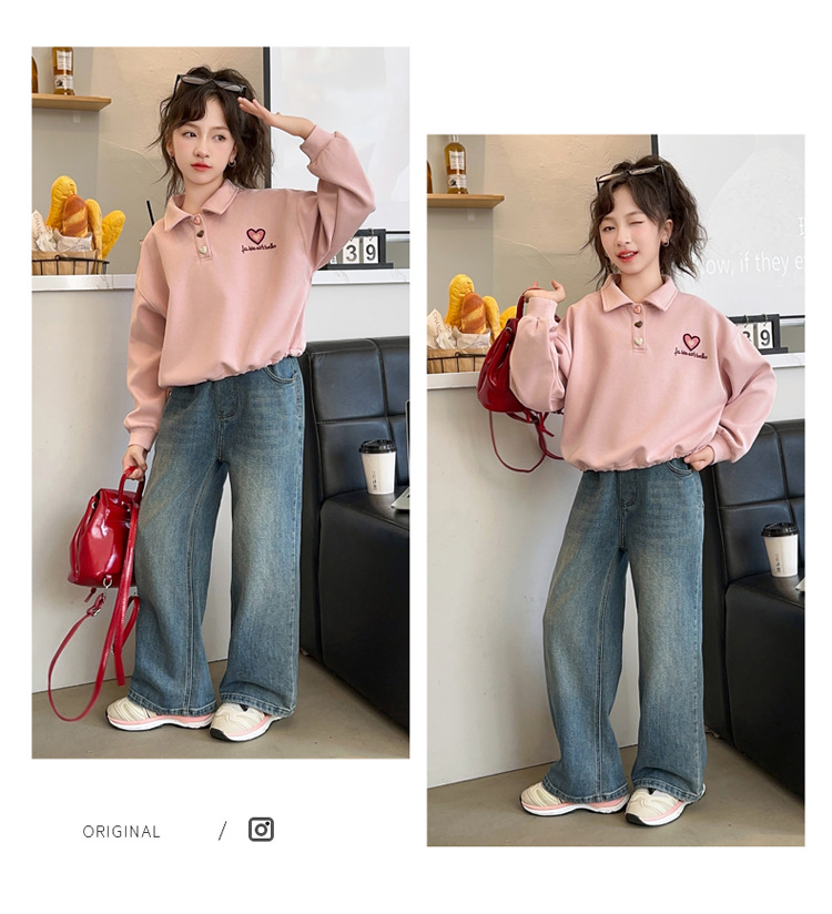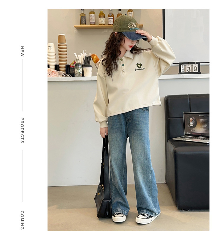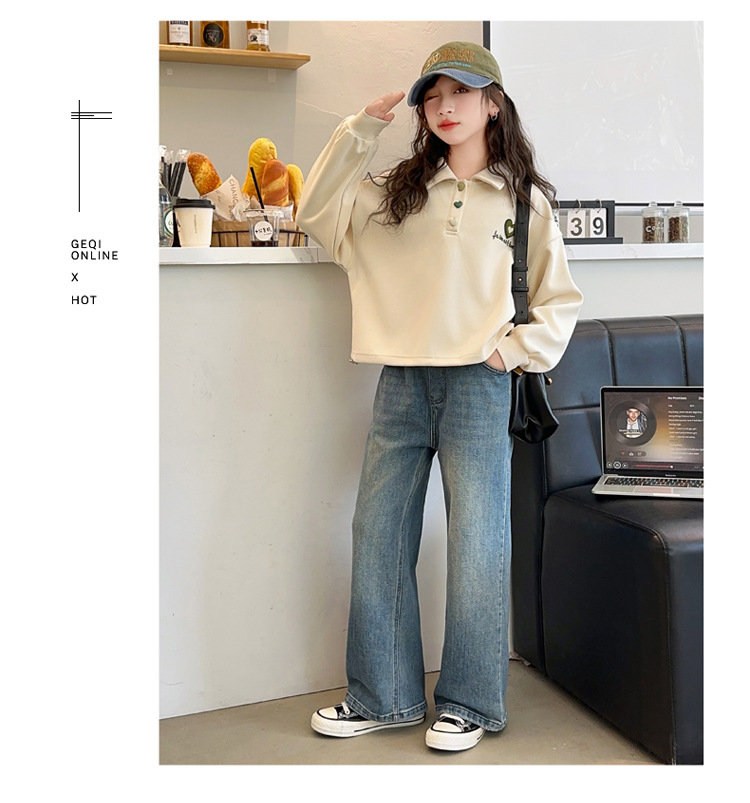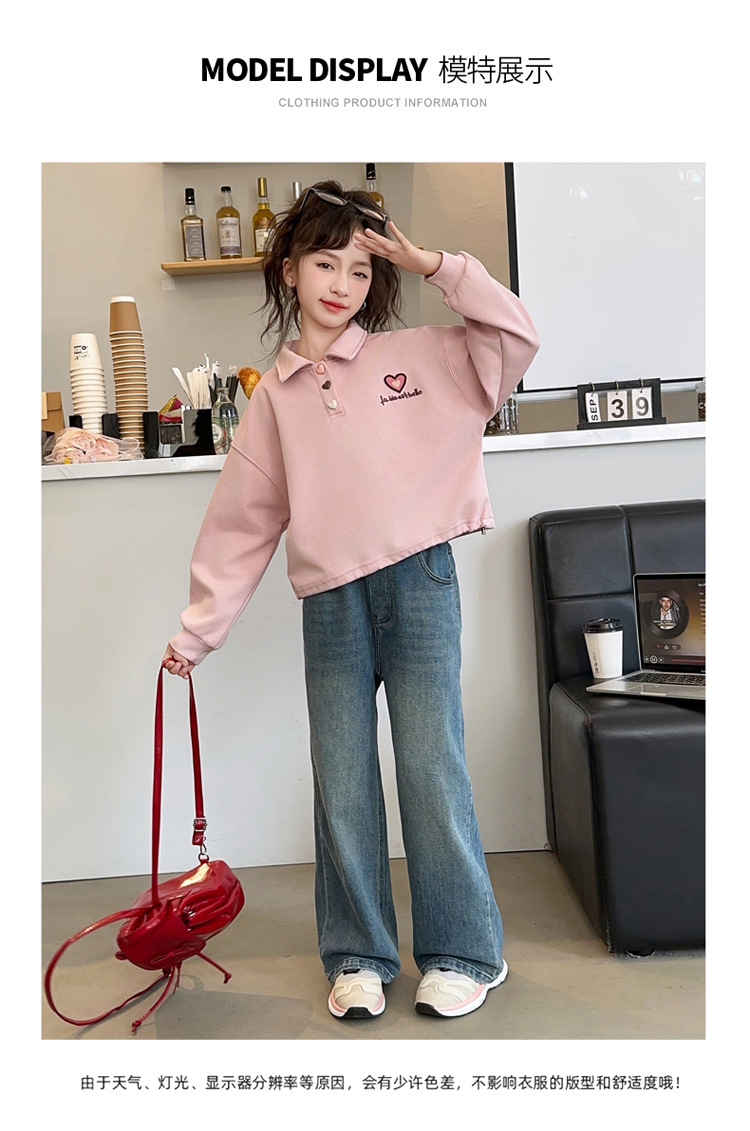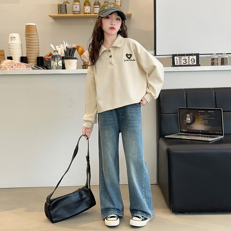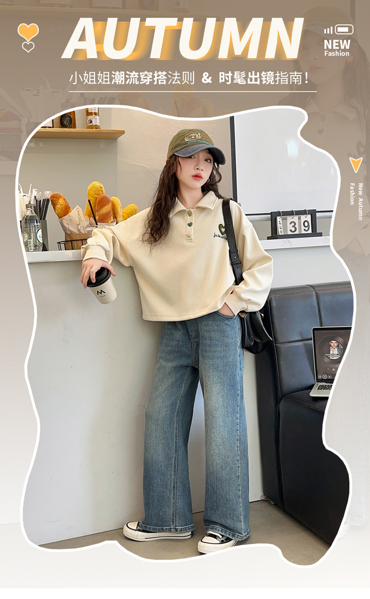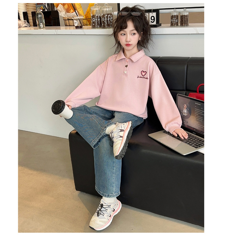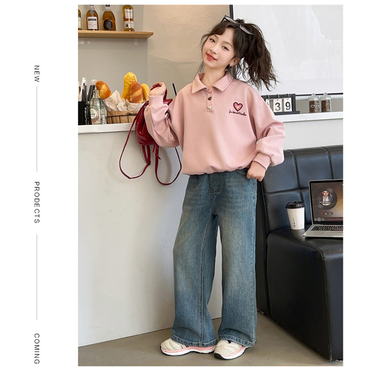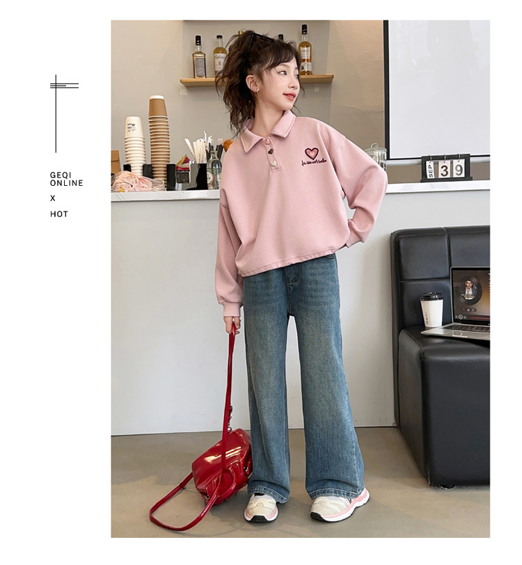 소녀의 봄 폴로 셔츠 세트 2025 새로운 스타일 어린이 청바지 스웨트 셔츠 소녀의 봄과 가을 투피스 세트스토어 가기