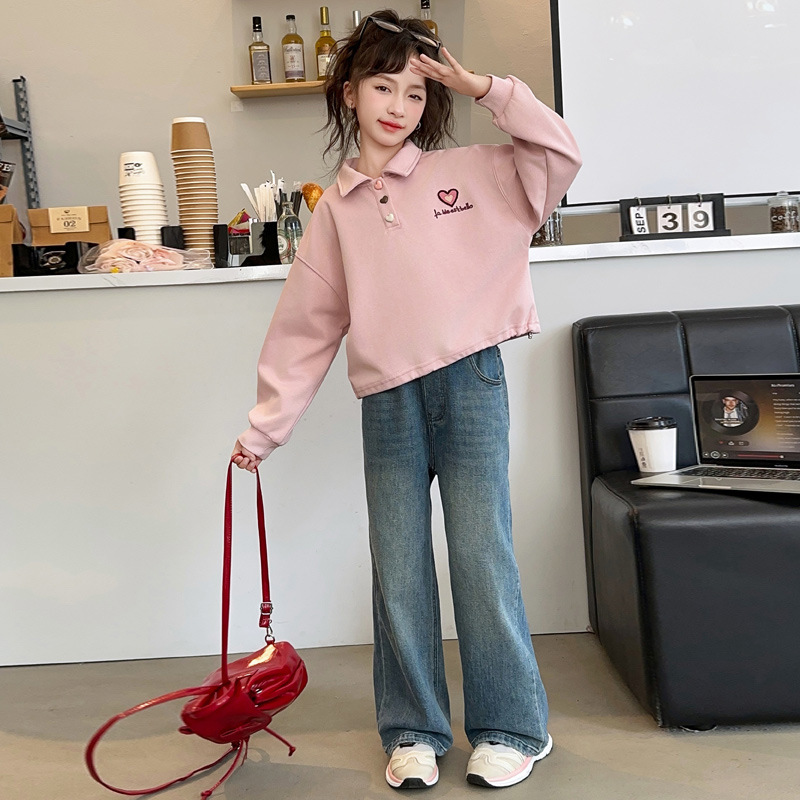 소녀의 봄 폴로 셔츠 세트 2025 새로운 스타일 어린이 청바지 스웨트 셔츠 소녀의 봄과 가을 투피스 세트