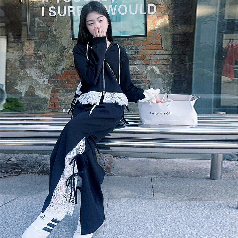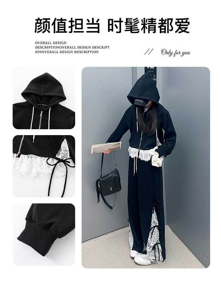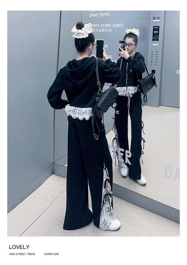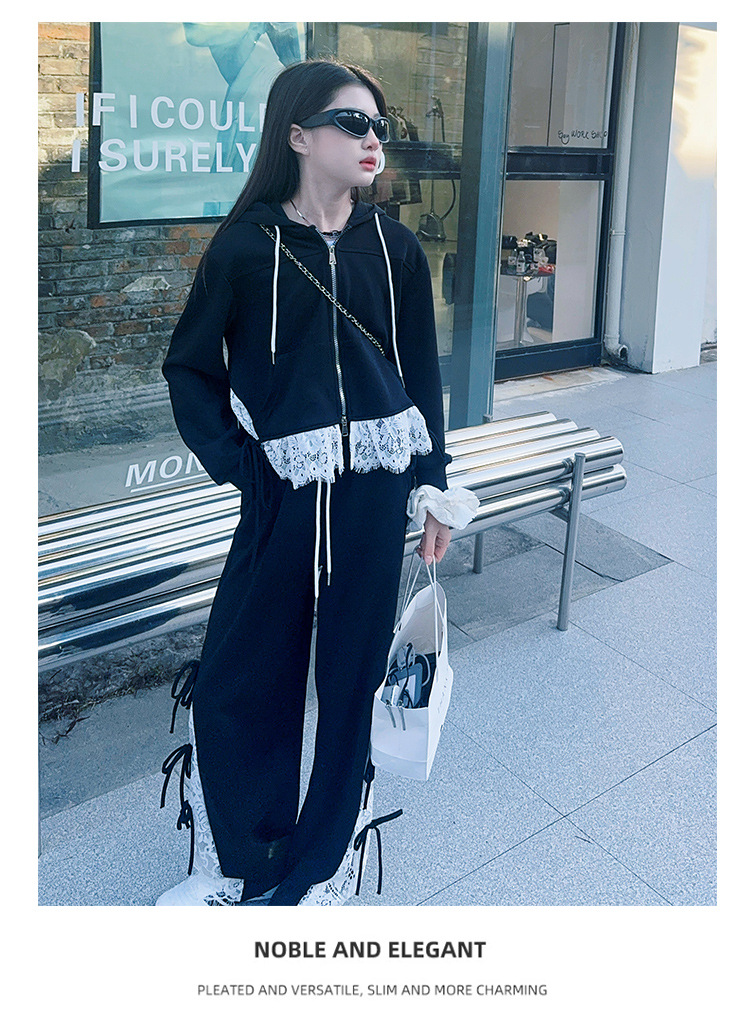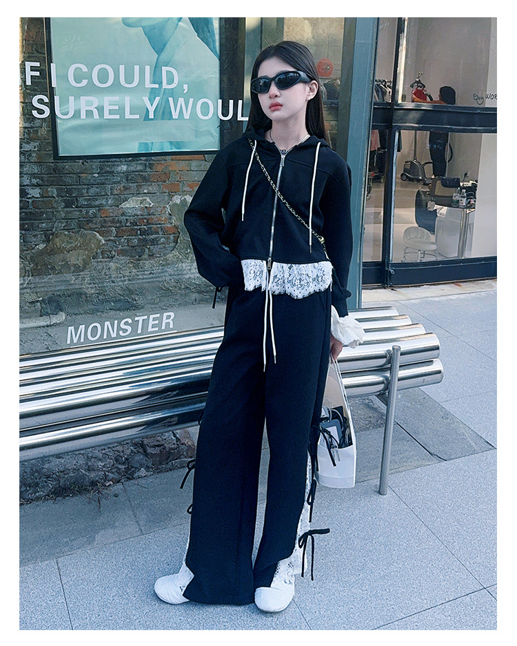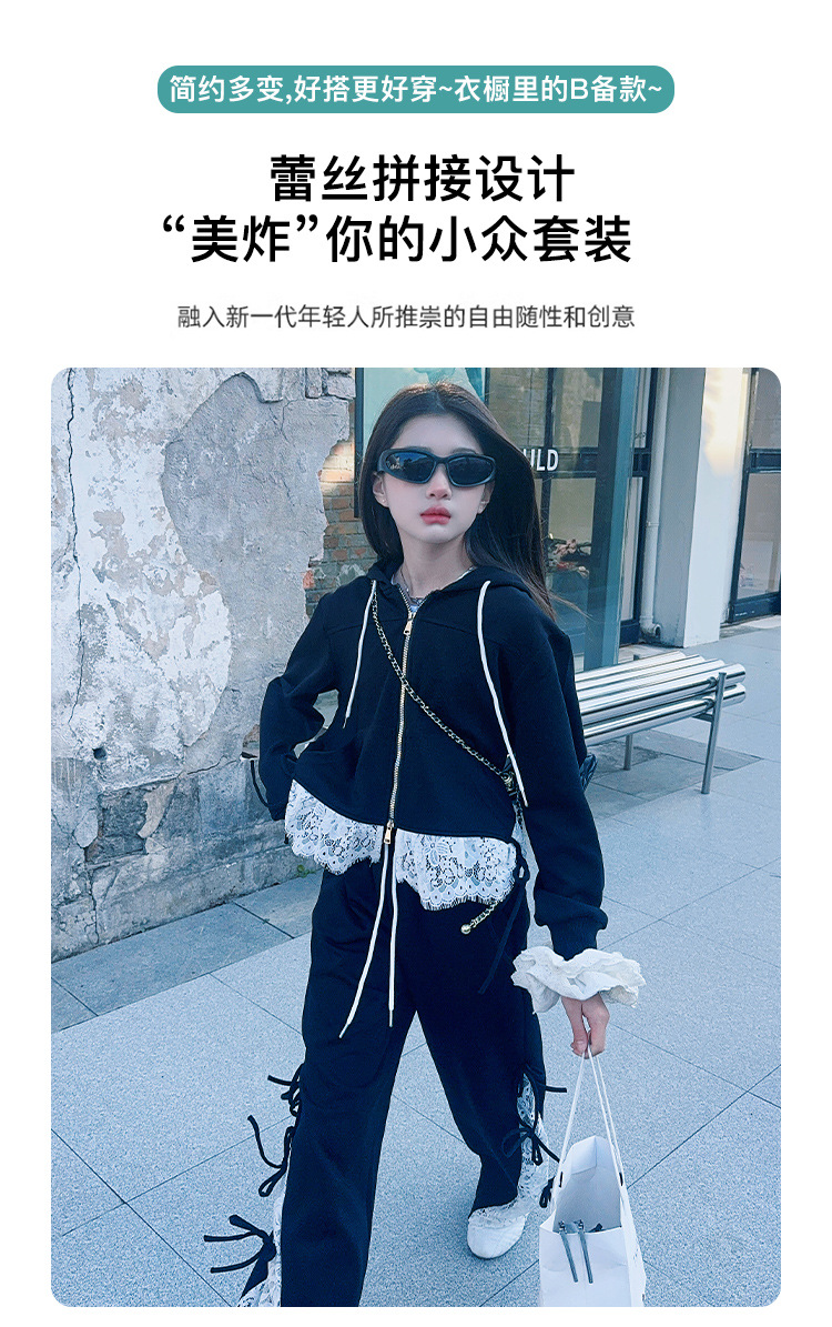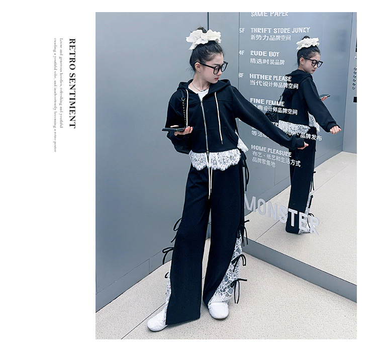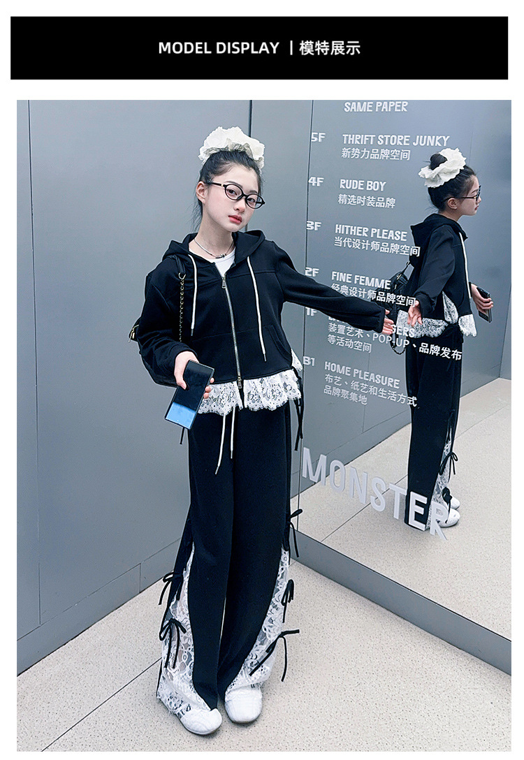 소녀 봄 세트 2025 새로운 소녀 봄 세련된 레이스 스티칭 니트 후드 스웨터 세트스토어 가기