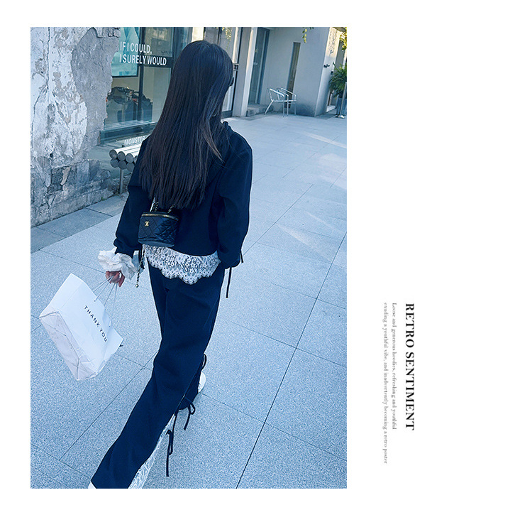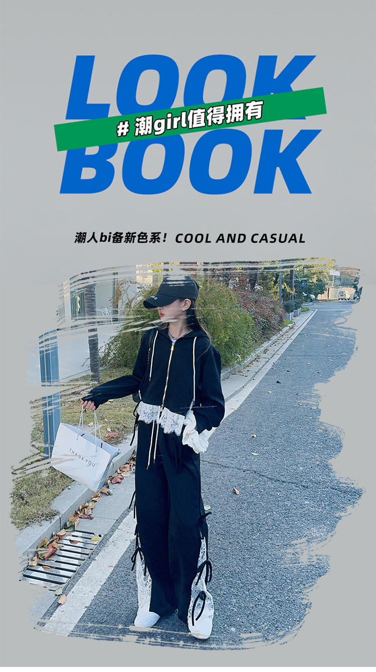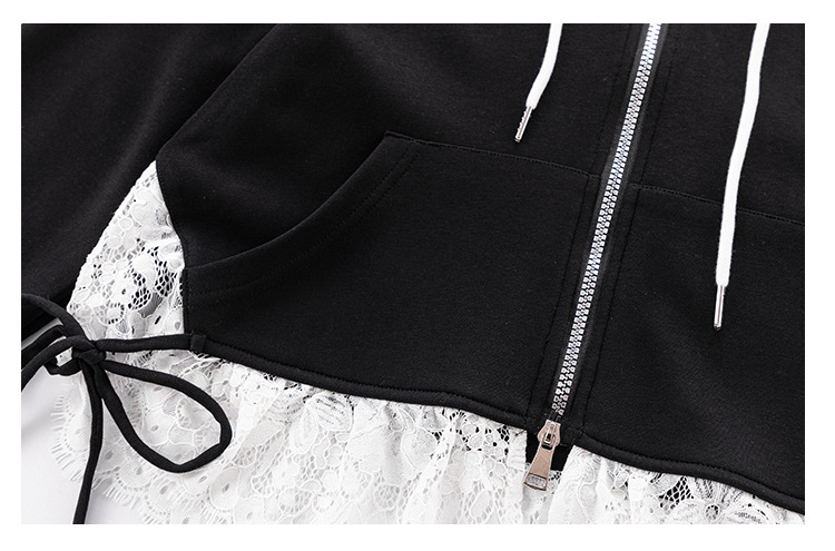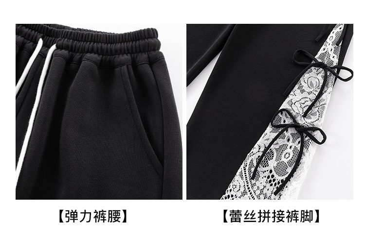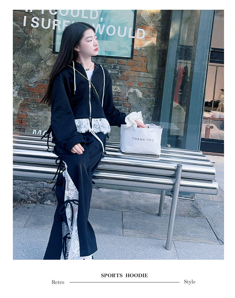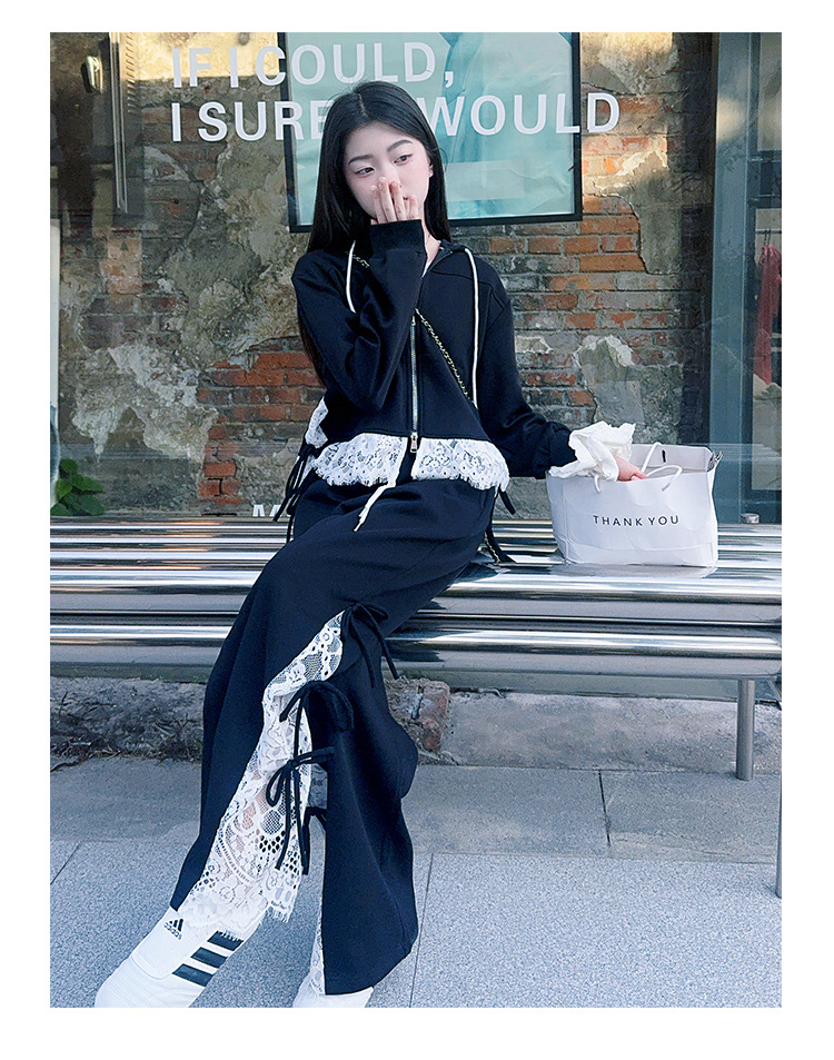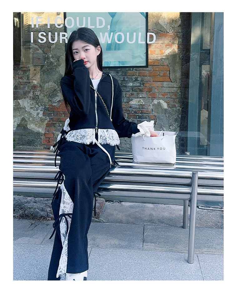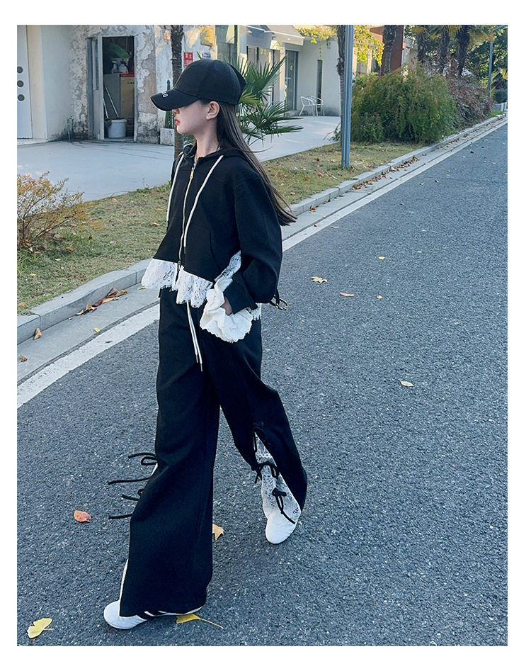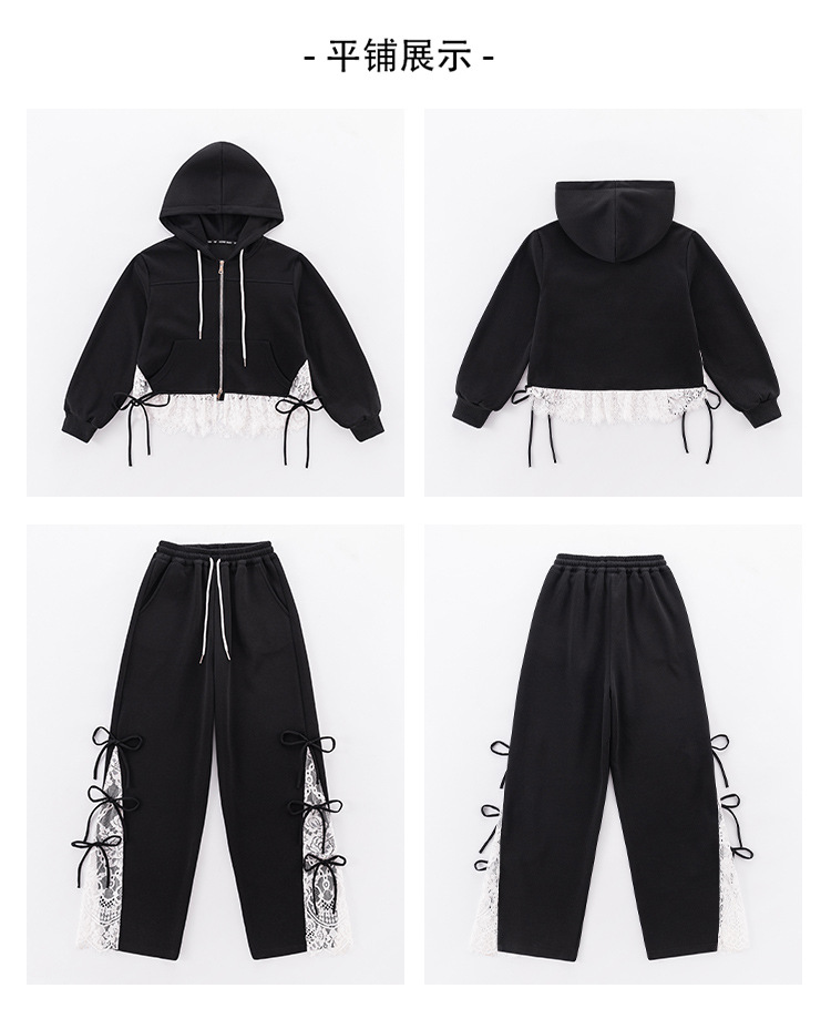 소녀 봄 세트 2025 새로운 소녀 봄 세련된 레이스 스티칭 니트 후드 스웨터 세트스토어 가기