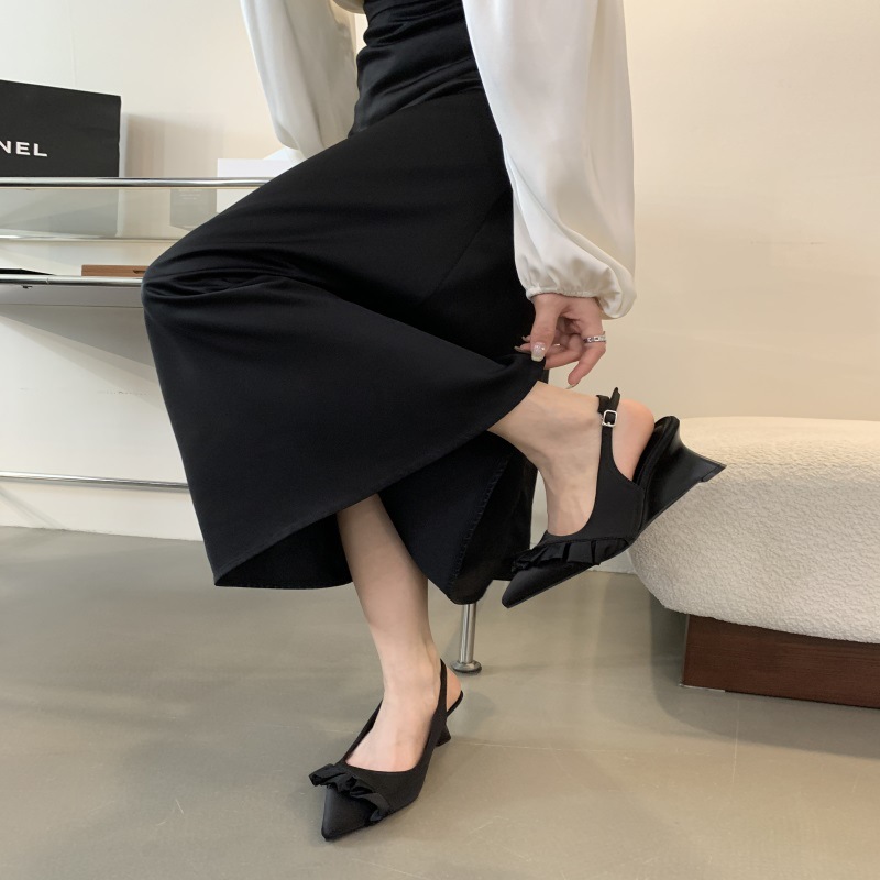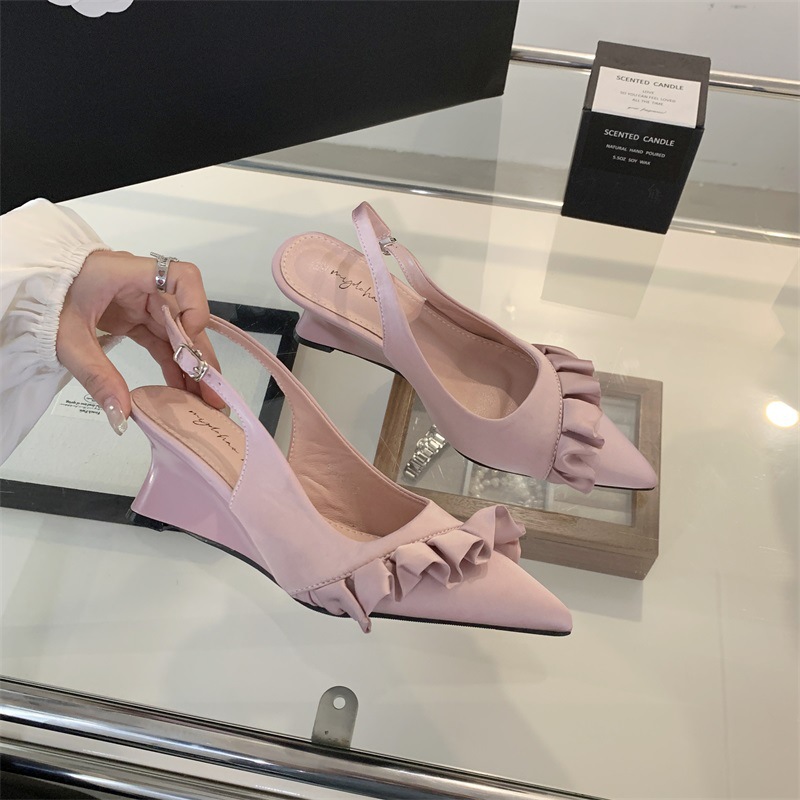 2025 새로운 달콤한 올 매치 리어 트립 얕은 입 싱글 신발 디자인 주름 꽃잎 유행 우아한 웨지 샌들
