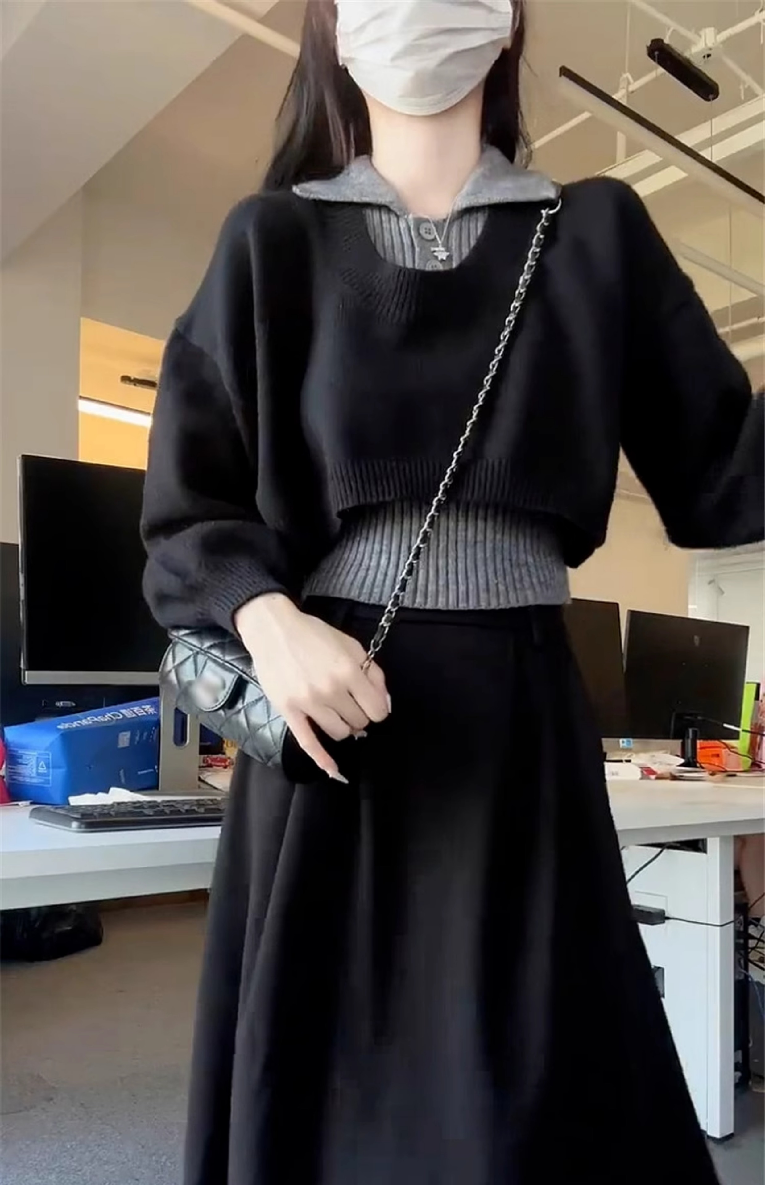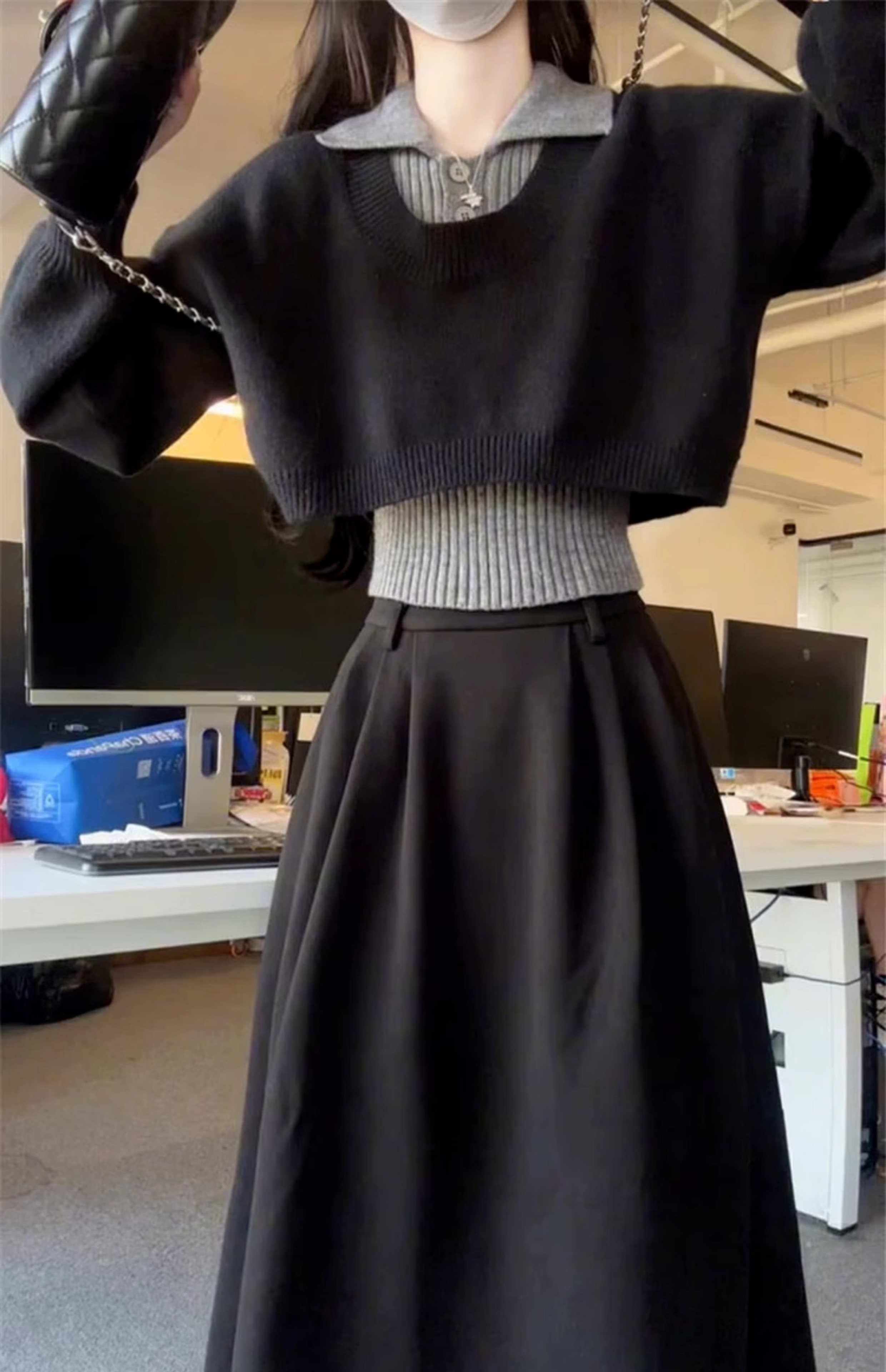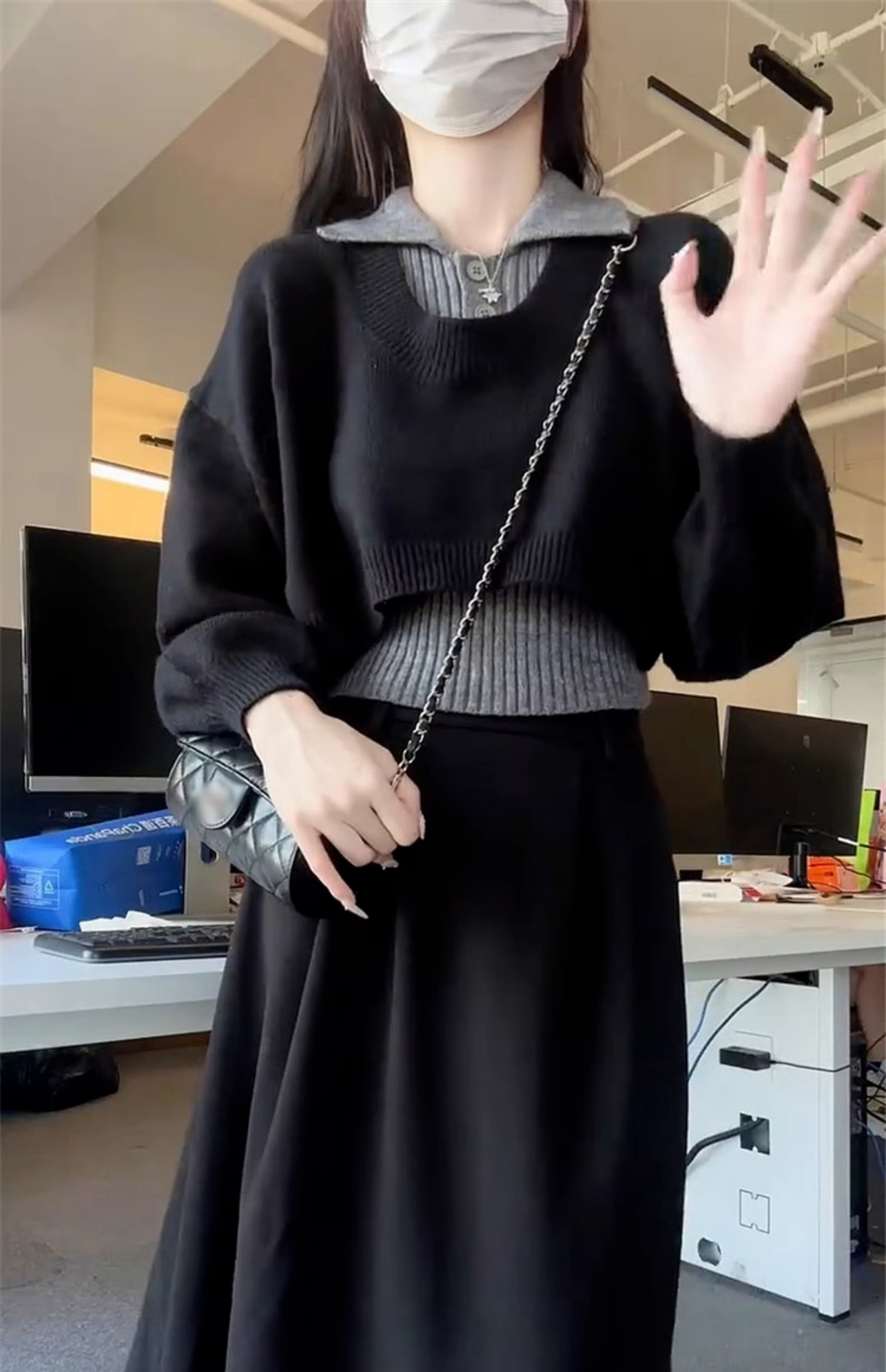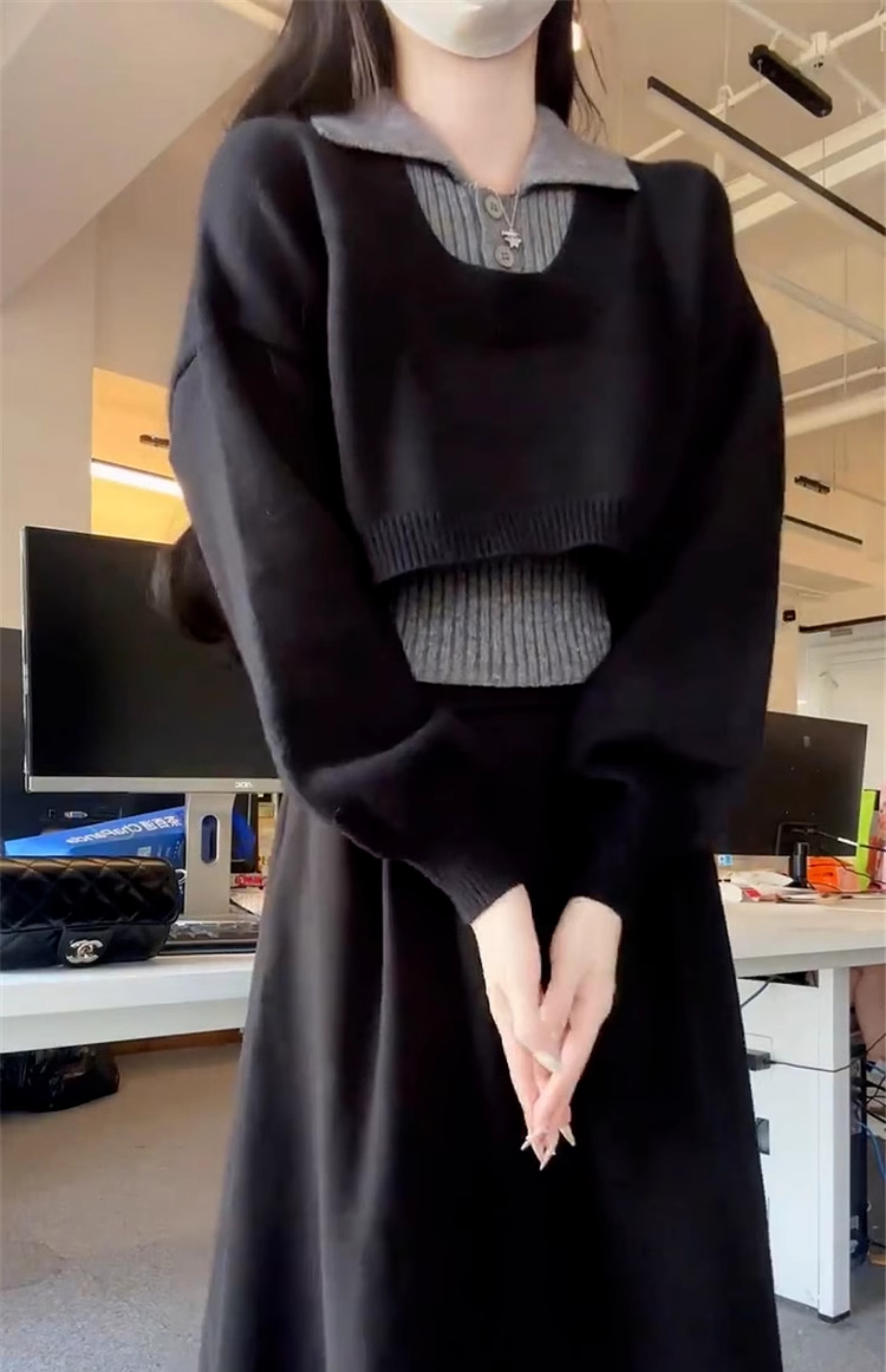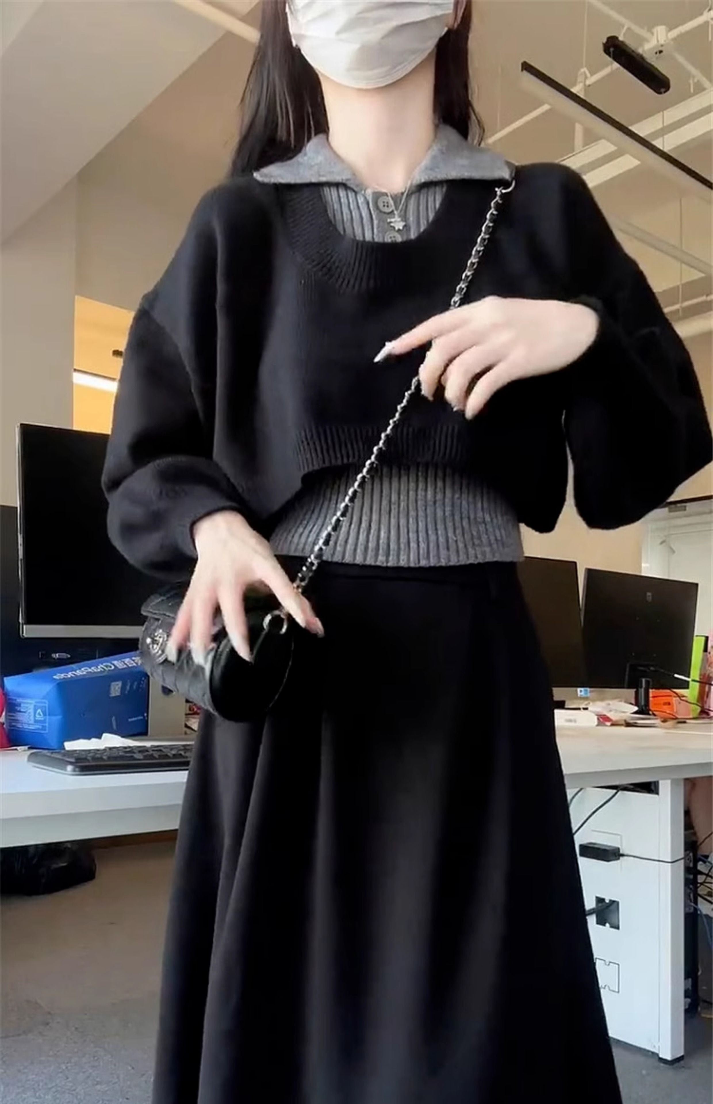 겨울은 작은 향기로운 검은 색 원피스 여성의 가을과 겨울 2024 새로운 투피스 세트 착용합니다.