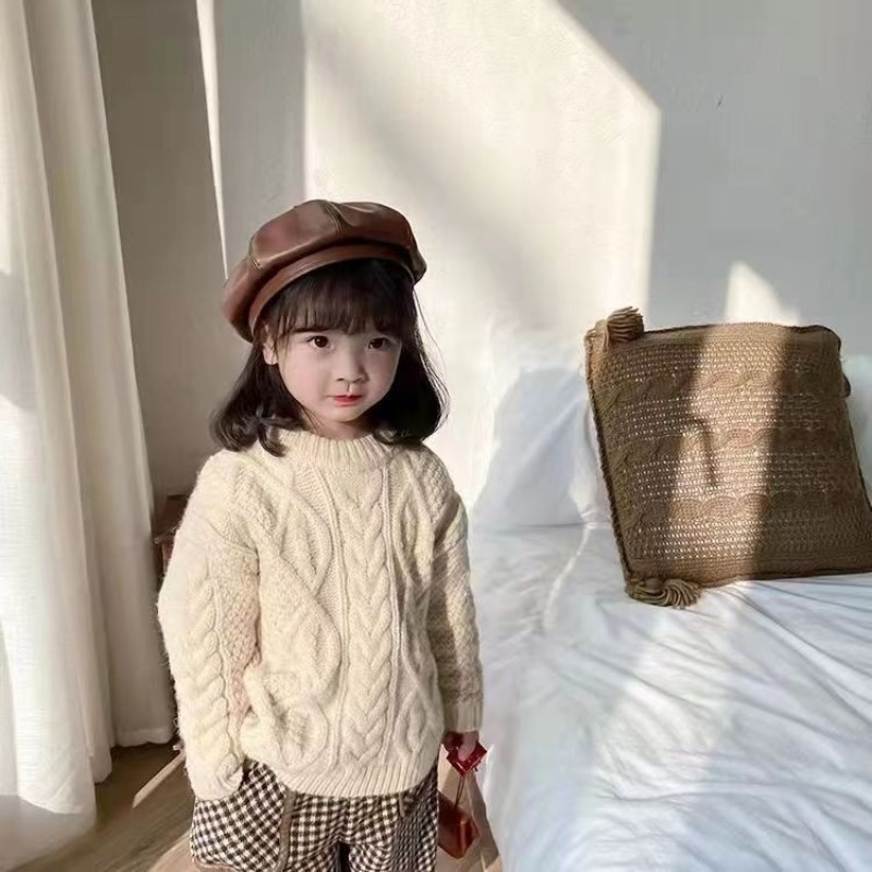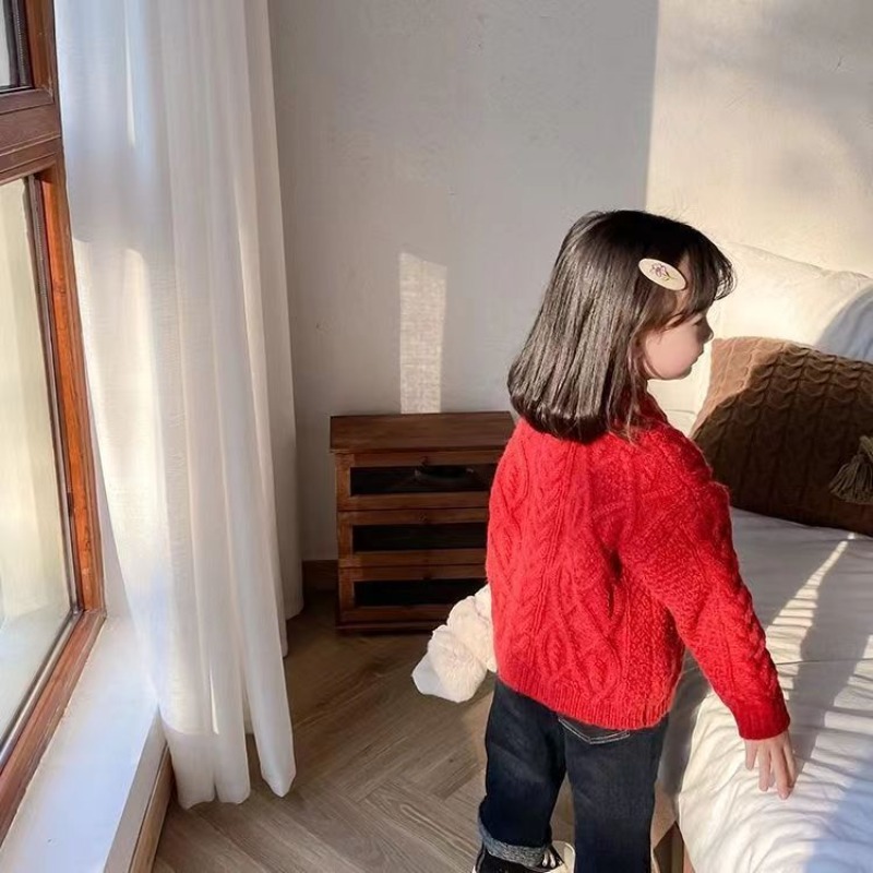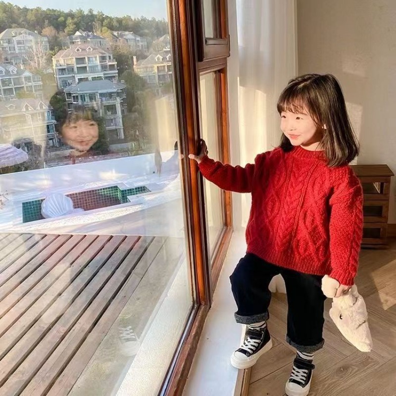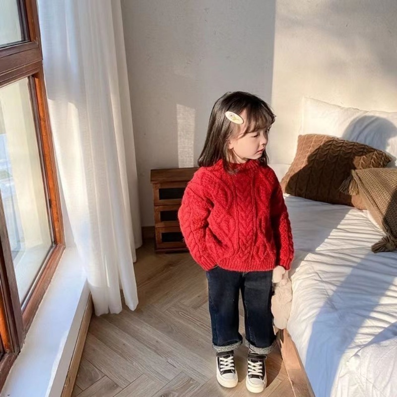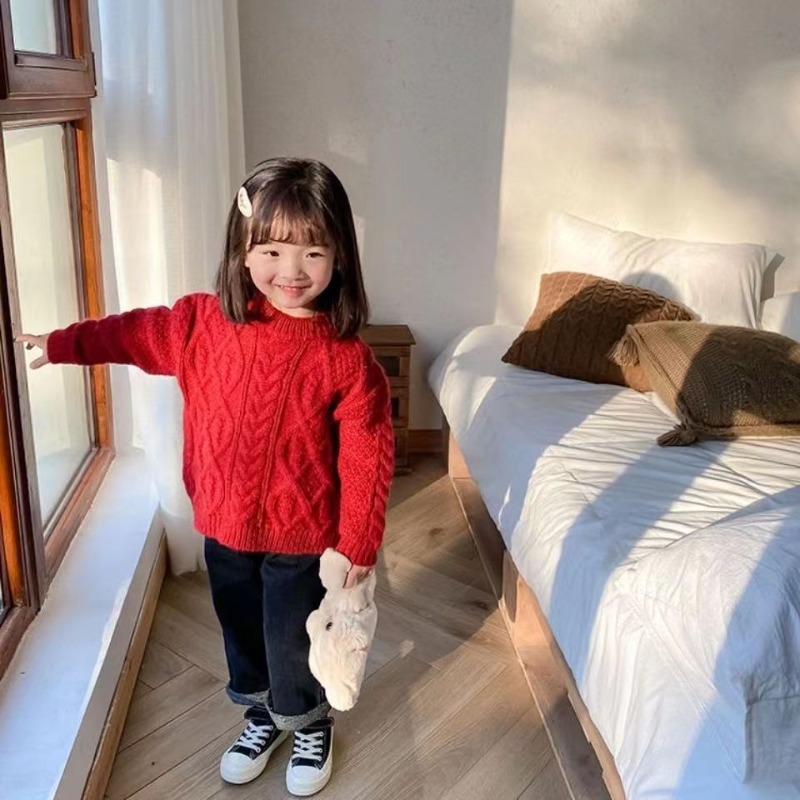 어린이 두꺼운 크루 넥 풀오버 레드 트위스트 스웨터 겨울 한국 스타일 소년과 소녀의 긴 소매 내부 니트 탑 트렌디