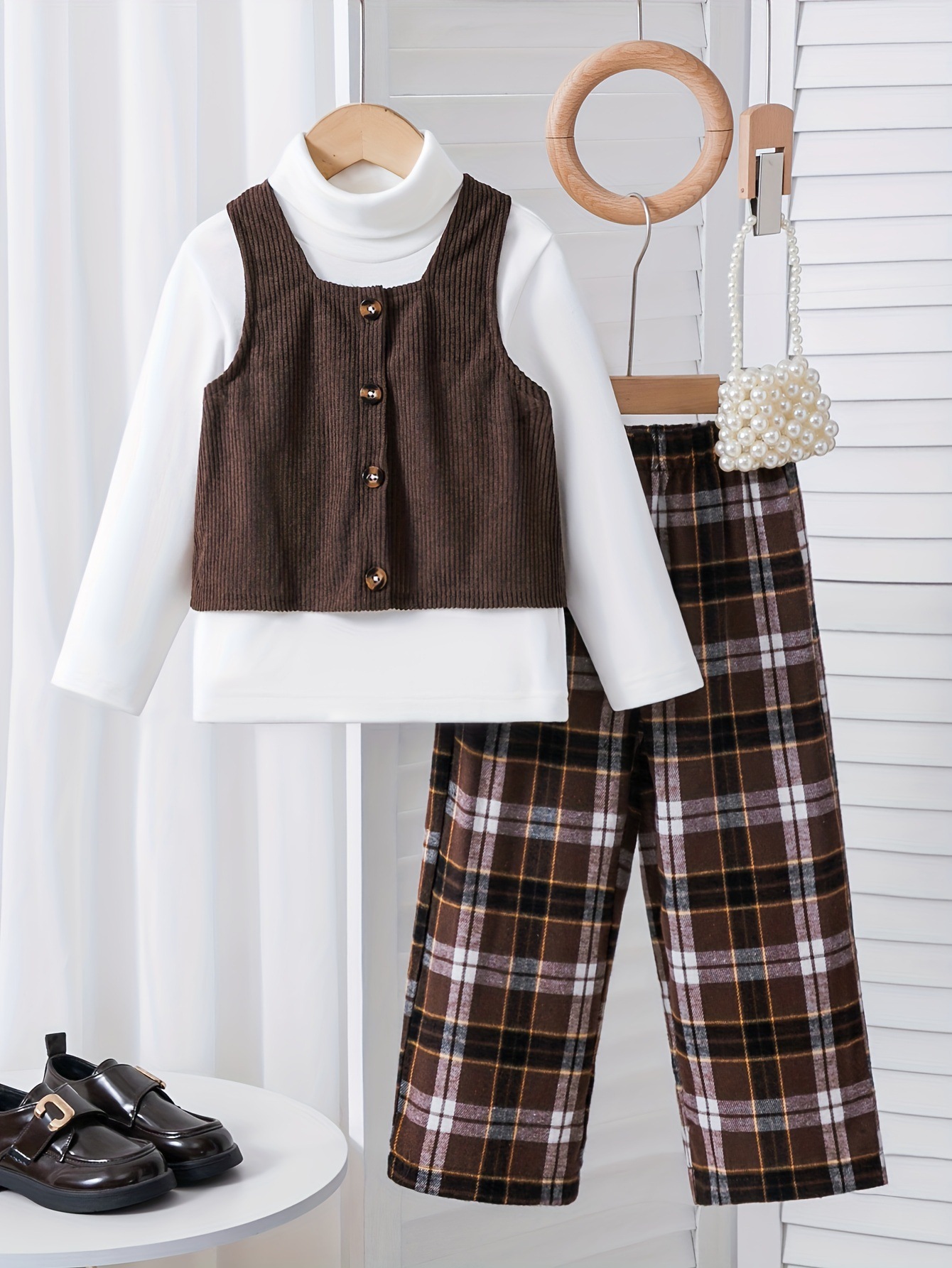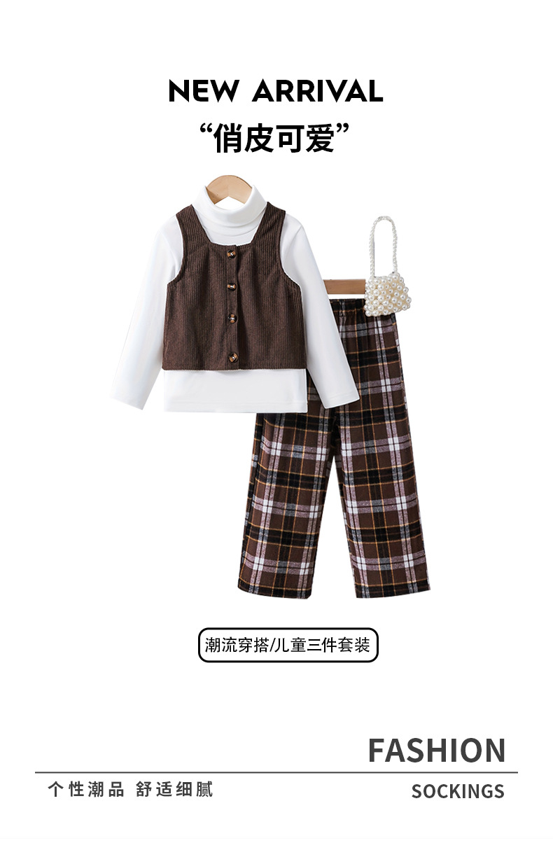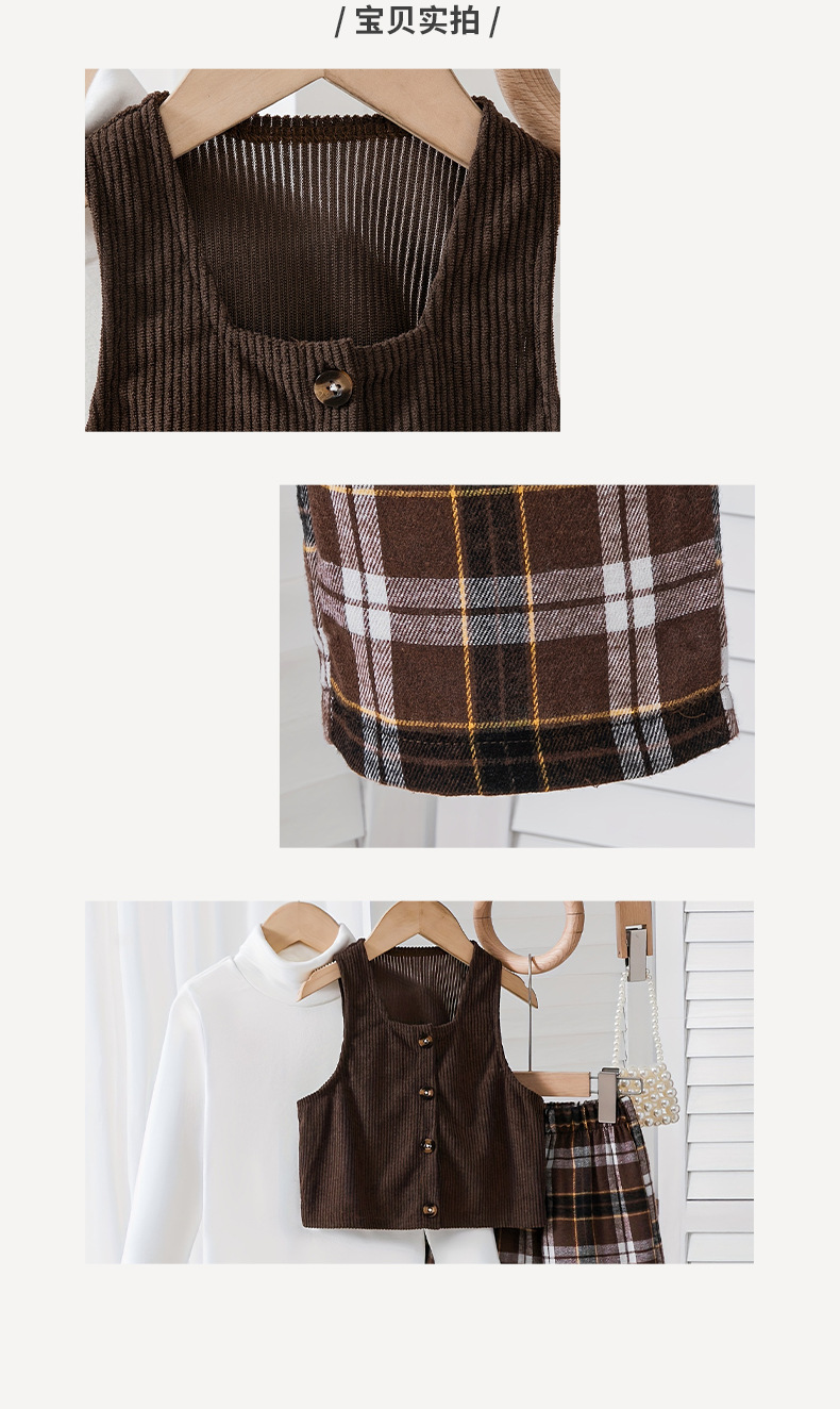 대외 무역 어린이 세트 다크 브라운 Corduroy 조끼 높은 칼라 보토밍 셔츠 격자 무늬 바지 여학생 영국식 3 피스 세트