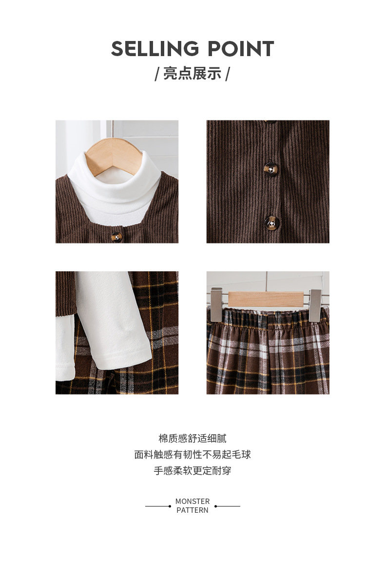 대외 무역 어린이 세트 다크 브라운 Corduroy 조끼 높은 칼라 보토밍 셔츠 격자 무늬 바지 여학생 영국식 3 피스 세트스토어 가기