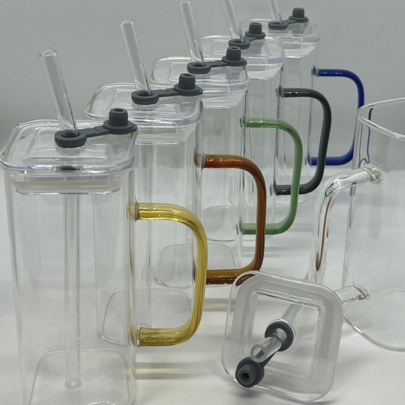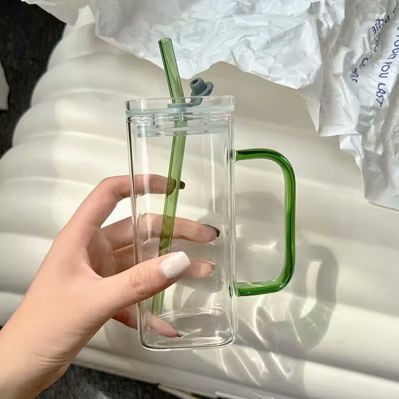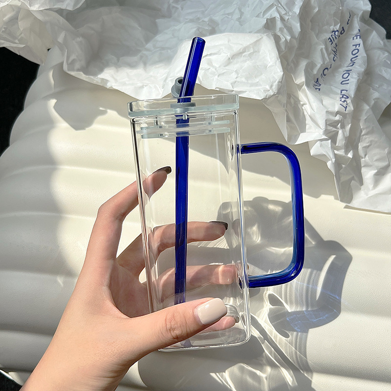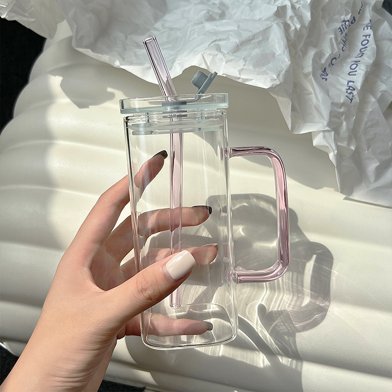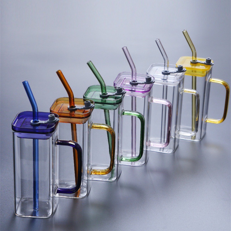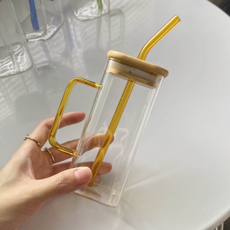 대나무 뚜껑이있는 손잡이가있는 사각형 유리 컵 높은 색상 값 작은 사각형 컵 밀짚 컵 뚜껑이있는 고온 내성 투명 컵