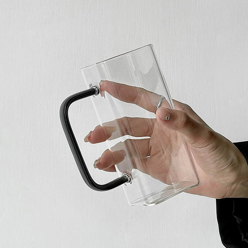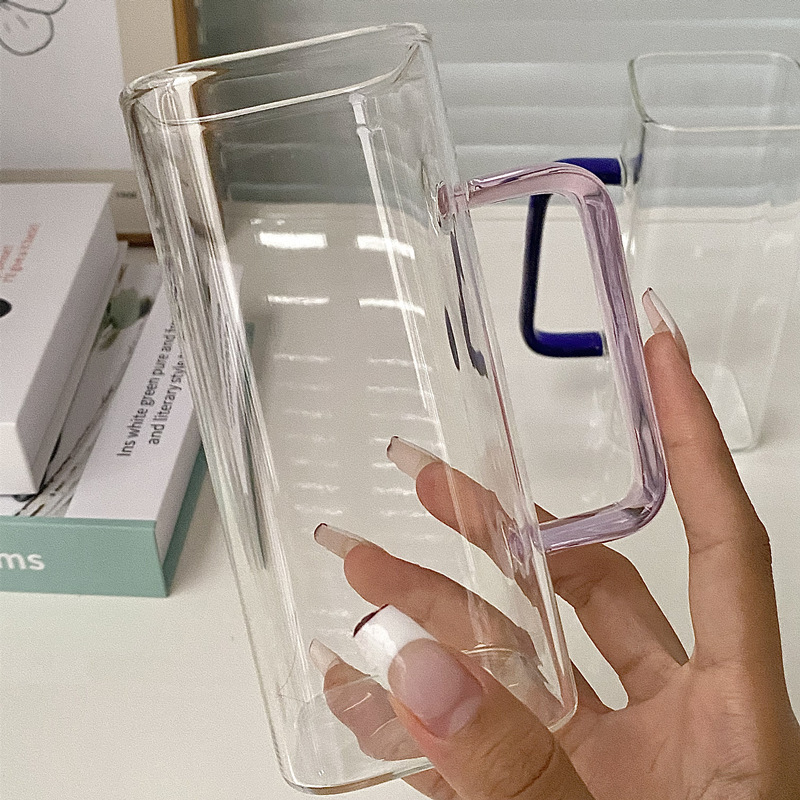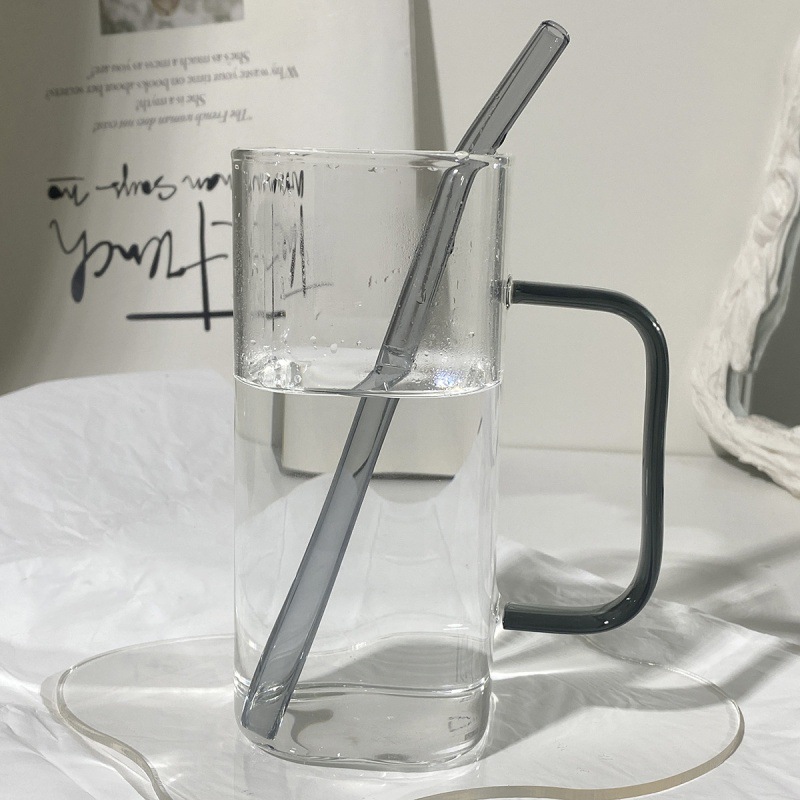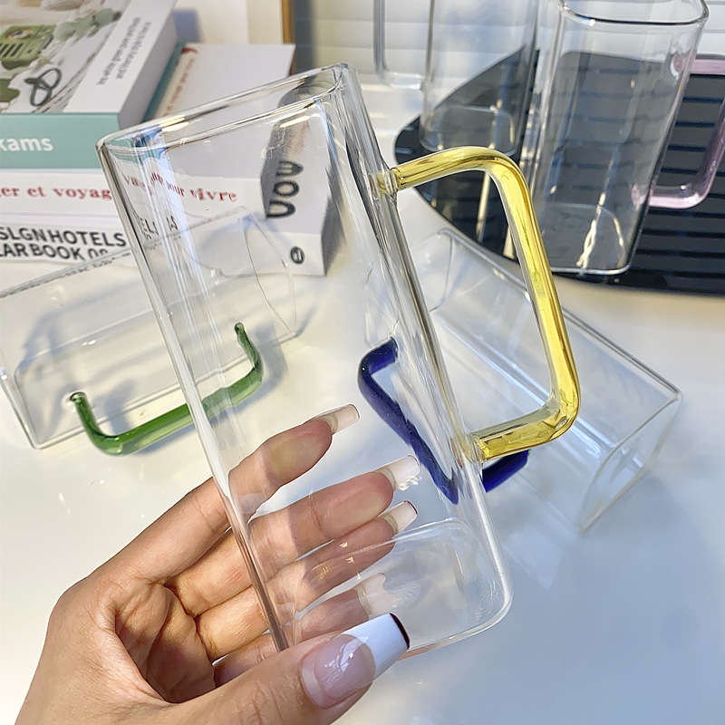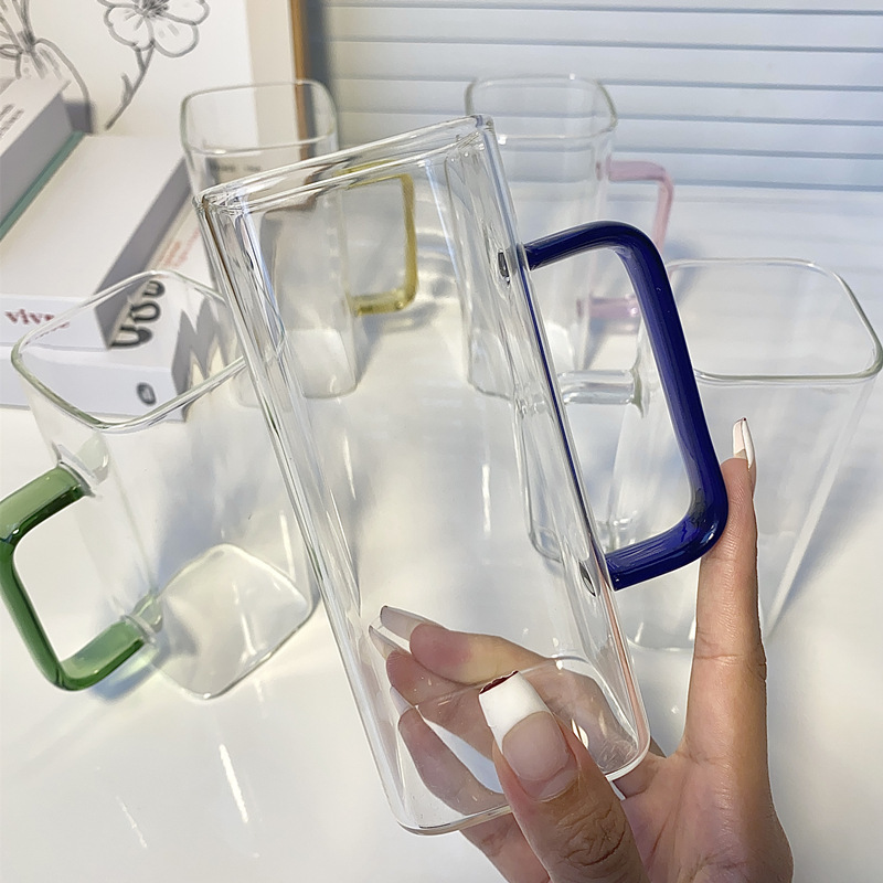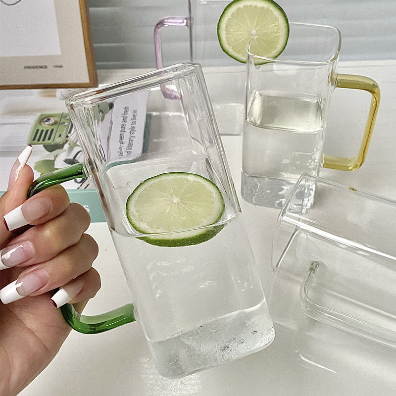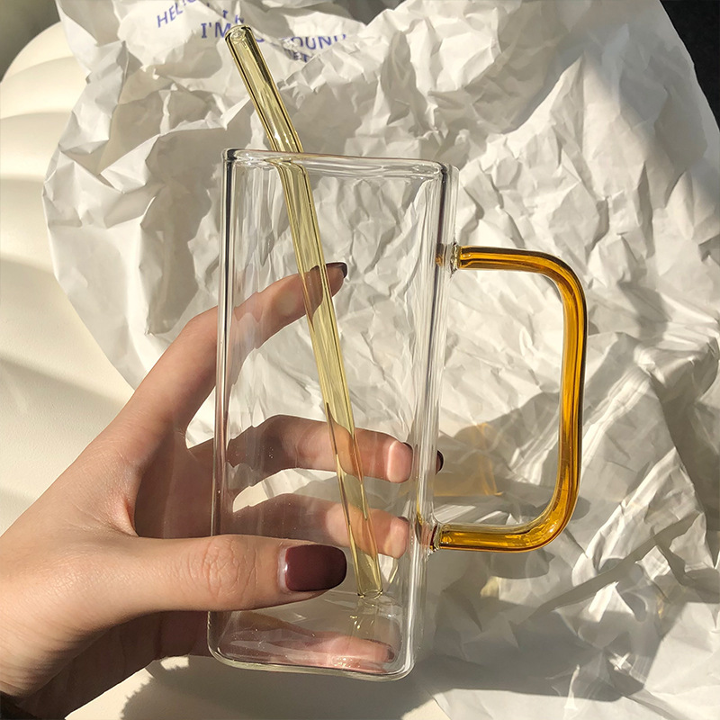 대나무 뚜껑이있는 손잡이가있는 사각형 유리 컵 높은 색상 값 작은 사각형 컵 밀짚 컵 뚜껑이있는 고온 내성 투명 컵