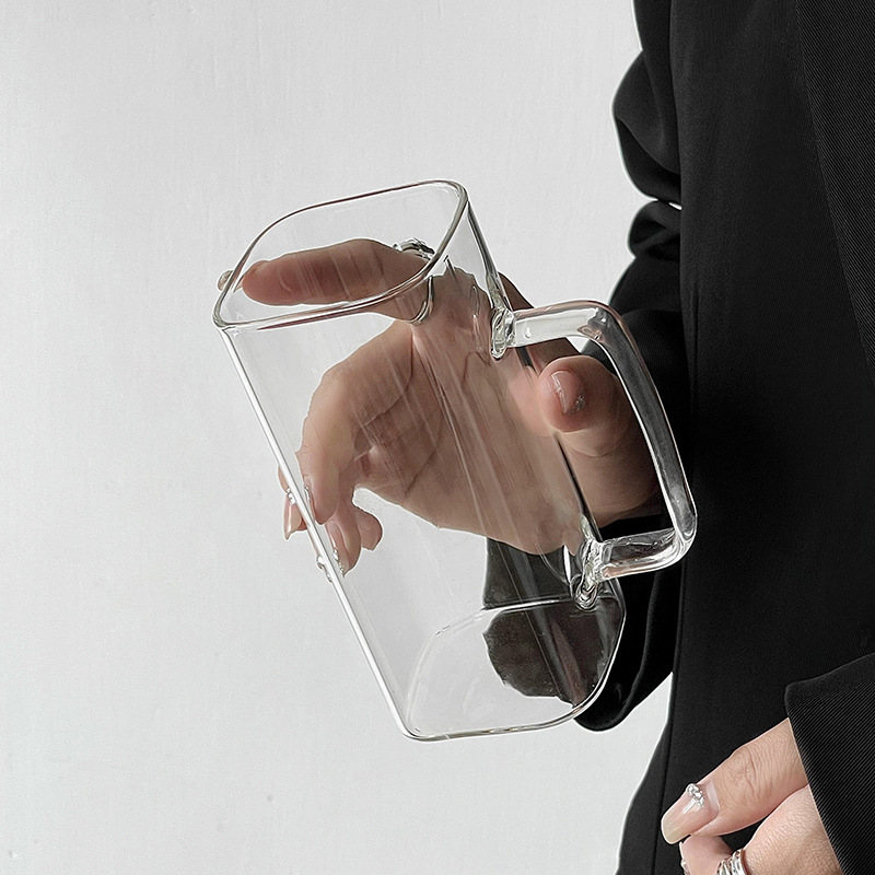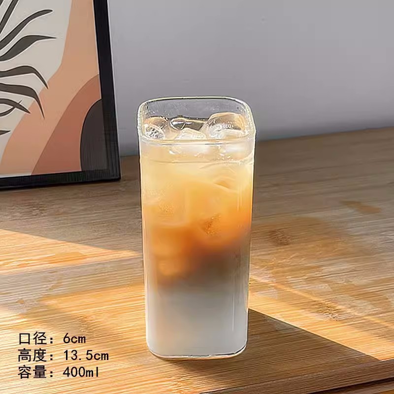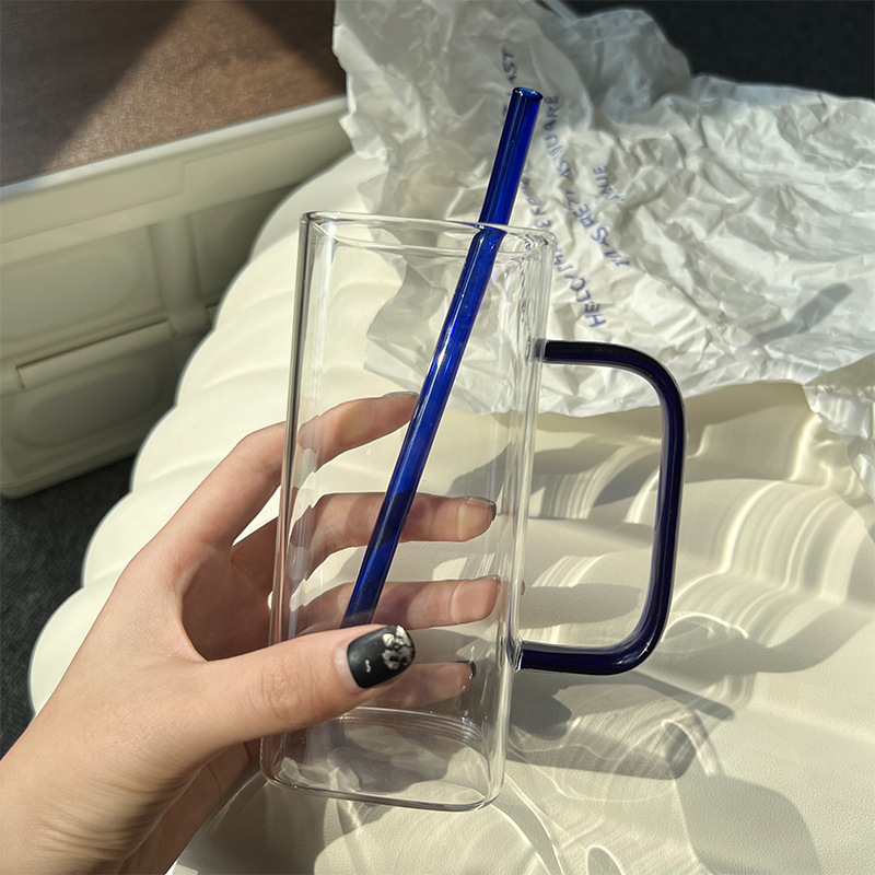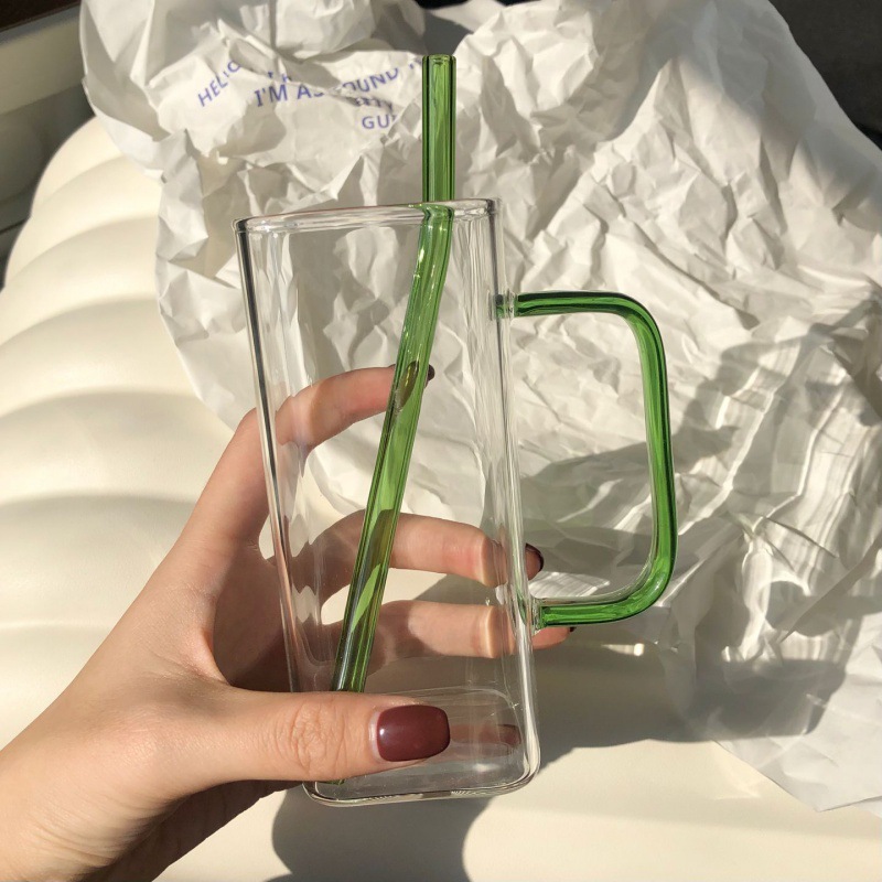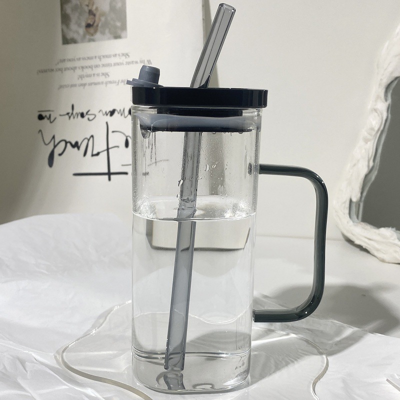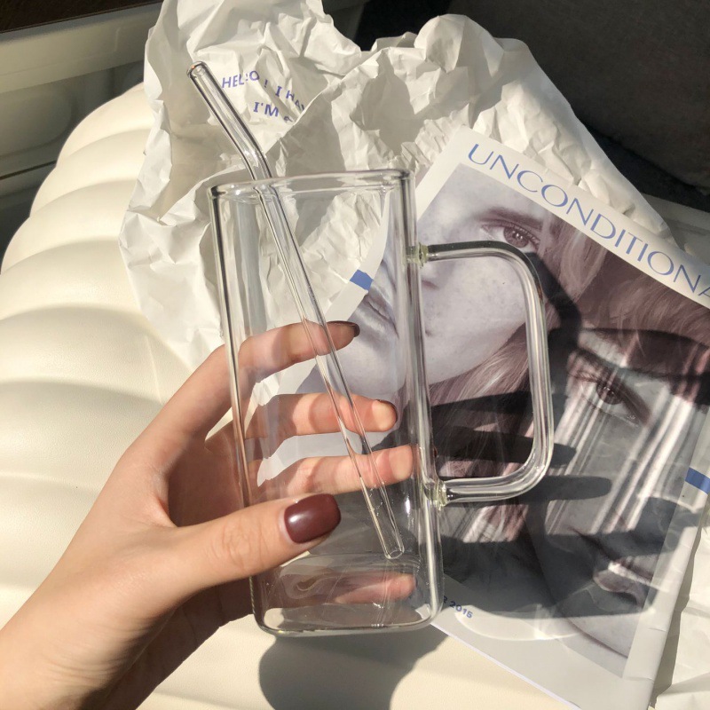 대나무 뚜껑이있는 손잡이가있는 사각형 유리 컵 높은 색상 값 작은 사각형 컵 밀짚 컵 뚜껑이있는 고온 내성 투명 컵스토어 가기