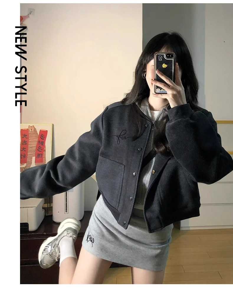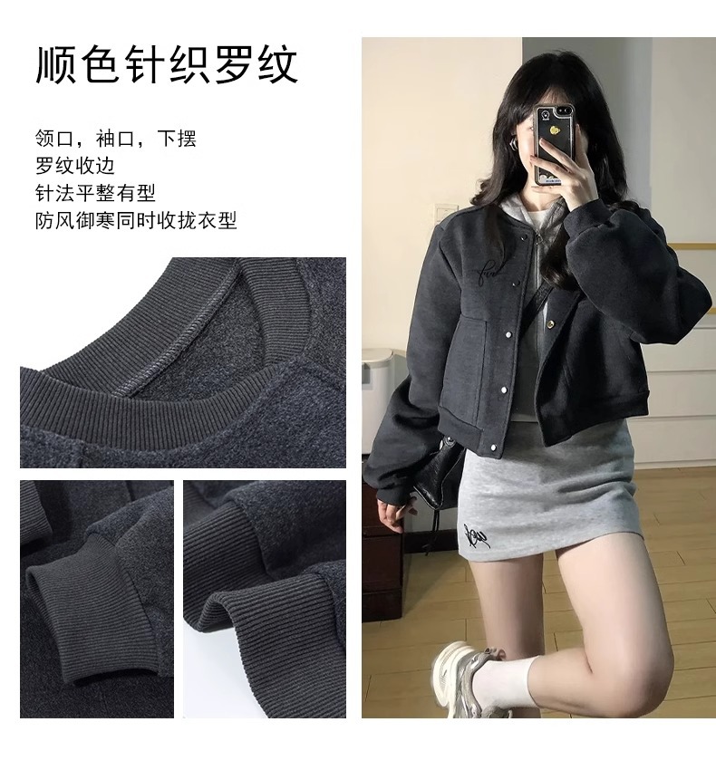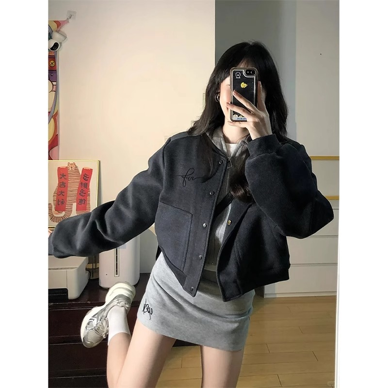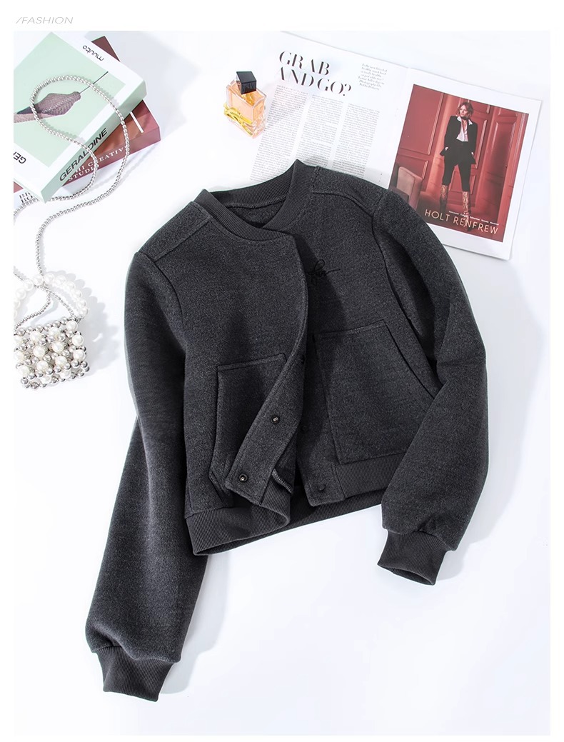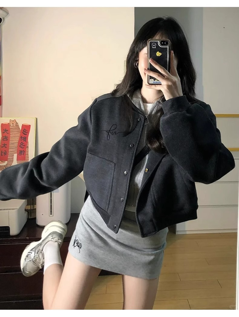 봄과 가을 여성용 회색 짧은 야구 재킷, 버튼 스타일 플러스 벨벳 두꺼운 어깨 재킷, 작은 모직 스웨트 셔츠스토어 가기