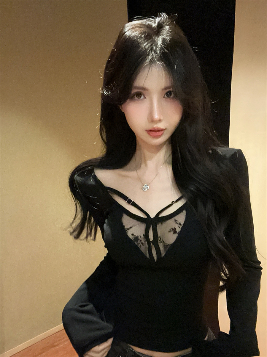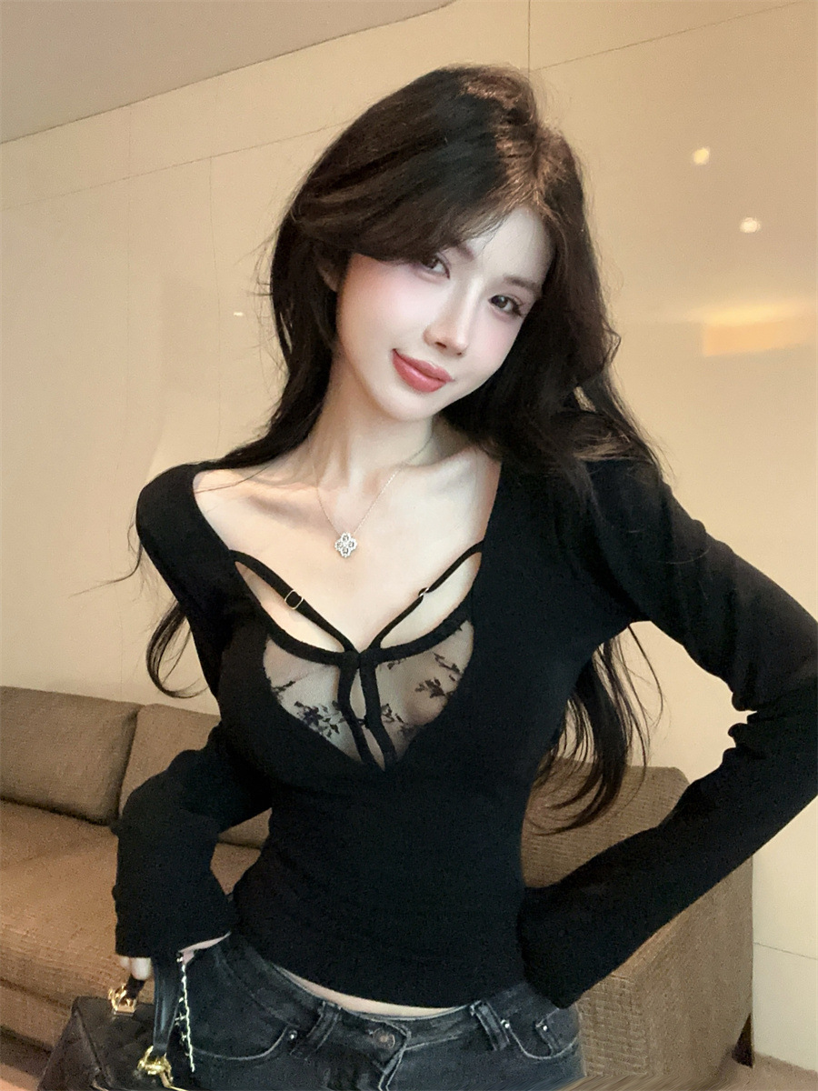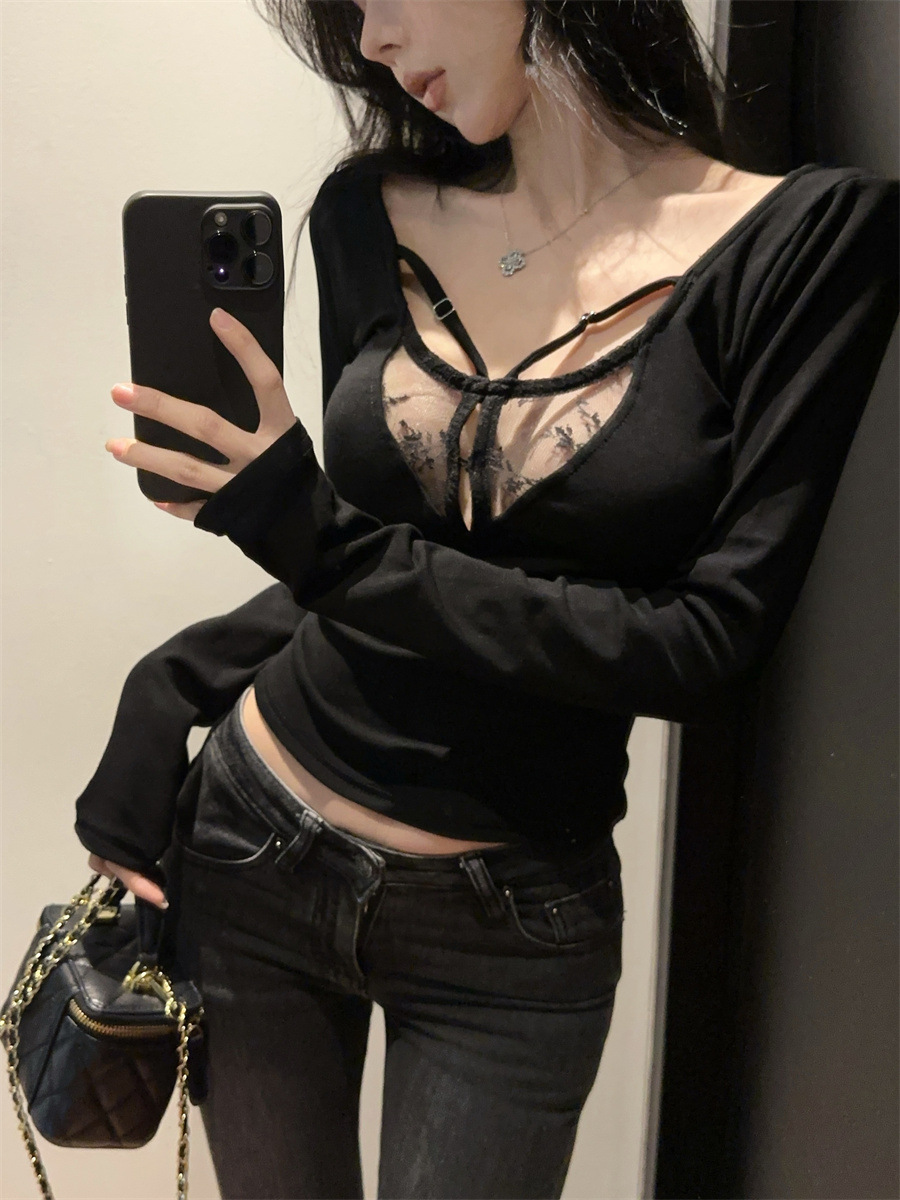 순수한 욕망 스타일 섹시한 할로우 레이스 메쉬 바느질 긴 소매 티셔츠 여성의 봄 세련된 스파이스 소녀 블랙 패션 탑