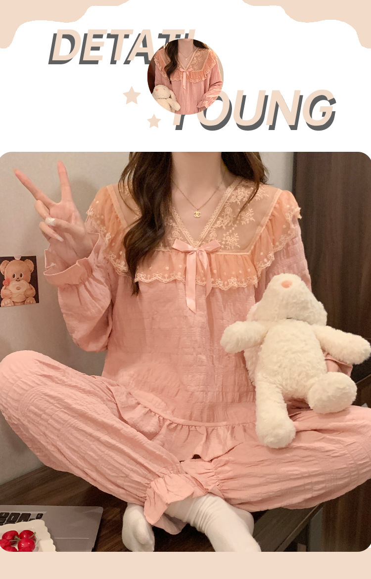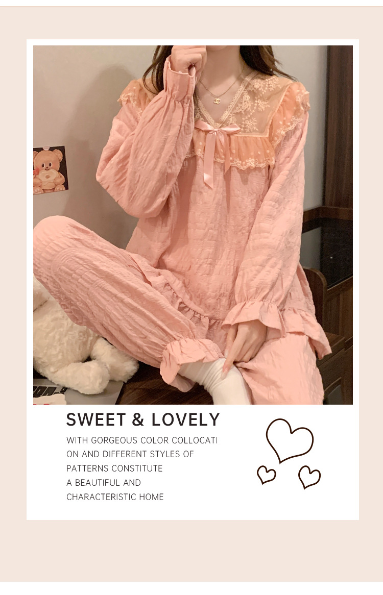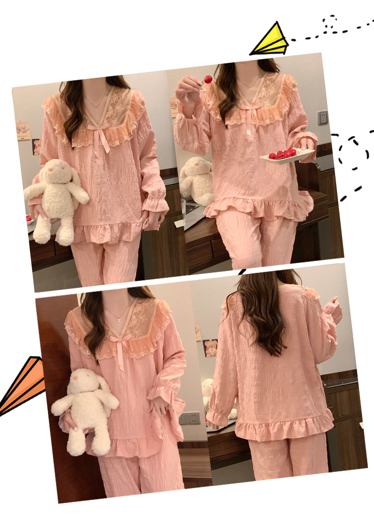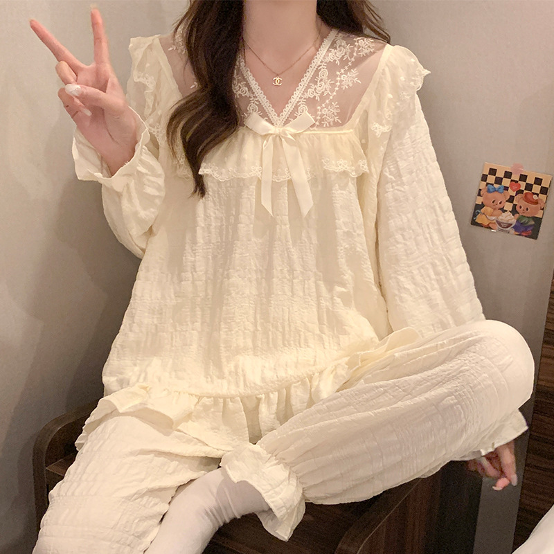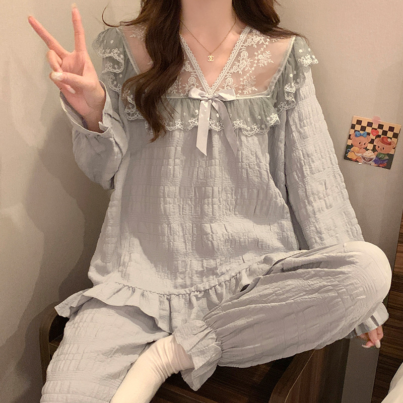 국경 간 파자마 여성 봄과 가을 새로운 긴팔 얇은 한국 스타일 레이스 레이스 간단한 캐주얼 여성 홈 의류 세트