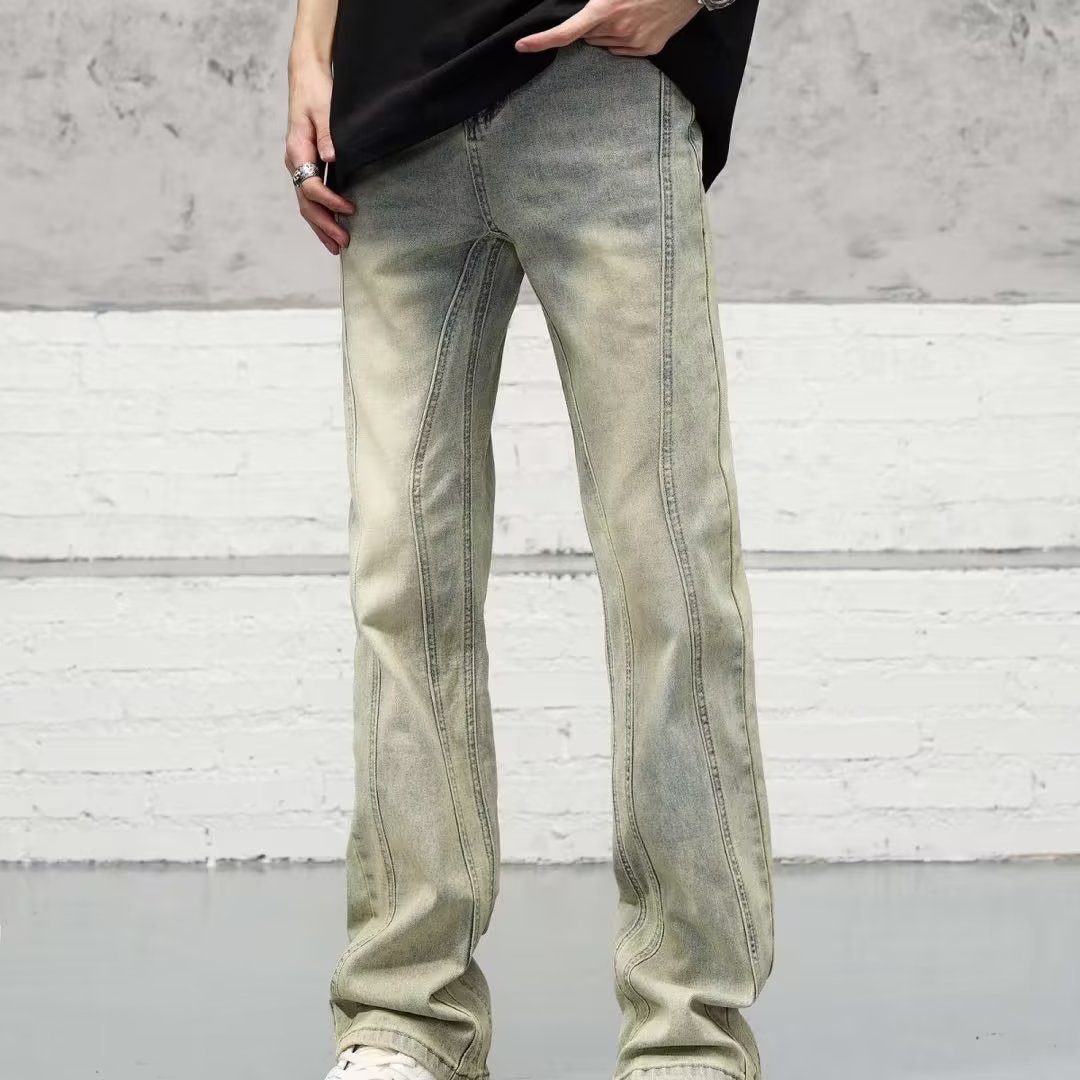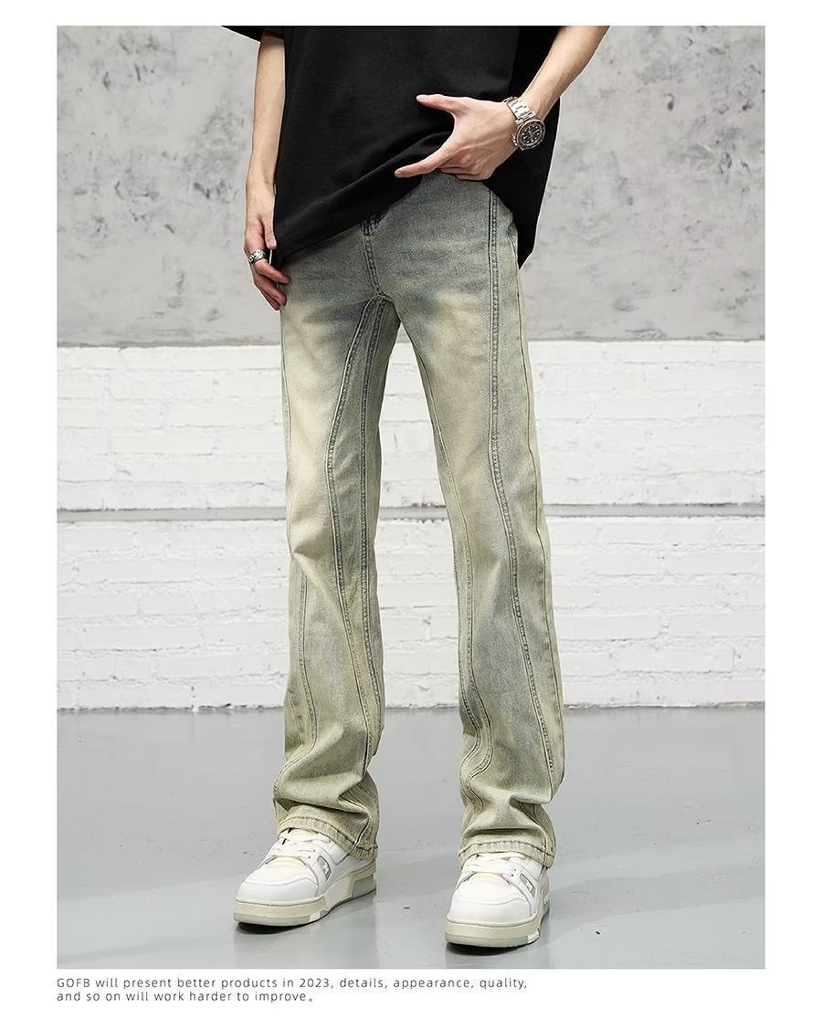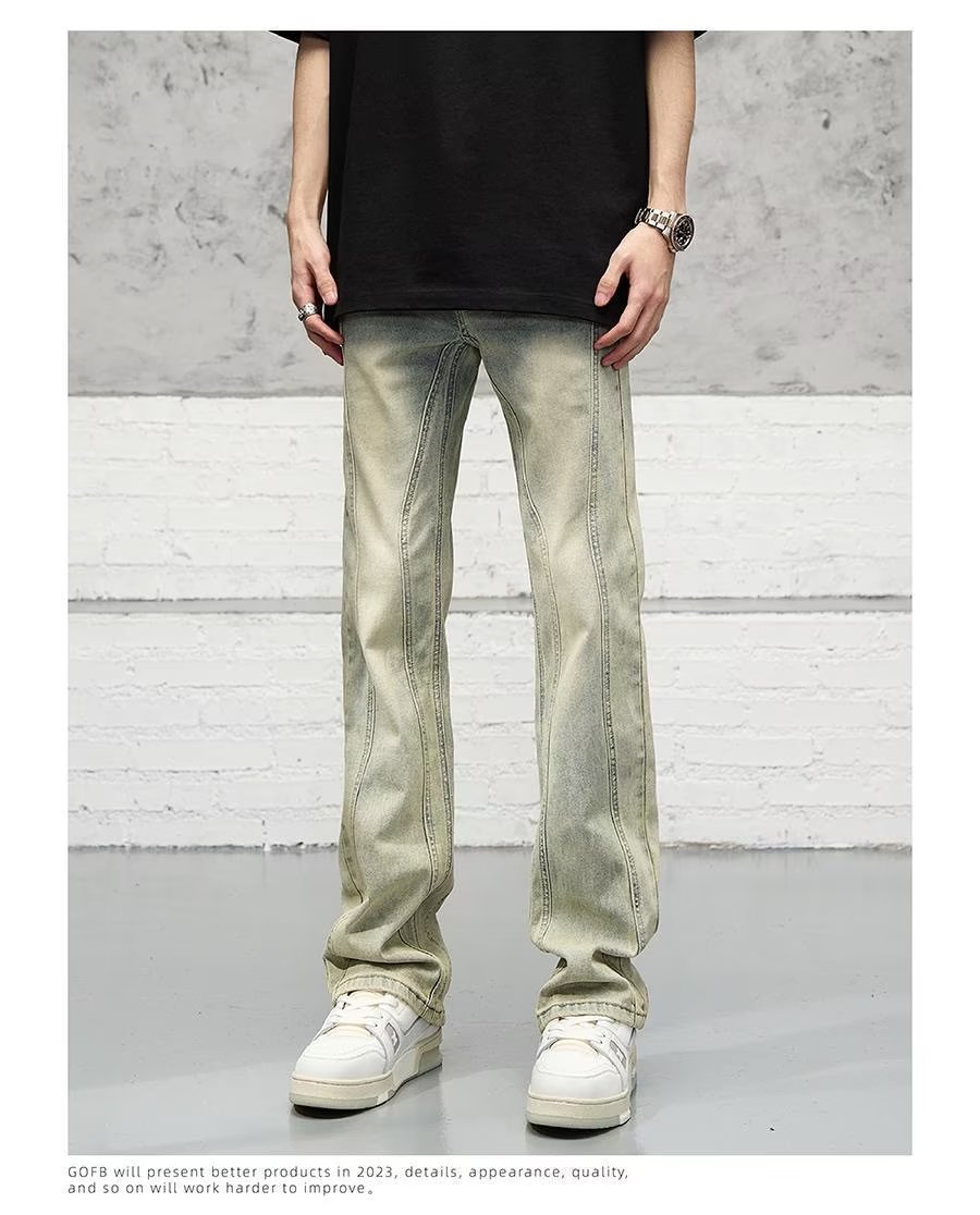 미국식 하이 스트리트 세척 오래된 노란색 진흙 염색 청바지 남성용 트렌디 한 바지 스트레이트 레그 마이크로 슬리밍 스택 바지