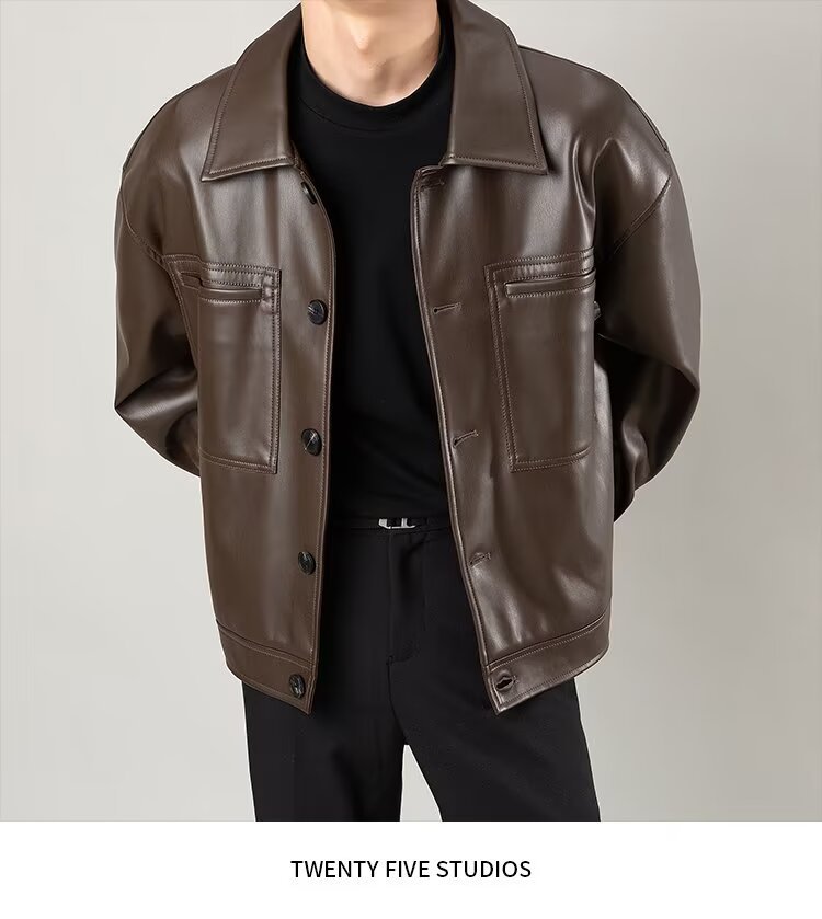 가벼운 성숙한 스타일 가죽 자켓 남자의 가을 유행 복고풍 느슨한 자전거 자켓 트렌디 한 브랜드 Plutton 잘 생긴 올매치 짧은 가죽 자켓스토어 가기