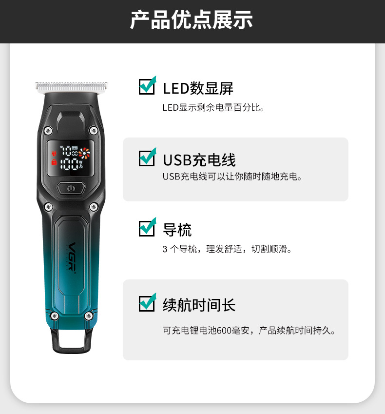 VGR964 국경 전기 헤어 클리퍼 그라디언트 컬러 오일 헤드 조각 충전식 남성 디지털 디스플레이 전기 클리퍼스토어 가기