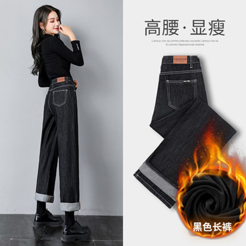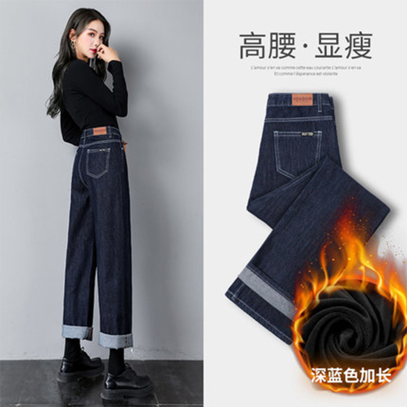 스트레이트 레그 기모 청바지 여성용 스트레치 와이드 레그 팬츠 하이 룩 루즈 올매치 트렌디 트렌디 트렌디 트렌디 타이트 룩 슬리밍 미터 감각
