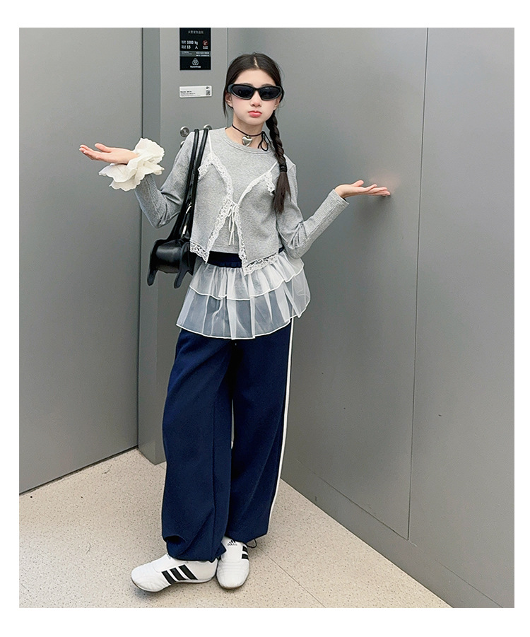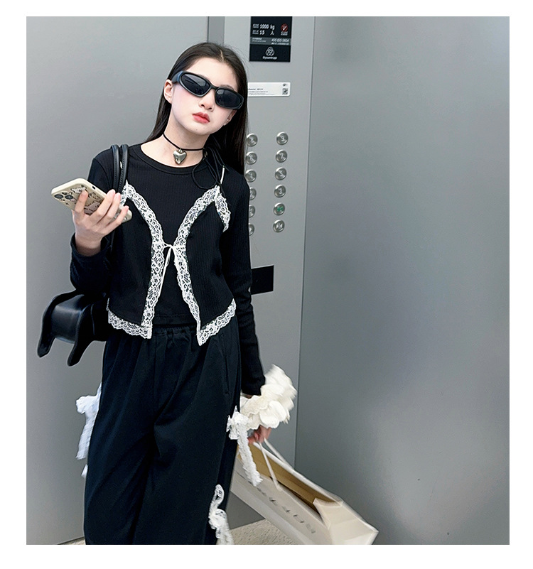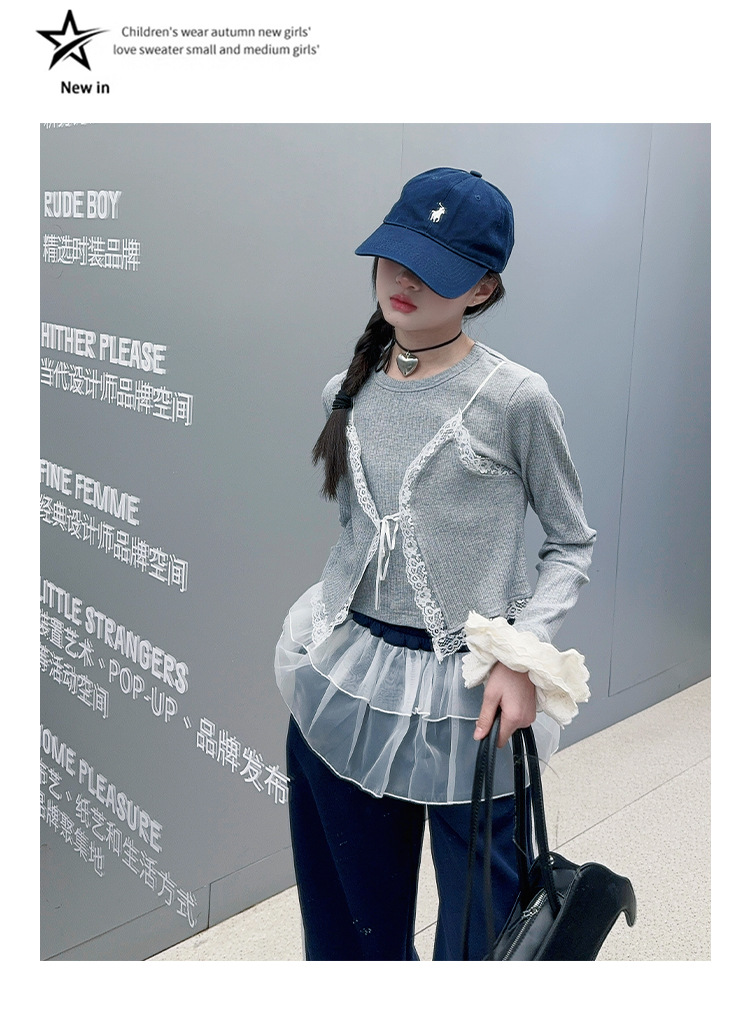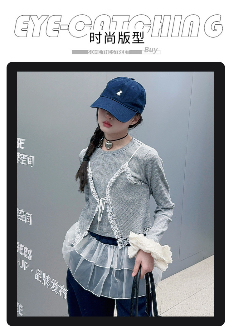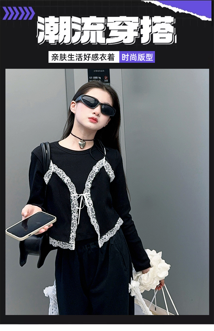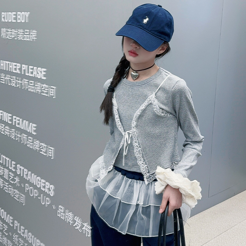 소녀 2025 봄과 가을 한국 스타일 레트로 서양식 작은 셔츠 바느질 레이스 가장자리 작은 슬링 티셔츠 가짜 투피스 탑 트렌디