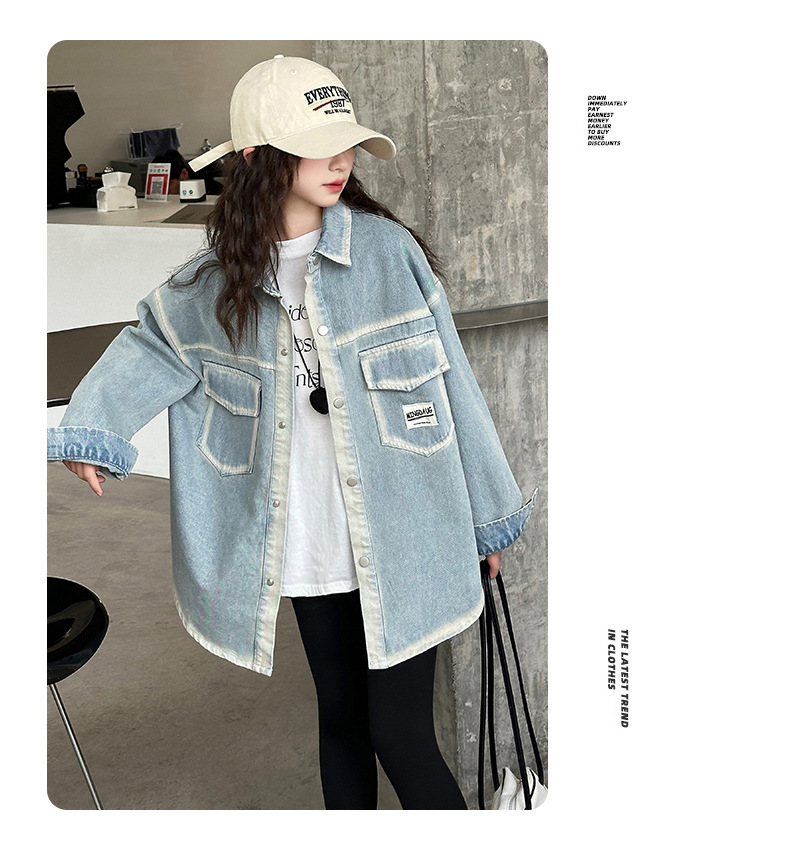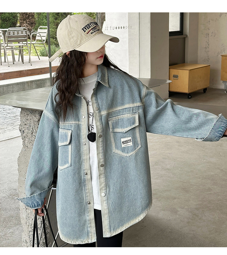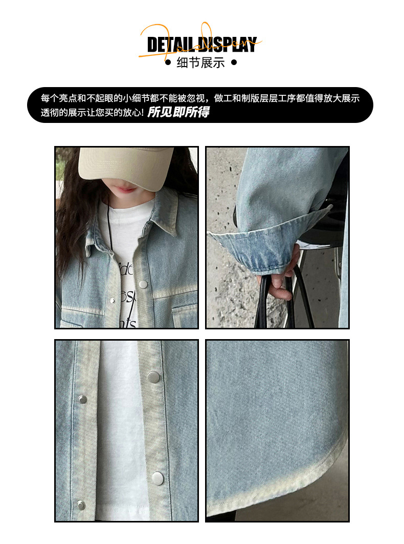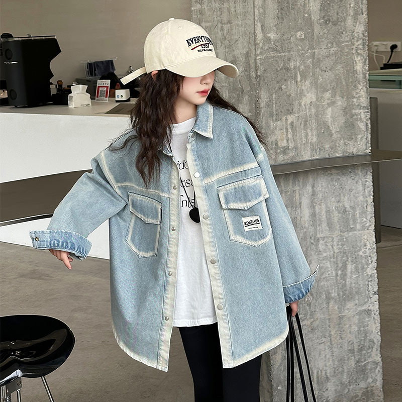 소녀의 봄 2025 새로운 디자인 감각 느슨한 중간 길이 스티칭 데님 코트 공예 데님 셔츠스토어 가기