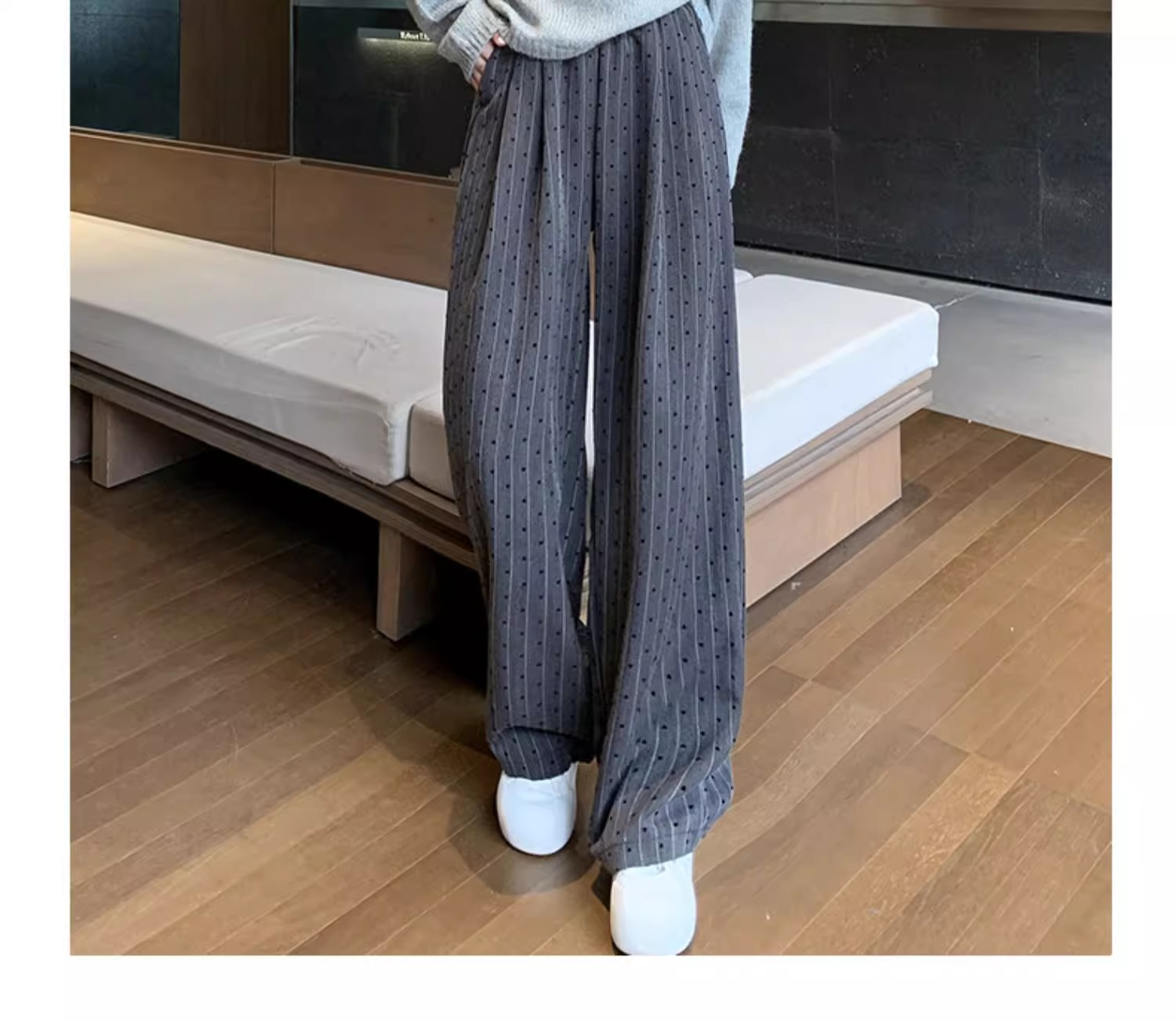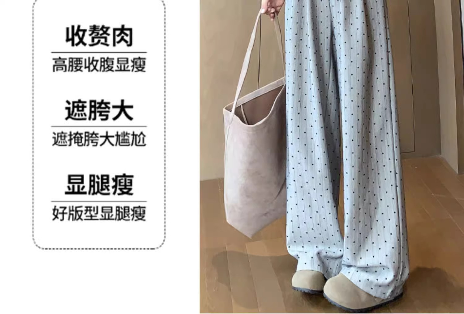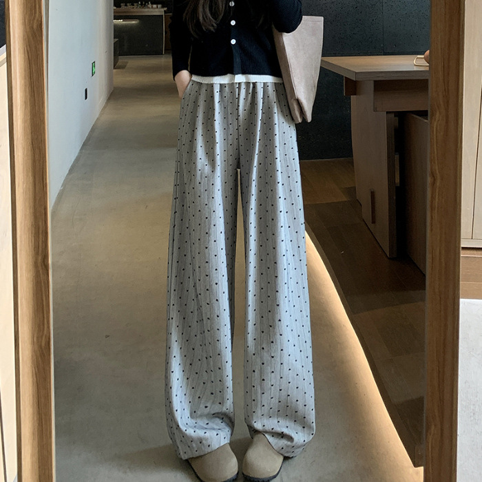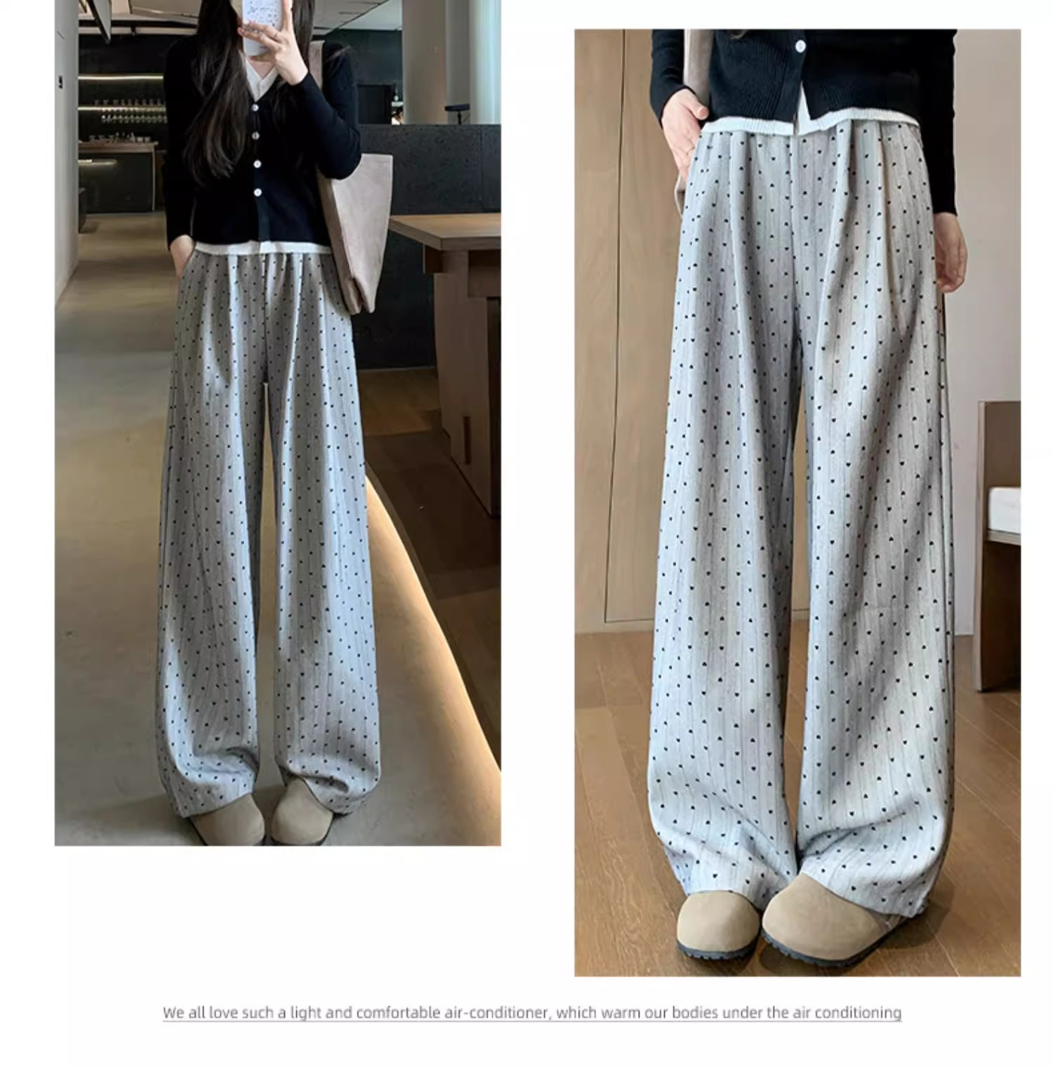 탄성 허리 사랑 웨이브 포인트 넓은 다리 바지 여성 디자인 감각 새로운 봄과 가을 복고풍 캐주얼 세트 바지 높은 허리 바닥 바지