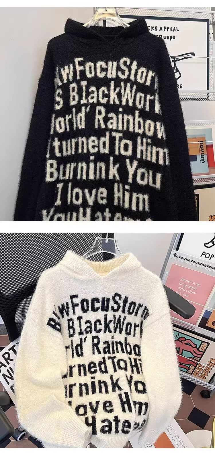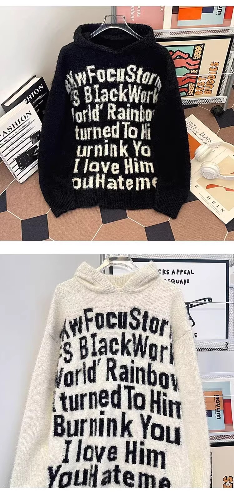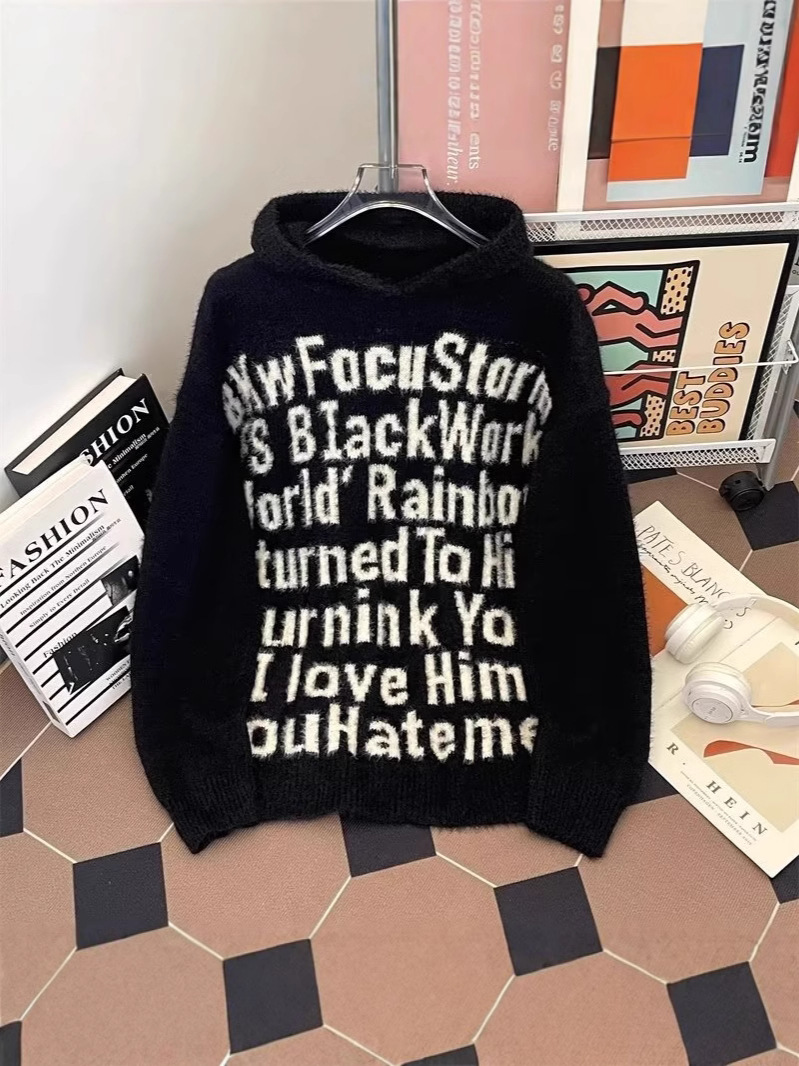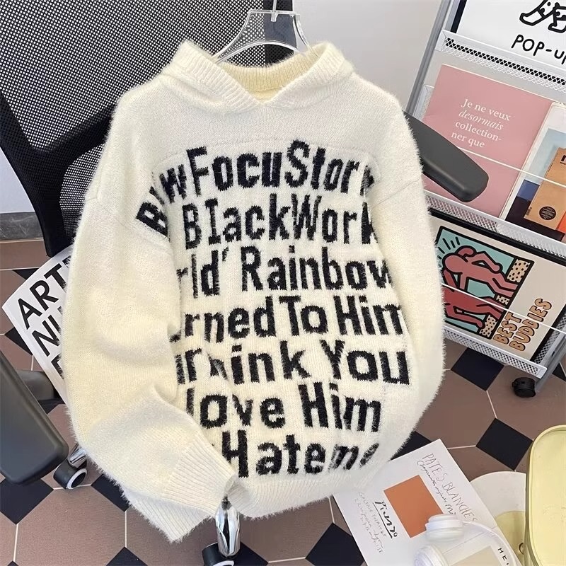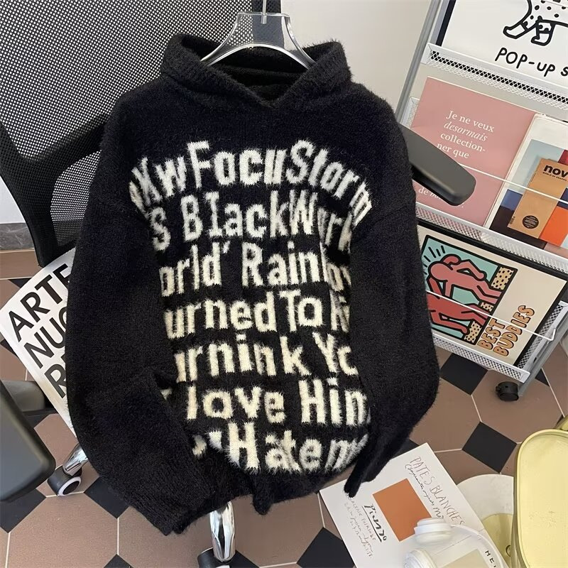 알파벳 자카드 후드 니트 후디 남자의 가을과 겨울 미국 패션 브랜드 느슨한 캐주얼 커플 풀오버 스웨터 재킷스토어 가기