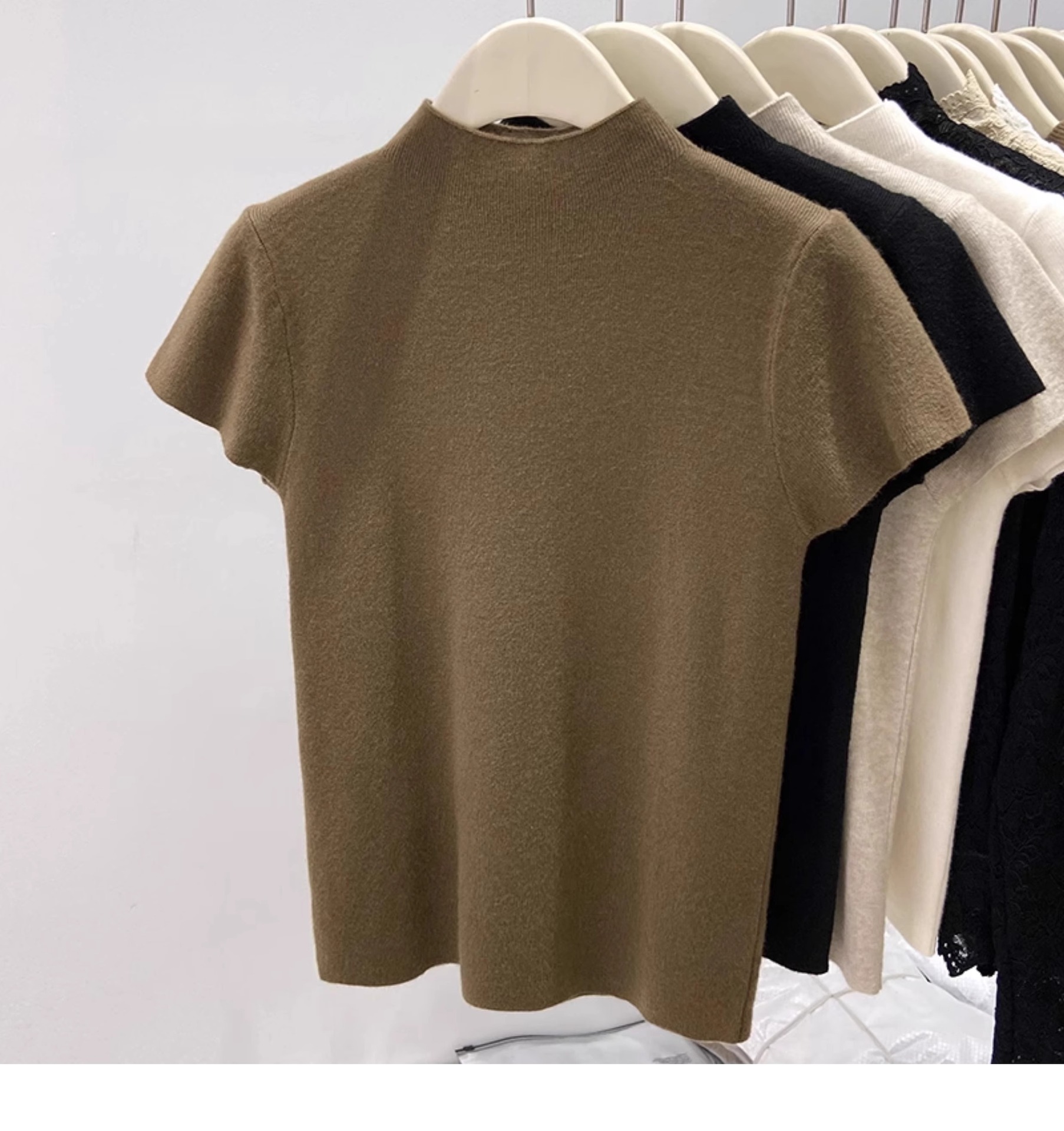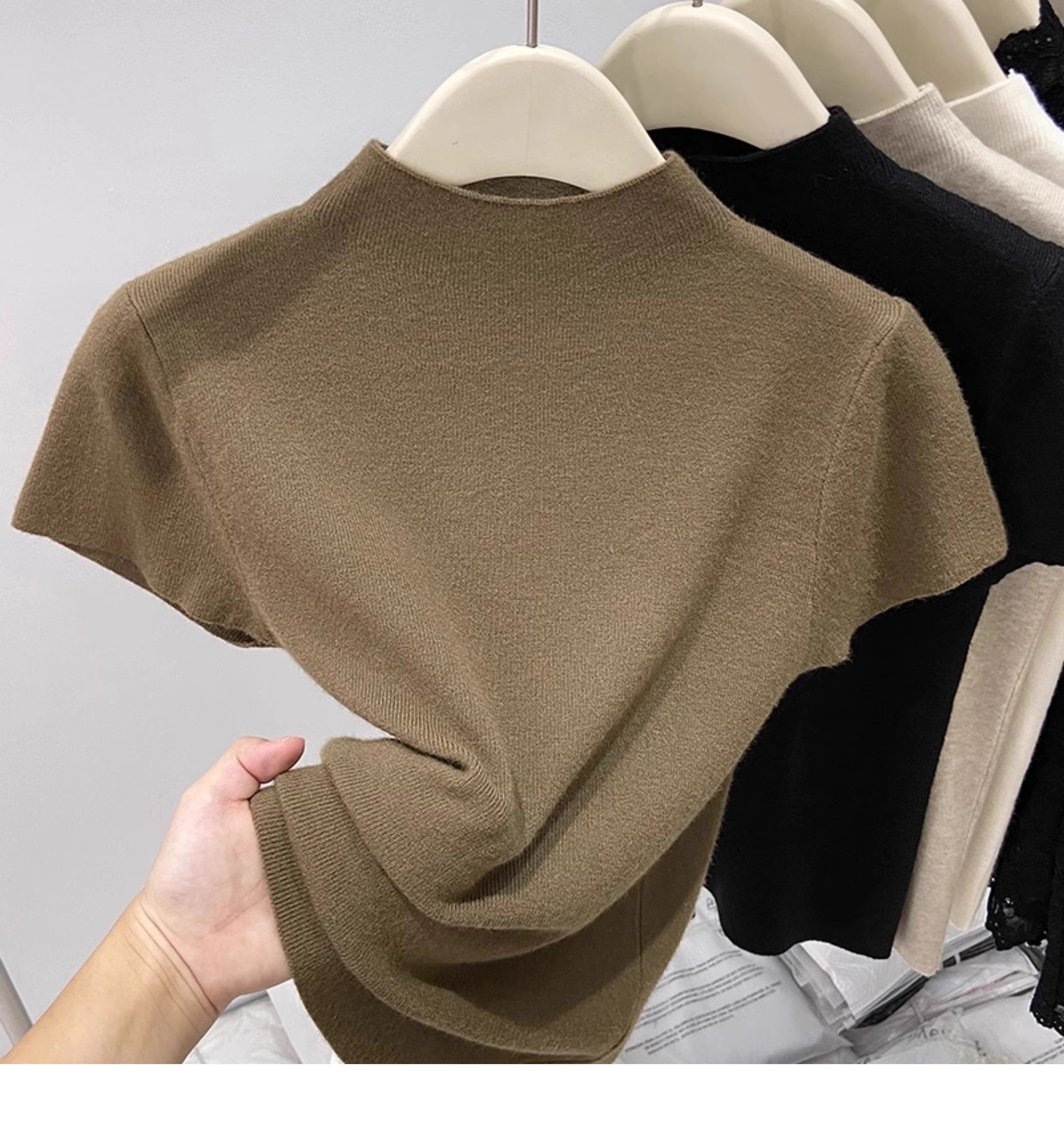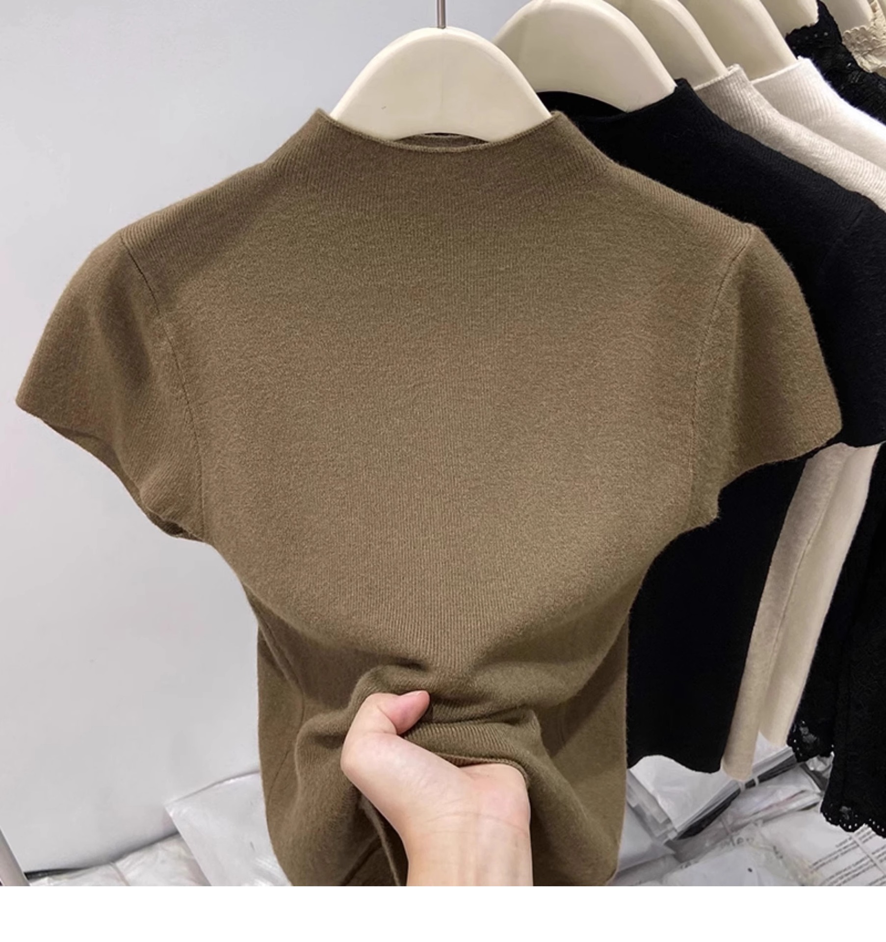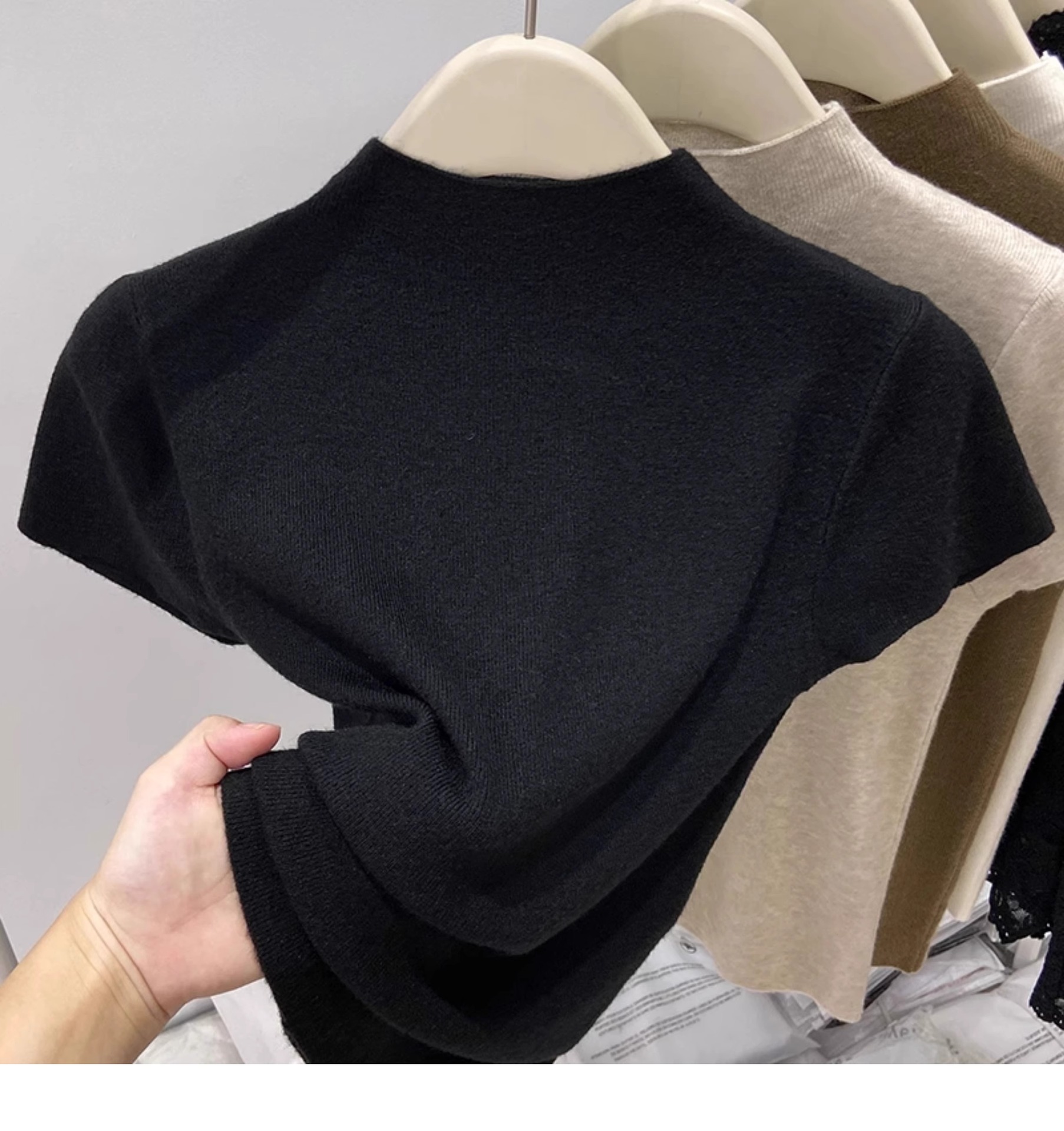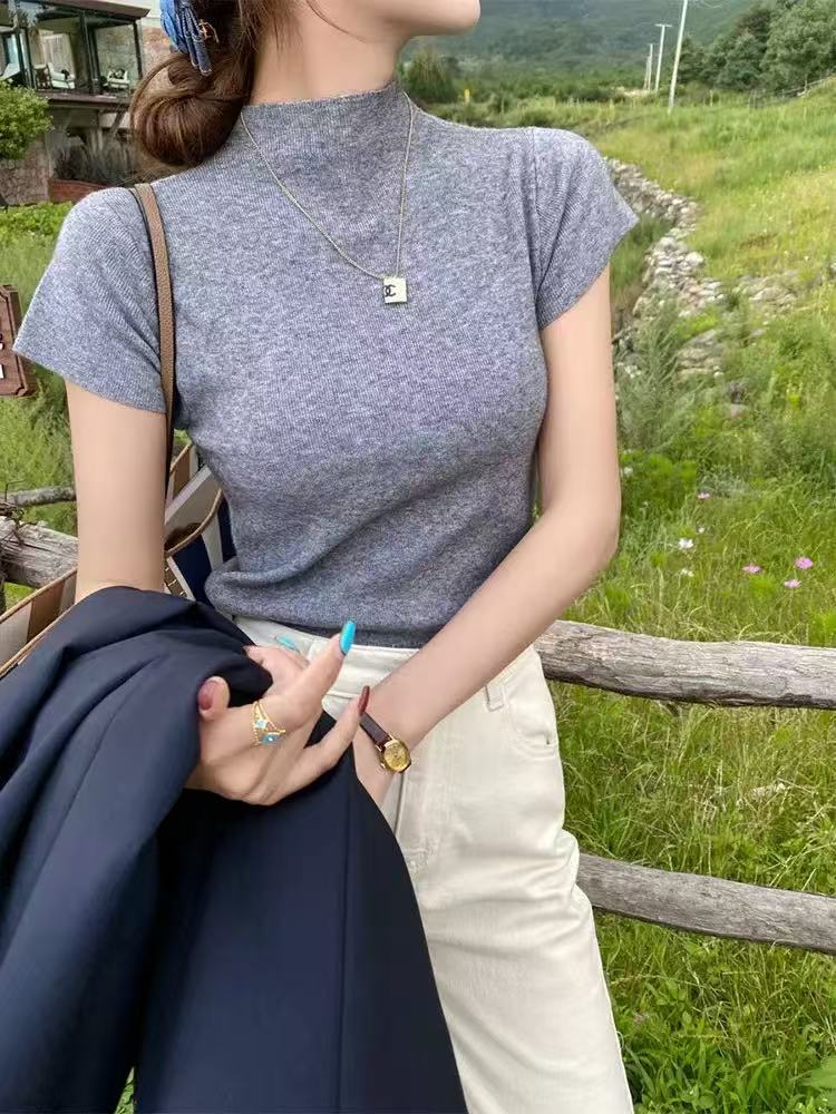 소프트 왁스 모크 칼라 니트 셔츠 반팔 티셔츠 여성용 봄과 가을 새로운 우아한 스키니 내부 칼라베이스 탑스토어 가기