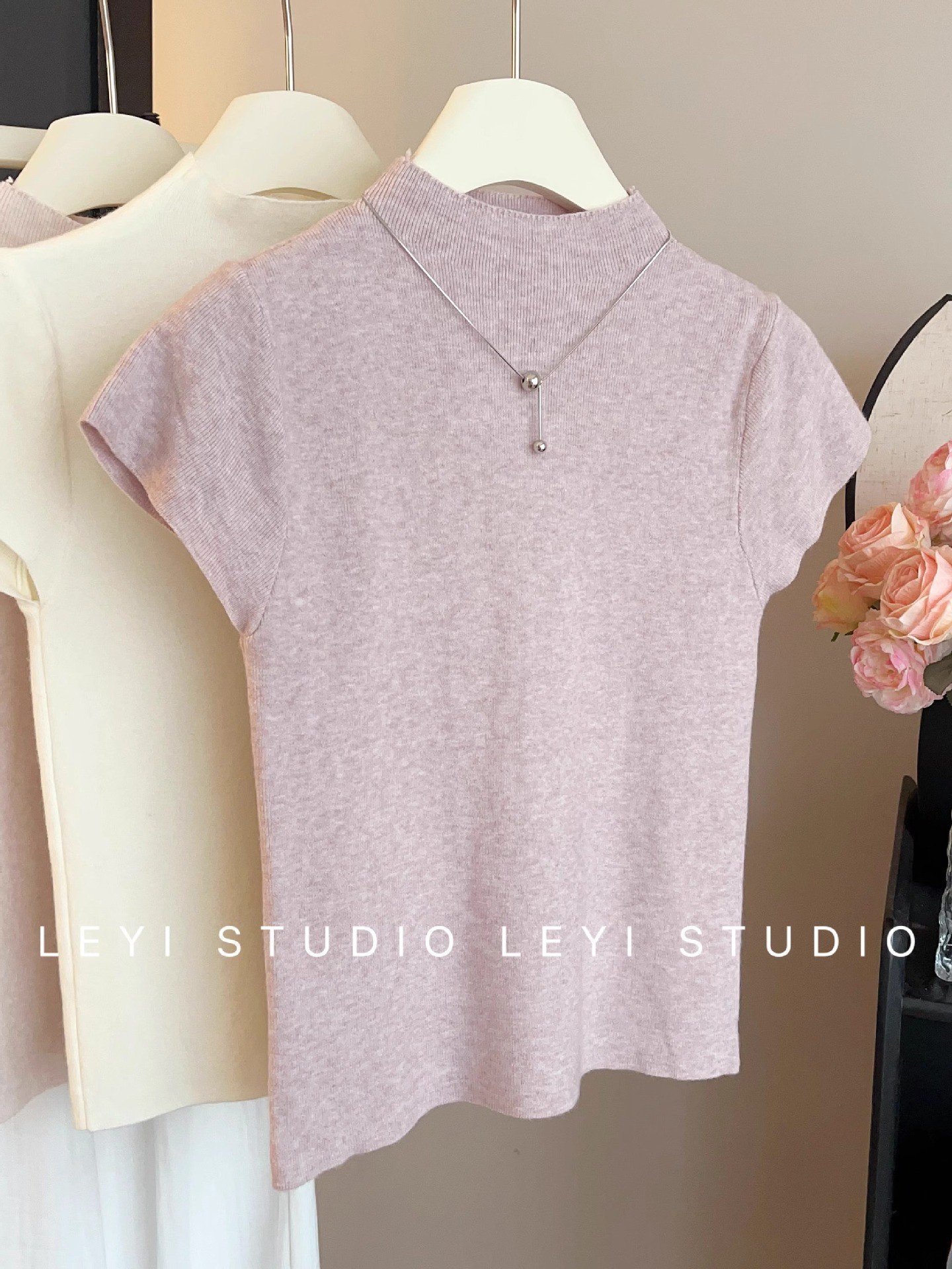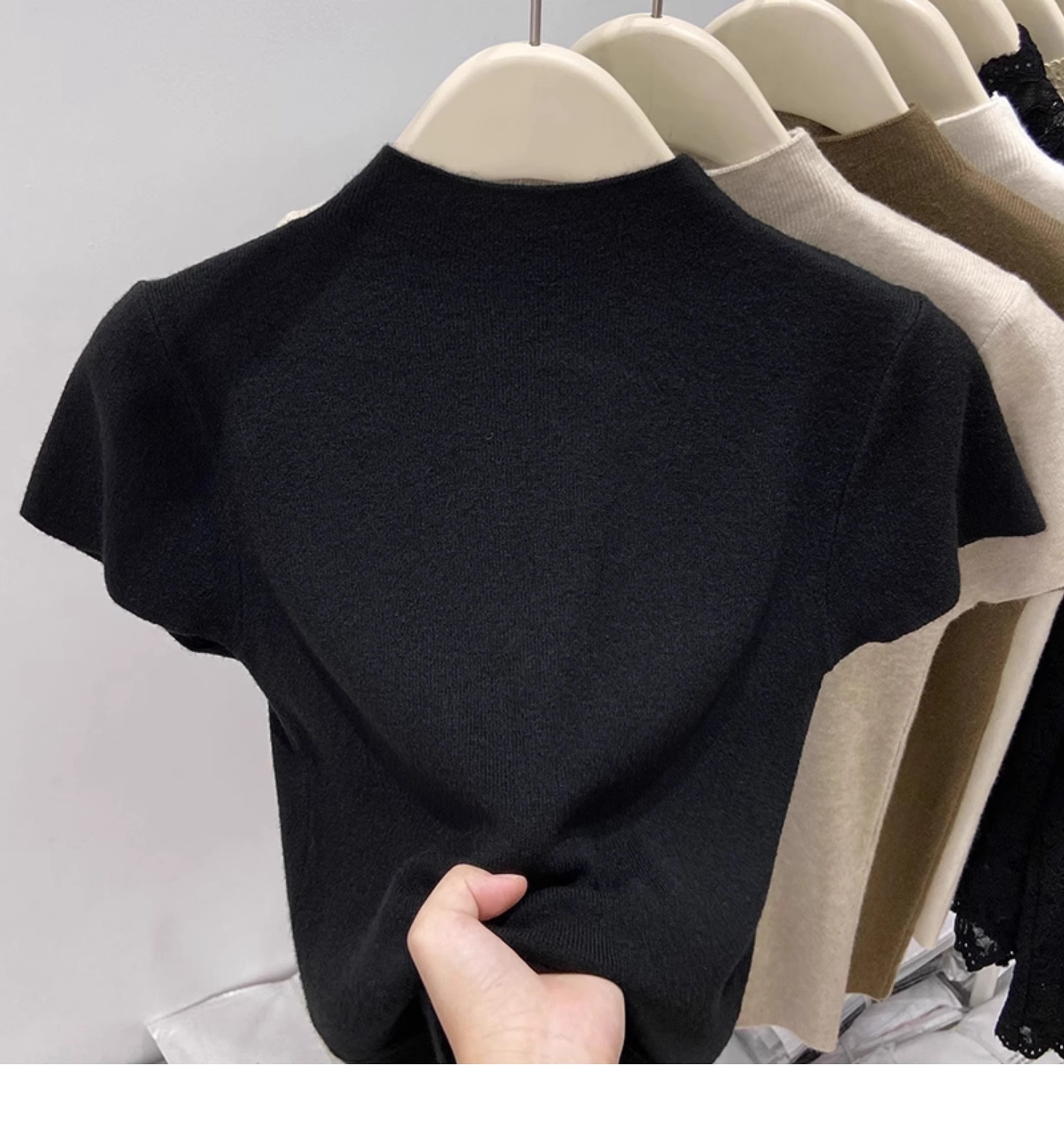소프트 왁스 모크 칼라 니트 셔츠 반팔 티셔츠 여성용 봄과 가을 새로운 우아한 스키니 내부 칼라베이스 탑