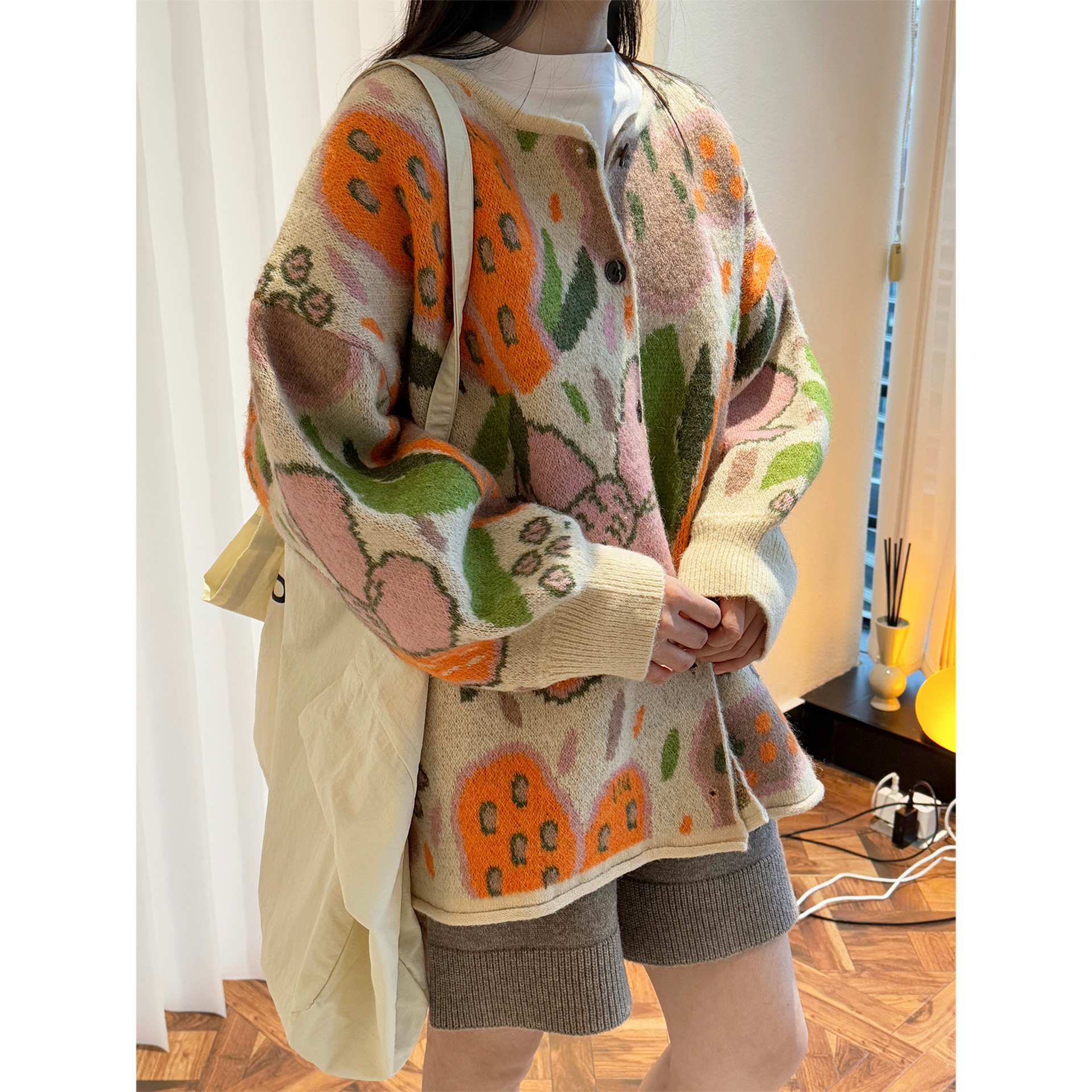 Louvu 이른 봄 새로운 일본 스타일 유행 연령 감소 오렌지 자카드 울 니트 카디건 부드러운 왁스 피부 친화적 인 여성용 탑스토어 가기