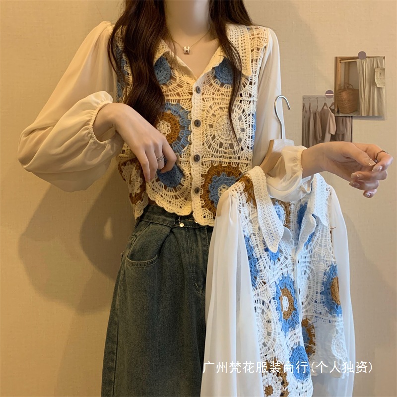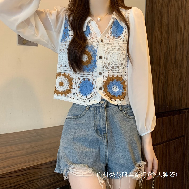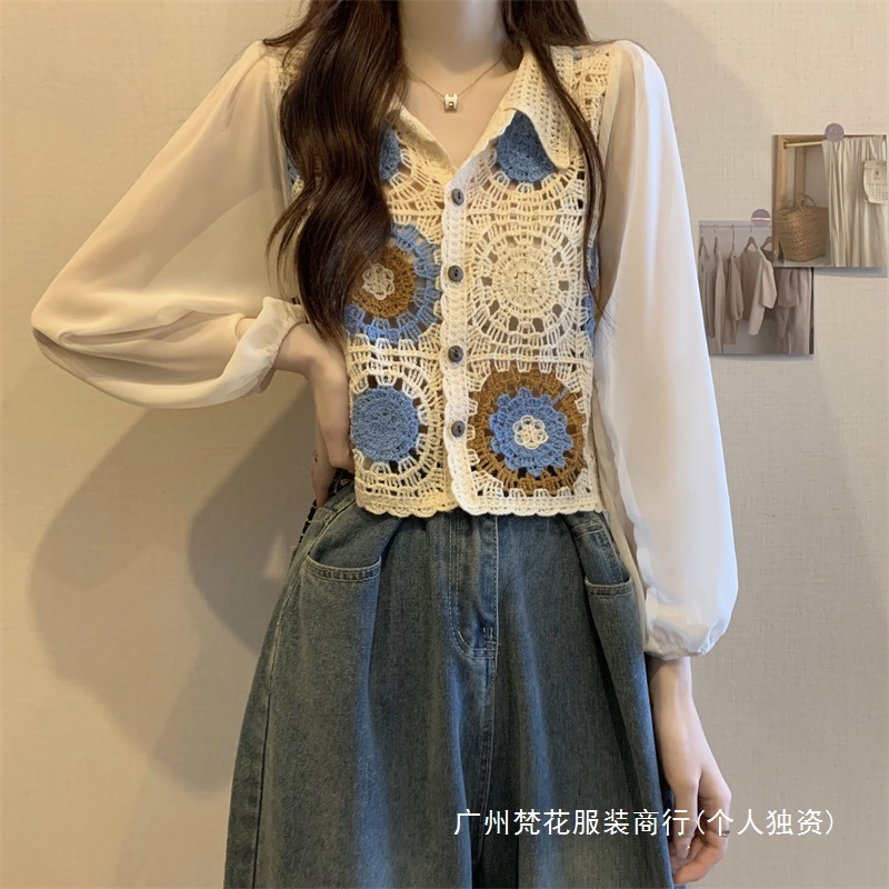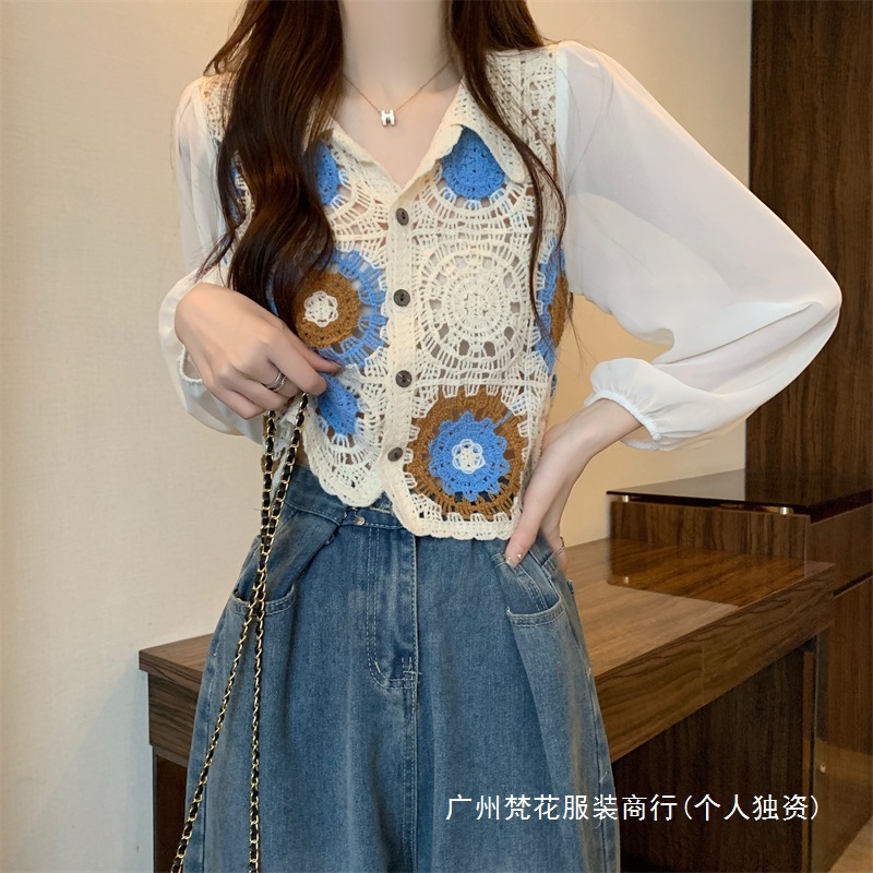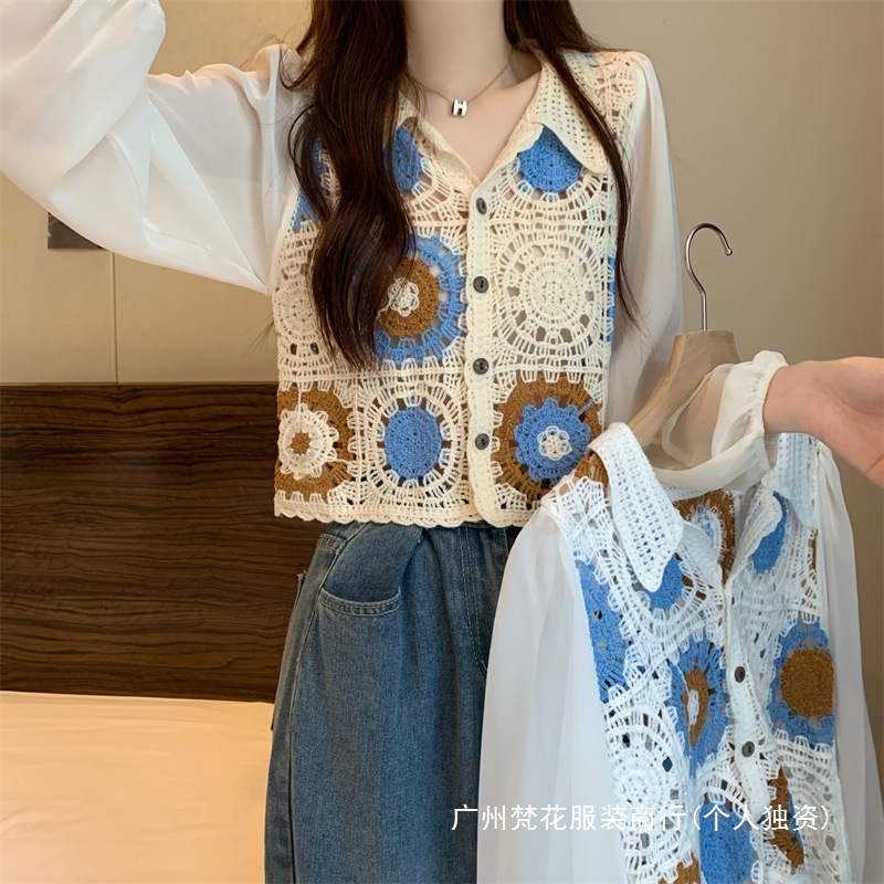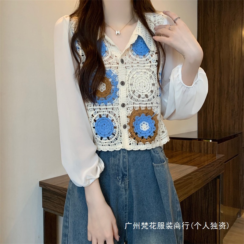 2024 년 여름 새로운 도착 중공 크로 셰 스웨터 레이스 긴 소매 쉬폰 셔츠 프랑스 틈새 탑 카디건스토어 가기