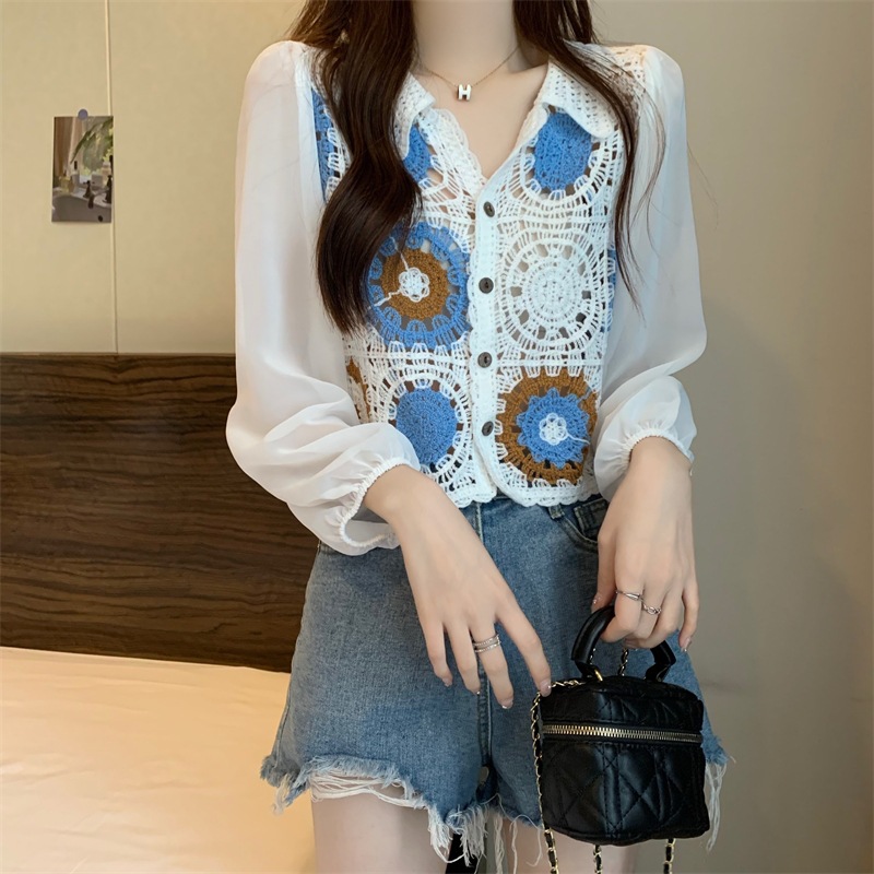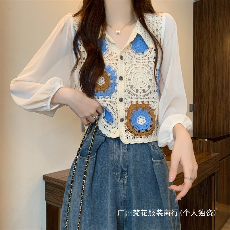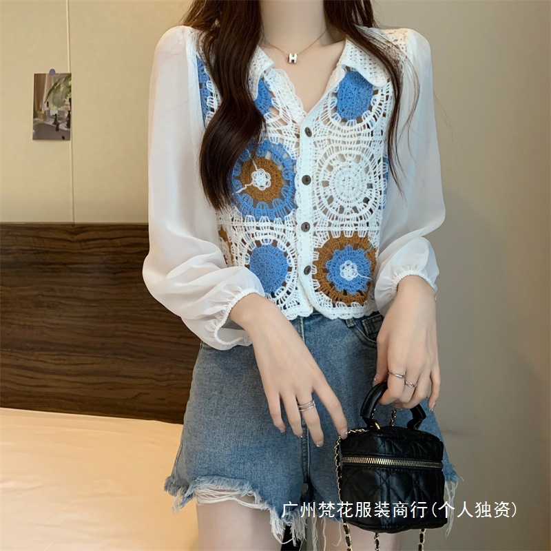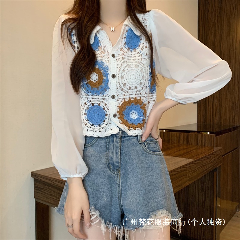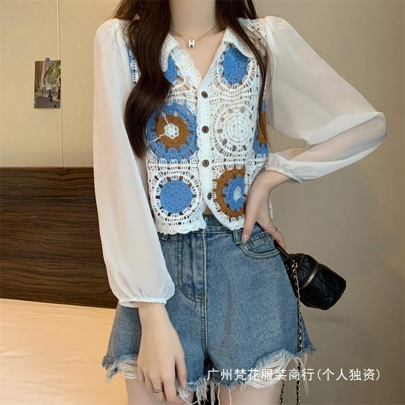 2024 년 여름 새로운 도착 중공 크로 셰 스웨터 레이스 긴 소매 쉬폰 셔츠 프랑스 틈새 탑 카디건