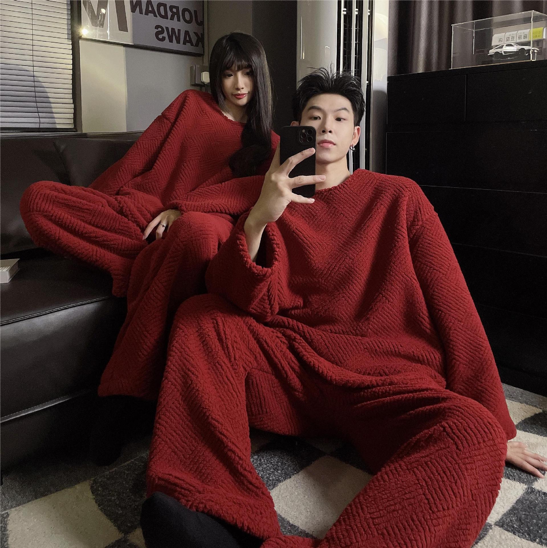 봄, 가을, 겨울에 남자와 여자를위한 산호 양털 커플 파자마 2024 새로운 붉은 결혼식 축제 홈 의류 세트