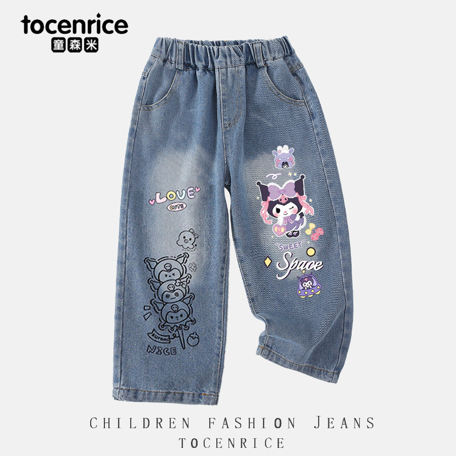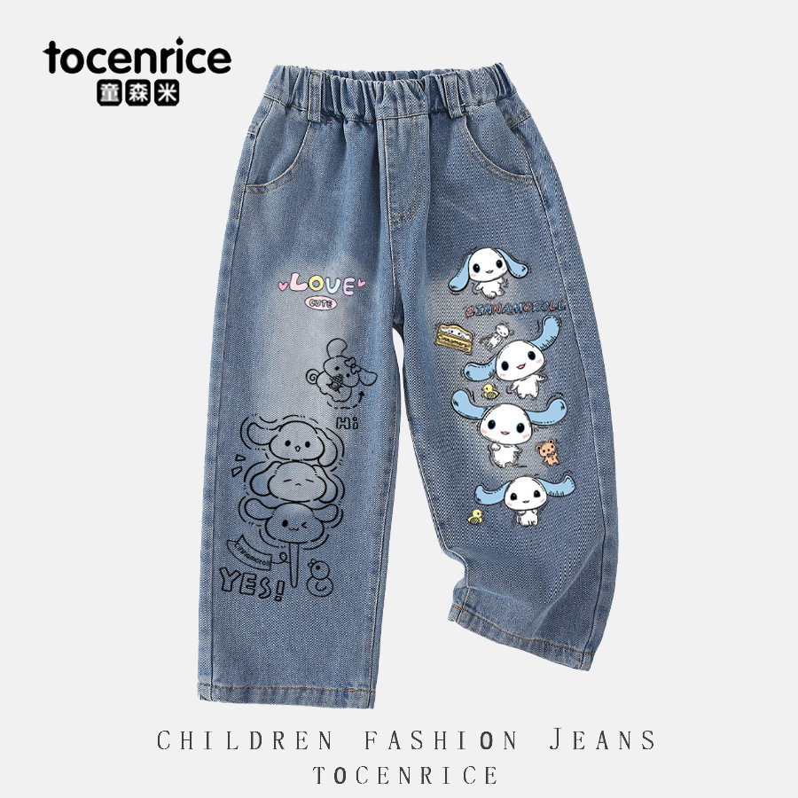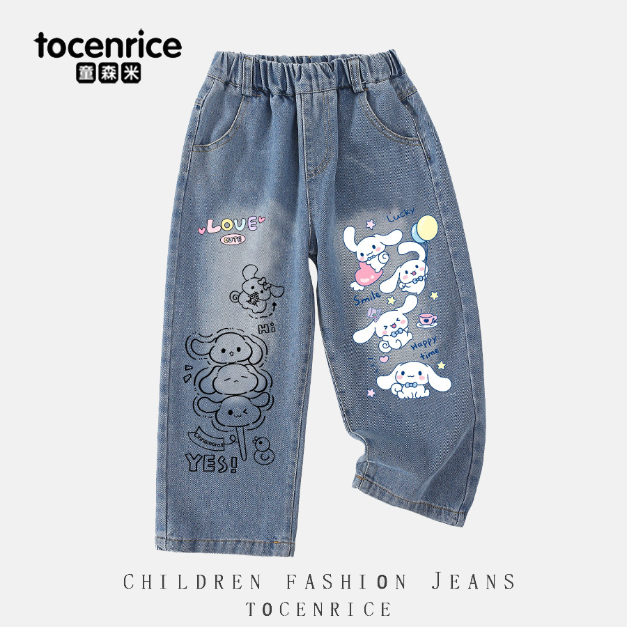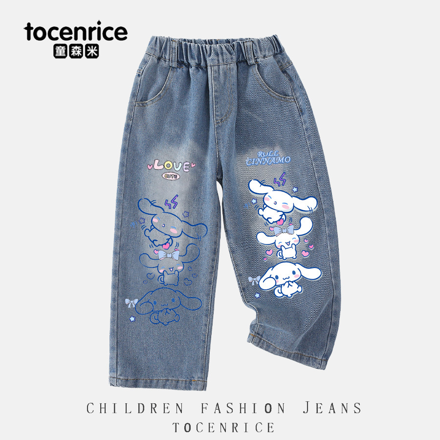 Kulomi 멜로디 어린이 청바지 옥 계피 개 소녀 봄과 가을 스트레이트 바지 소녀 캐주얼 바지 유행