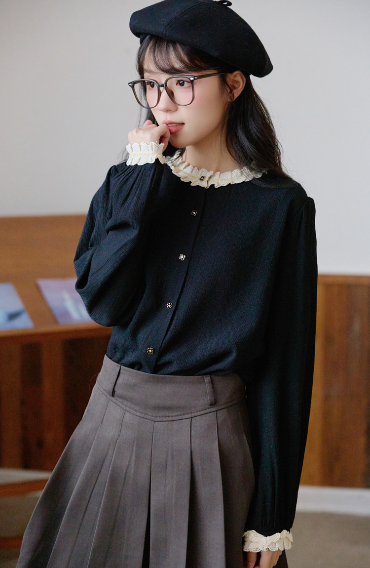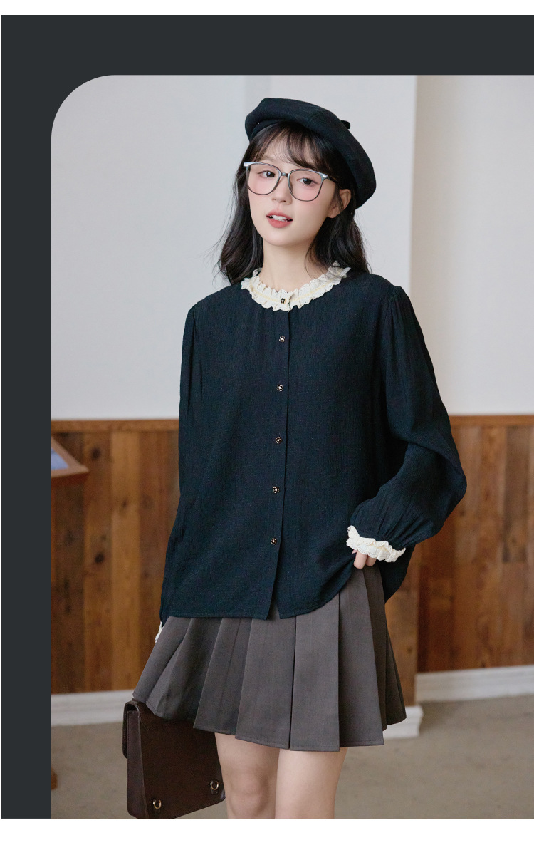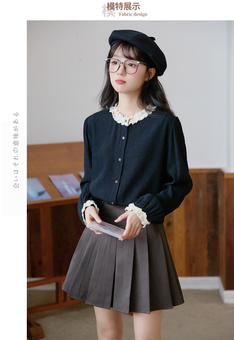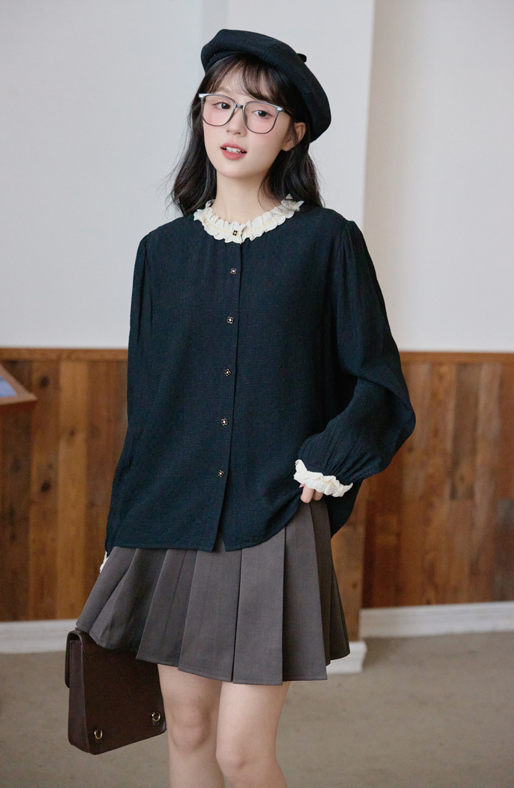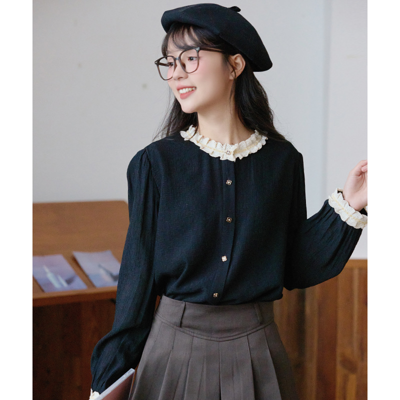 봄 2025 새로운 프랑스 스타일 우아한 작은 골드 버튼 블랙 레이스 대조 크루 넥 디자인 긴 소매 셔츠