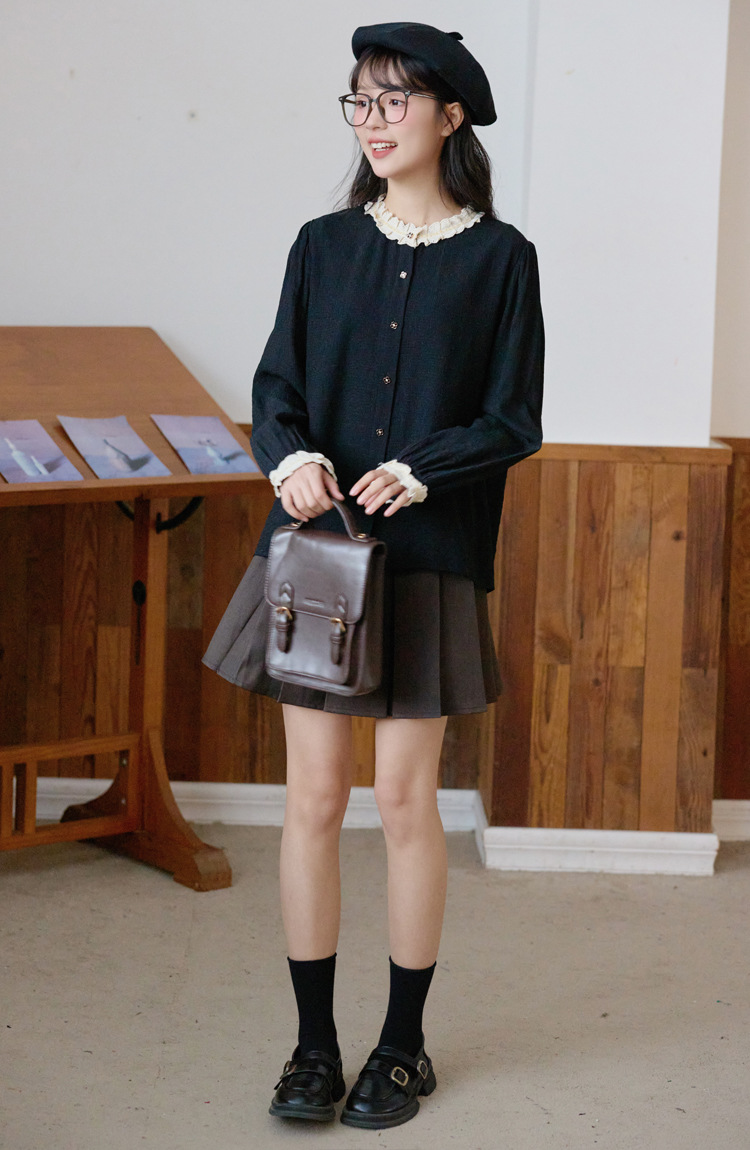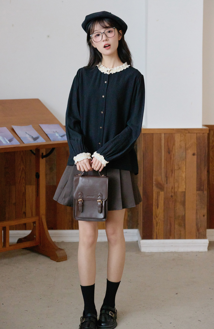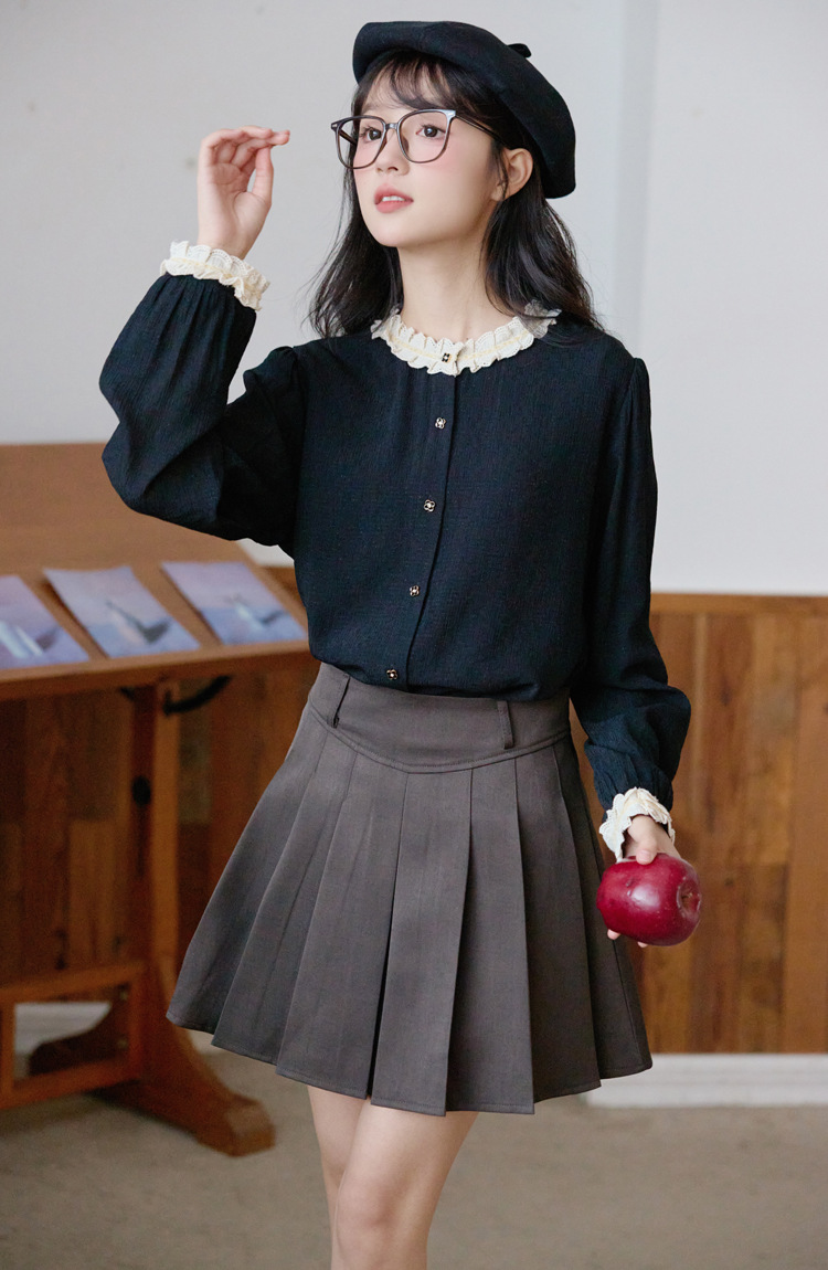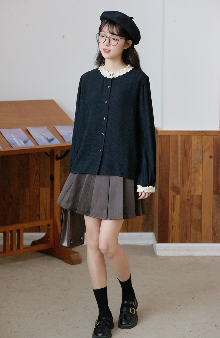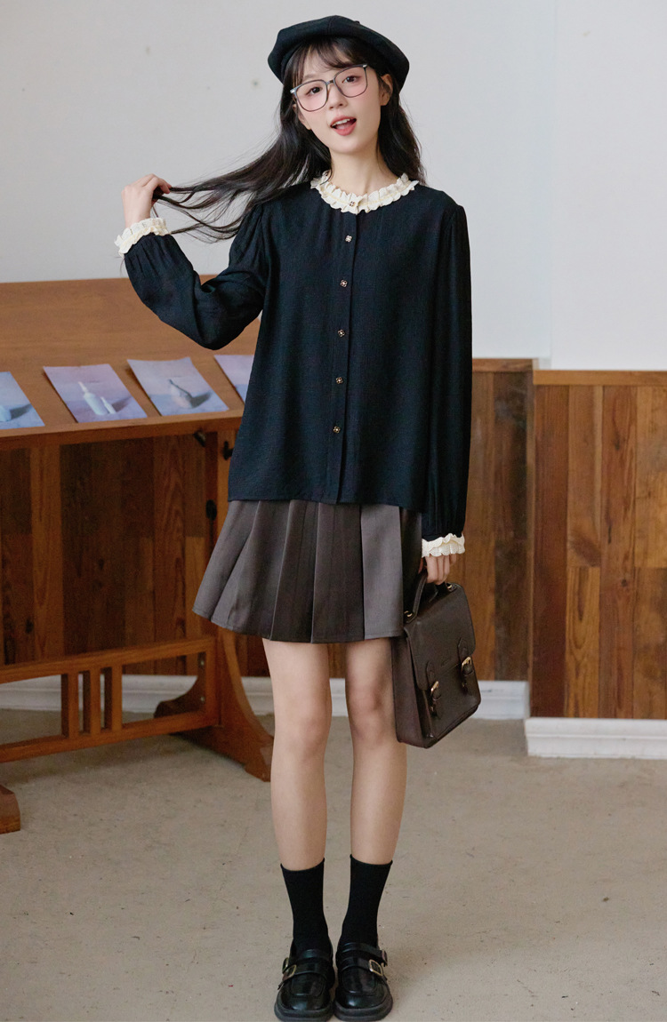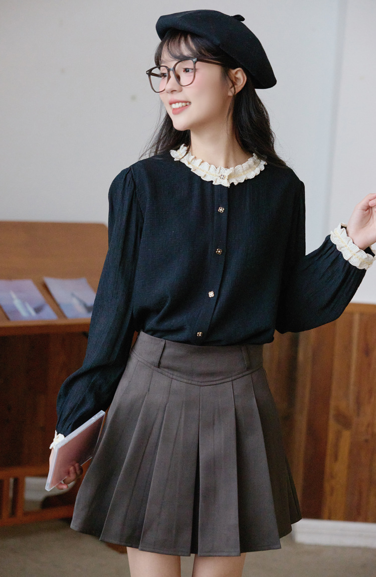 봄 2025 새로운 프랑스 스타일 우아한 작은 골드 버튼 블랙 레이스 대조 크루 넥 디자인 긴 소매 셔츠