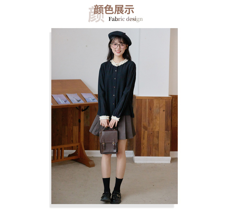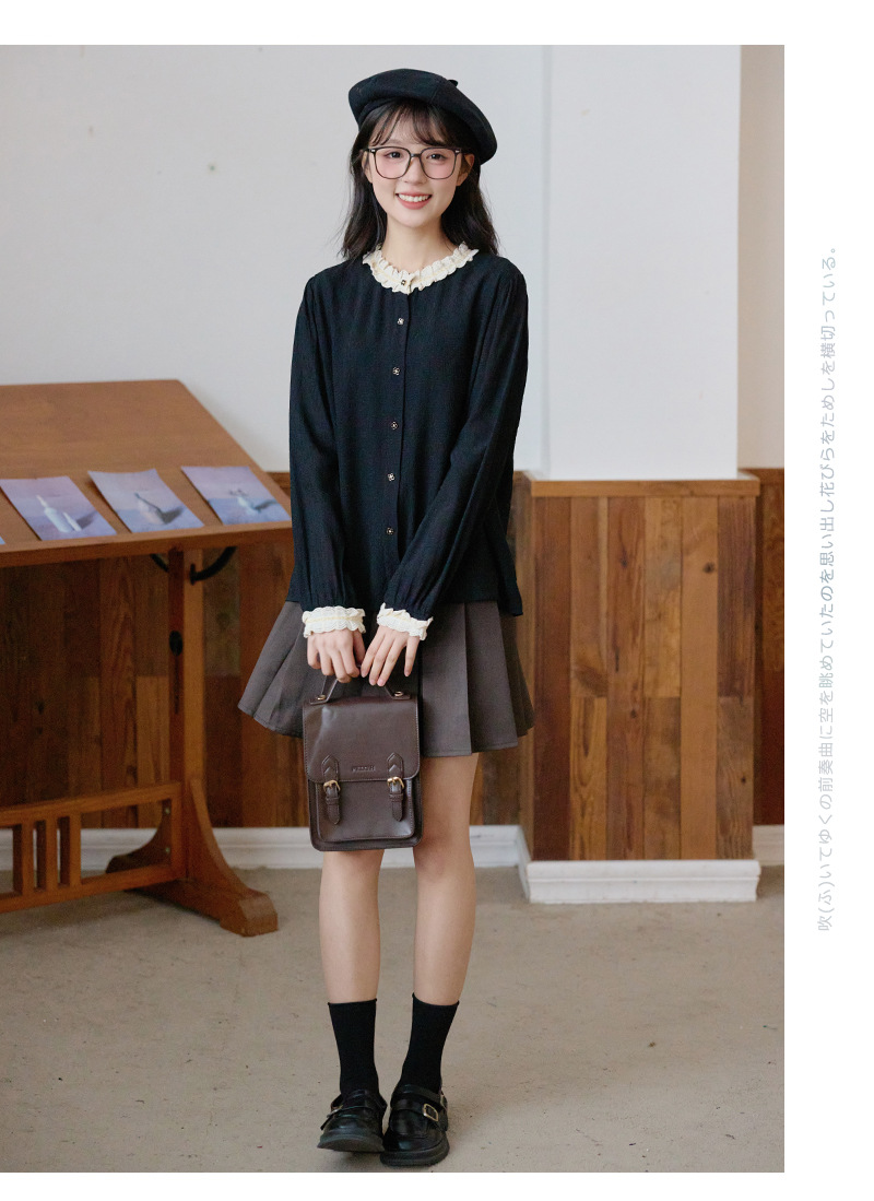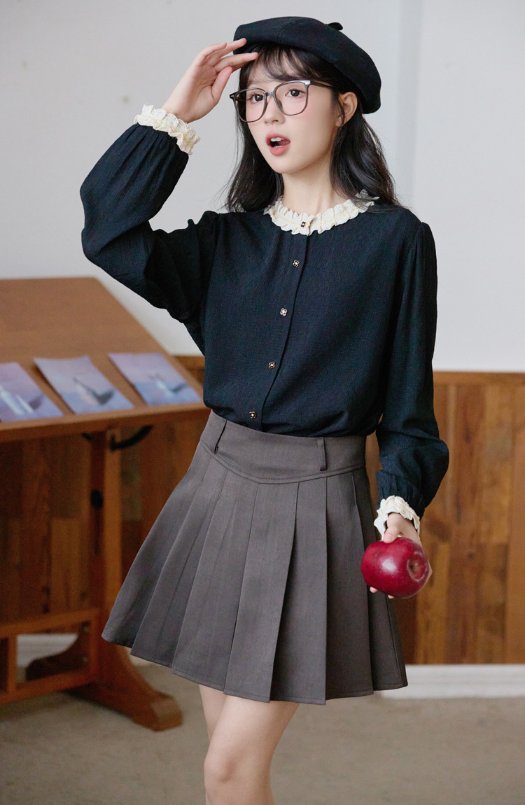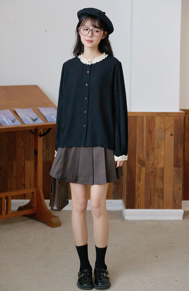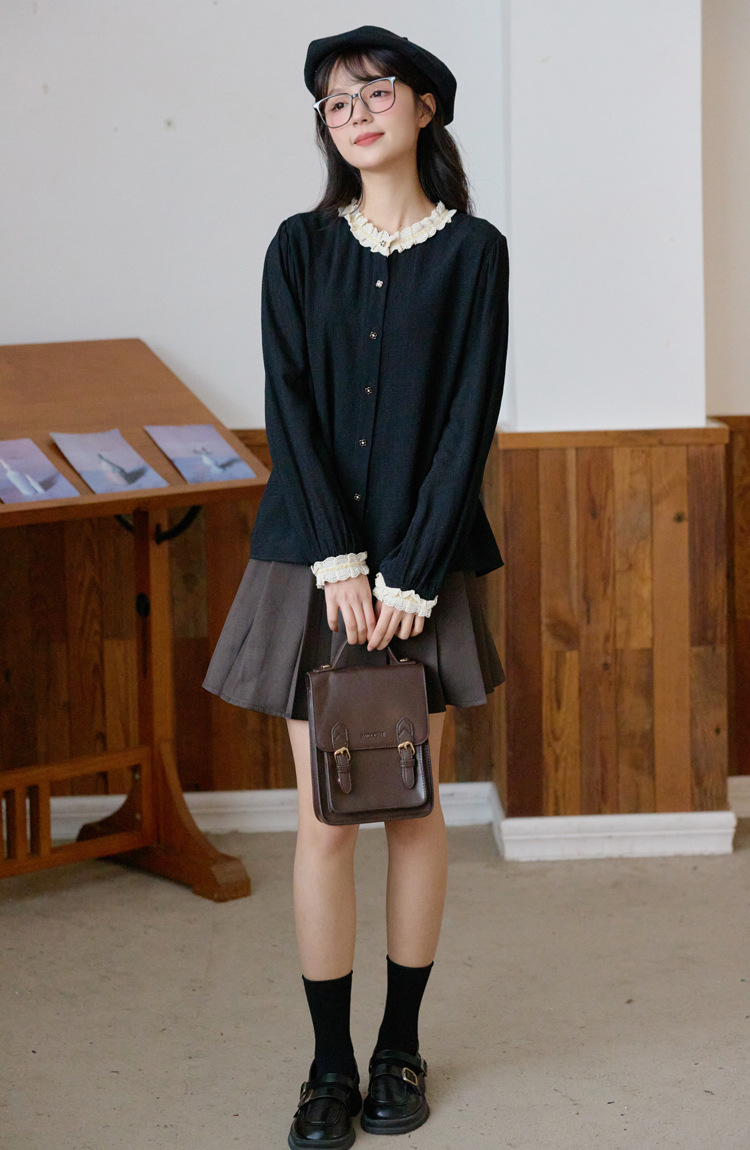 봄 2025 새로운 프랑스 스타일 우아한 작은 골드 버튼 블랙 레이스 대조 크루 넥 디자인 긴 소매 셔츠