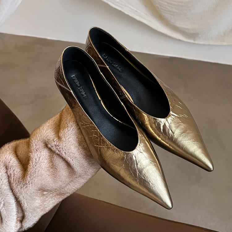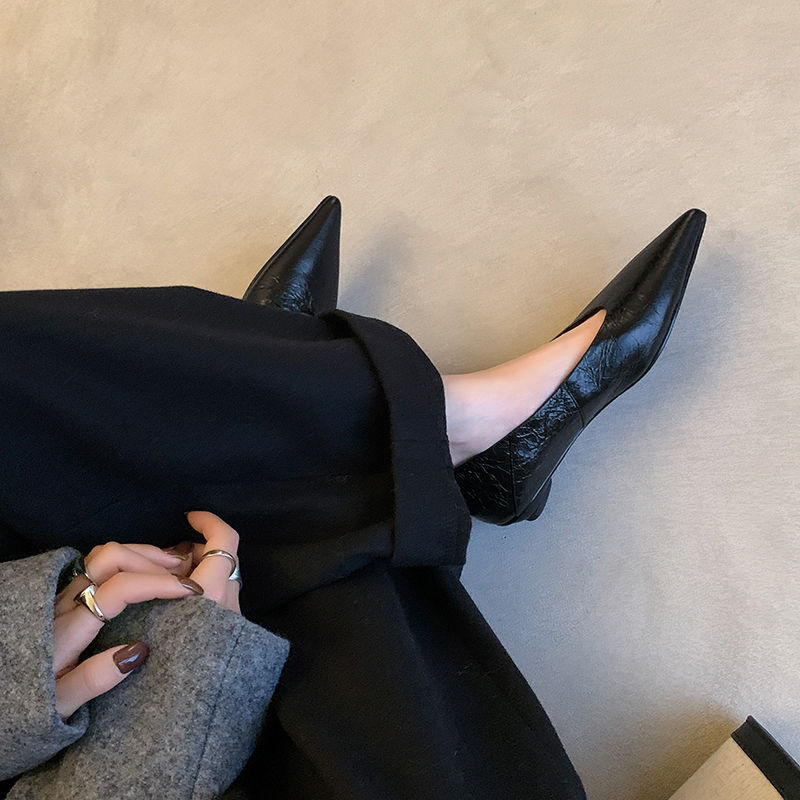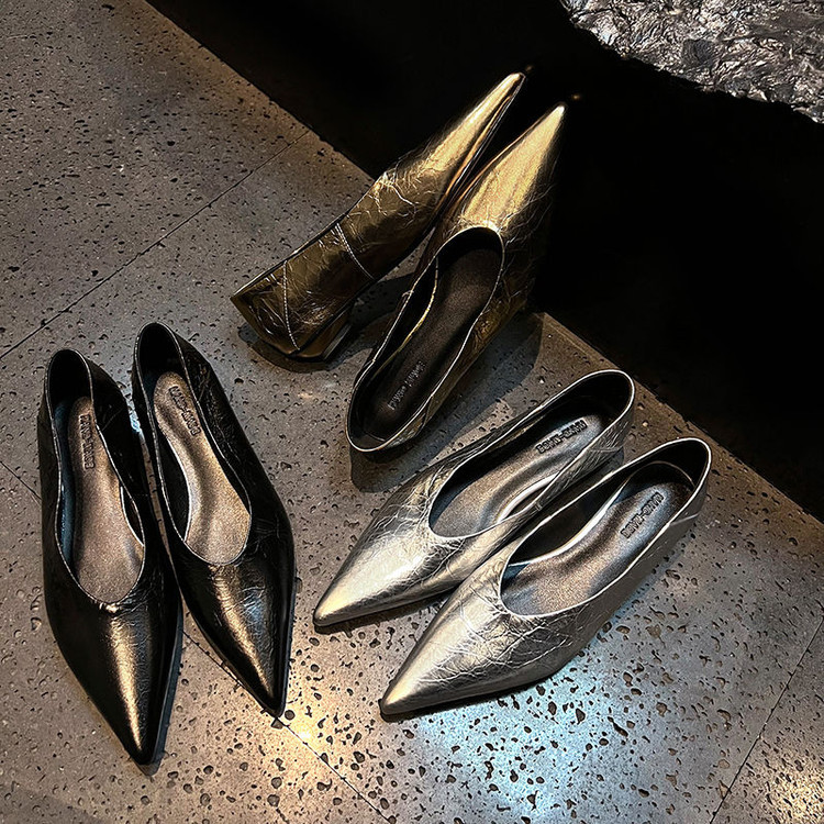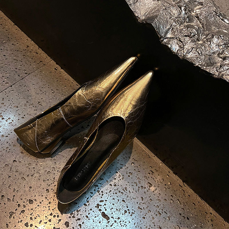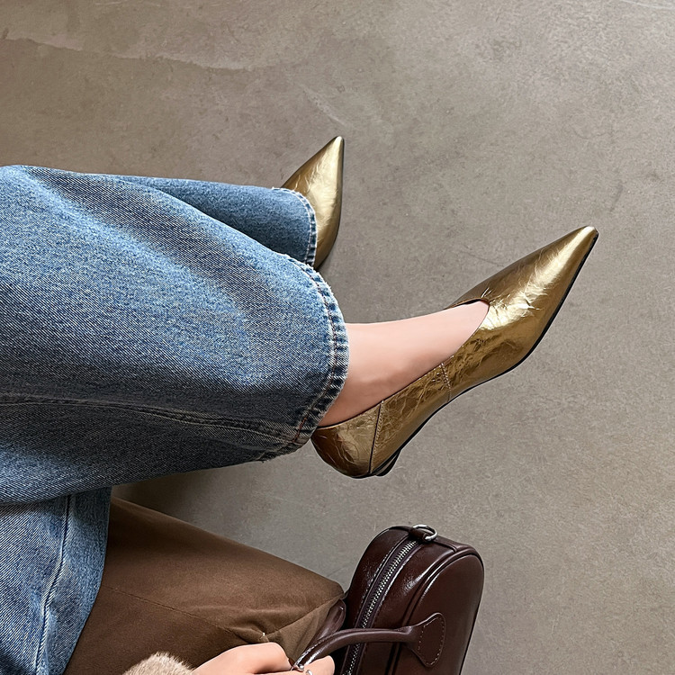 골든 얕은 입 싱글 레이어 신발 여성용 로우 힐 2025 새로운 스타일 탑 레이어 Cowhide 솔리드 컬러 레트로 포인팅 발가락 가죽 싱글 레이어 신발스토어 가기