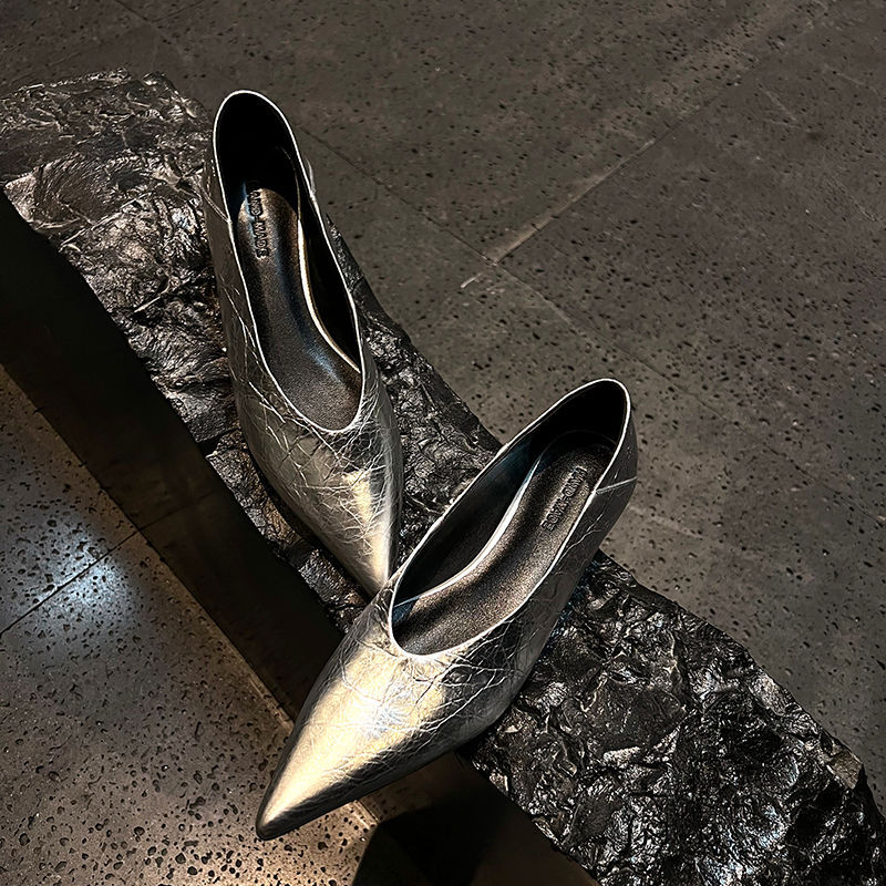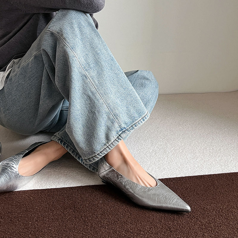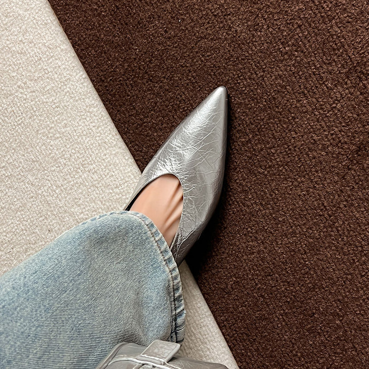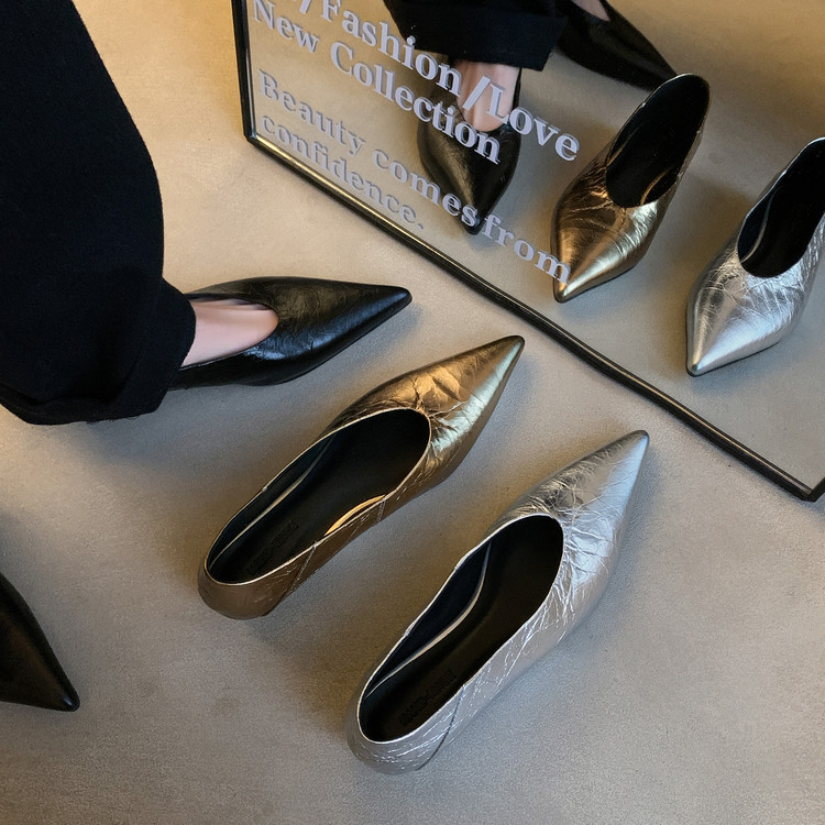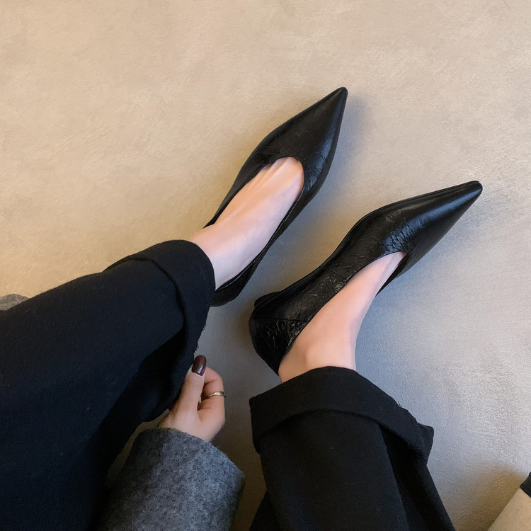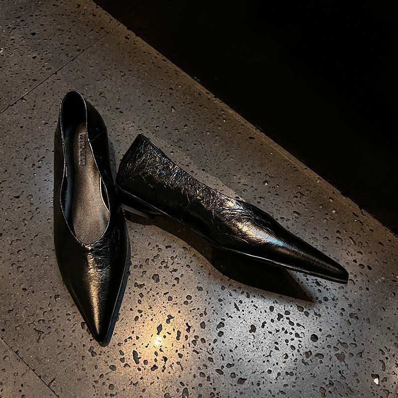 골든 얕은 입 싱글 레이어 신발 여성용 로우 힐 2025 새로운 스타일 탑 레이어 Cowhide 솔리드 컬러 레트로 포인팅 발가락 가죽 싱글 레이어 신발스토어 가기