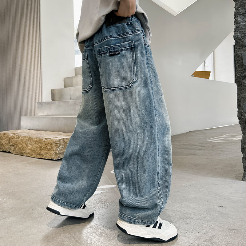 소년 바지 봄과 가을 2025 새로운 중대형 어린이 매끈한 소년 스트레이트 어린이 봄 캐주얼 데님 바지스토어 가기