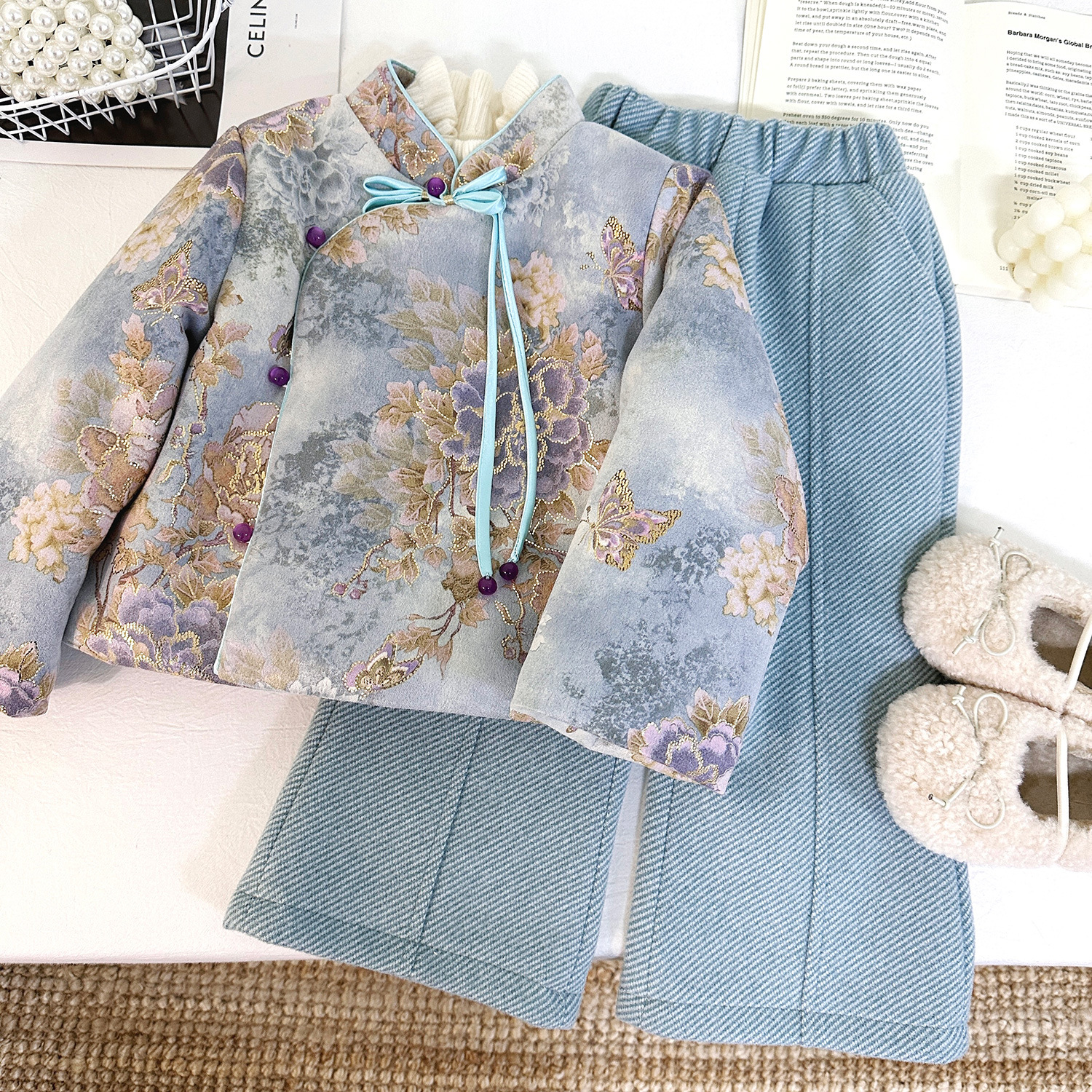 소녀 세트 새로운 2024 겨울 새로운 중국 스타일 국가 스타일과 벨벳 재킷 와이드 레그 바지 투피스 세트 트렌디스토어 가기