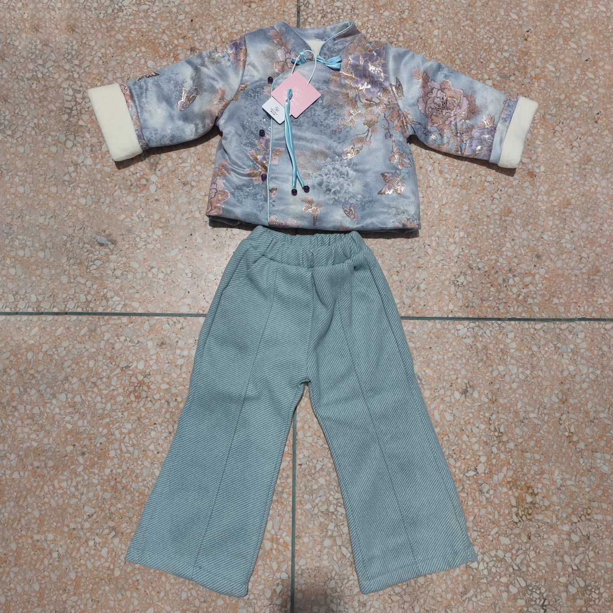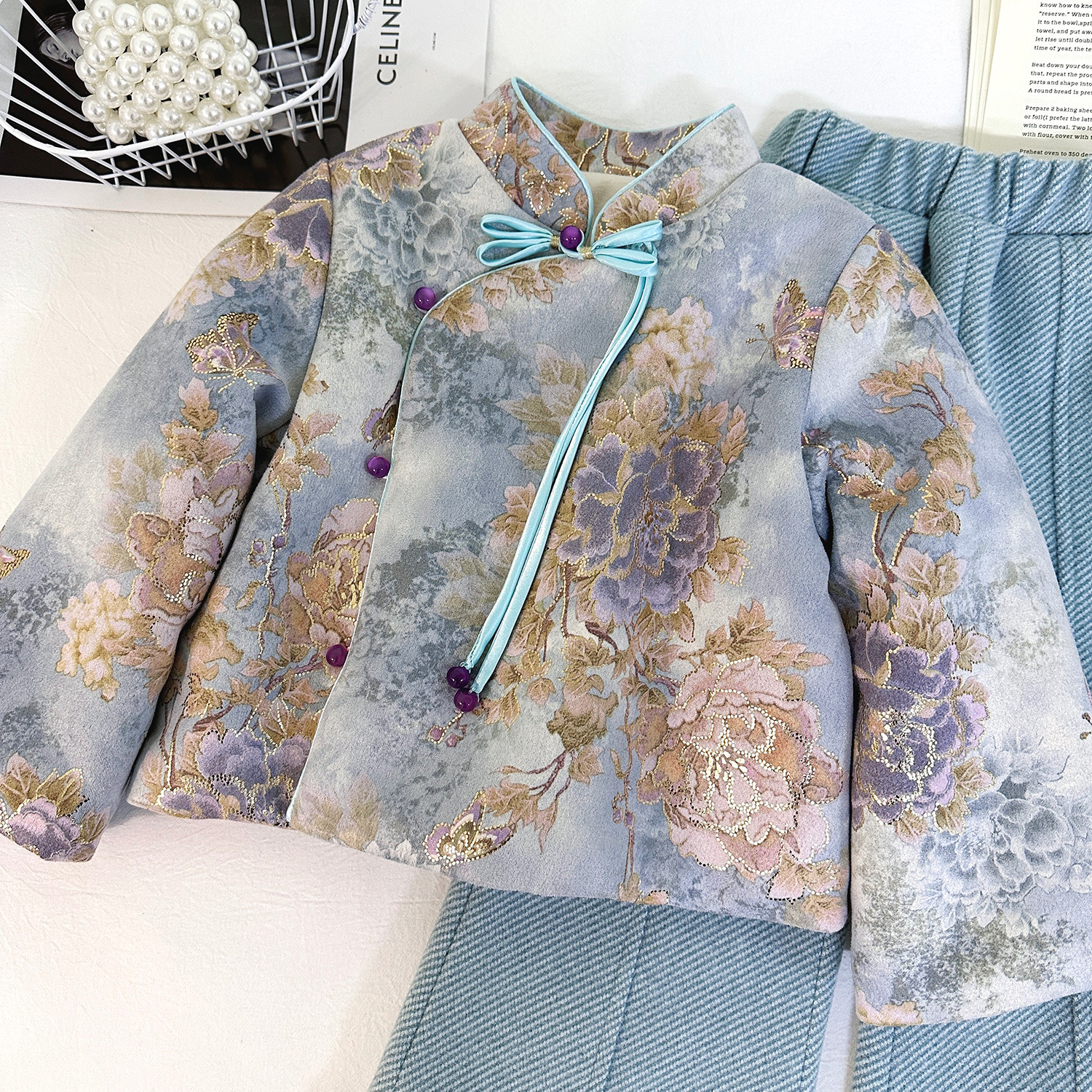 소녀 세트 새로운 2024 겨울 새로운 중국 스타일 국가 스타일과 벨벳 재킷 와이드 레그 바지 투피스 세트 트렌디