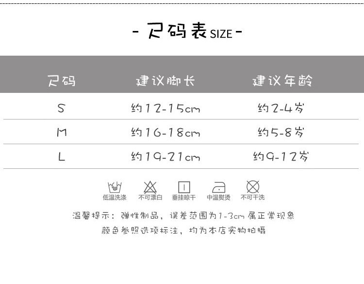 • S 사이즈 1-3세, 발 길이 12-15, 신발 사이즈 20-24