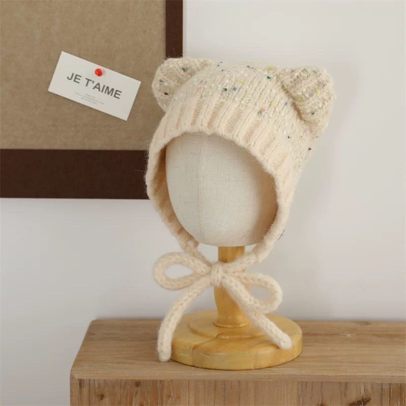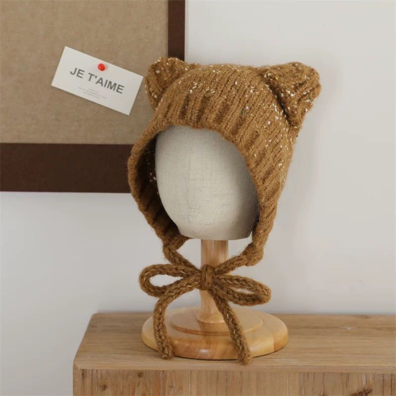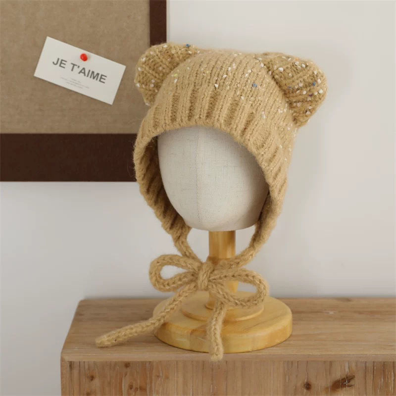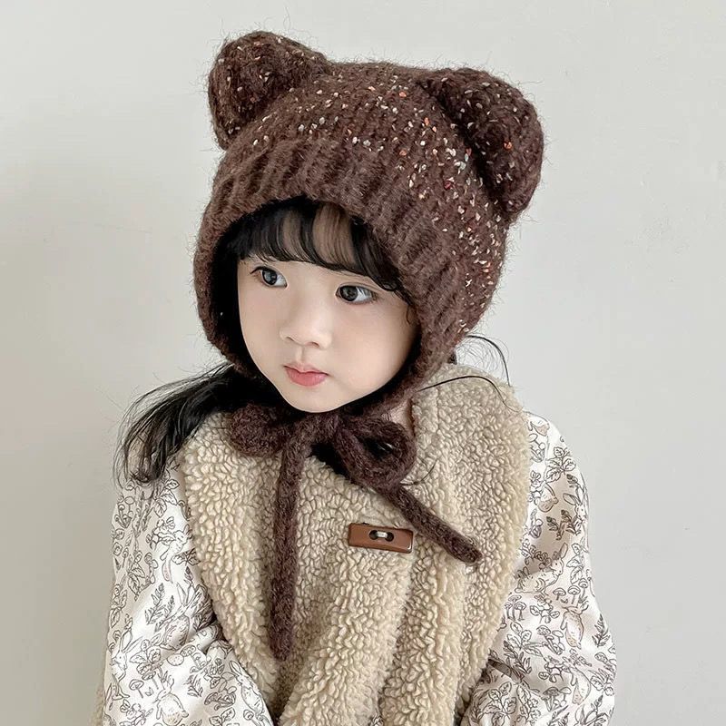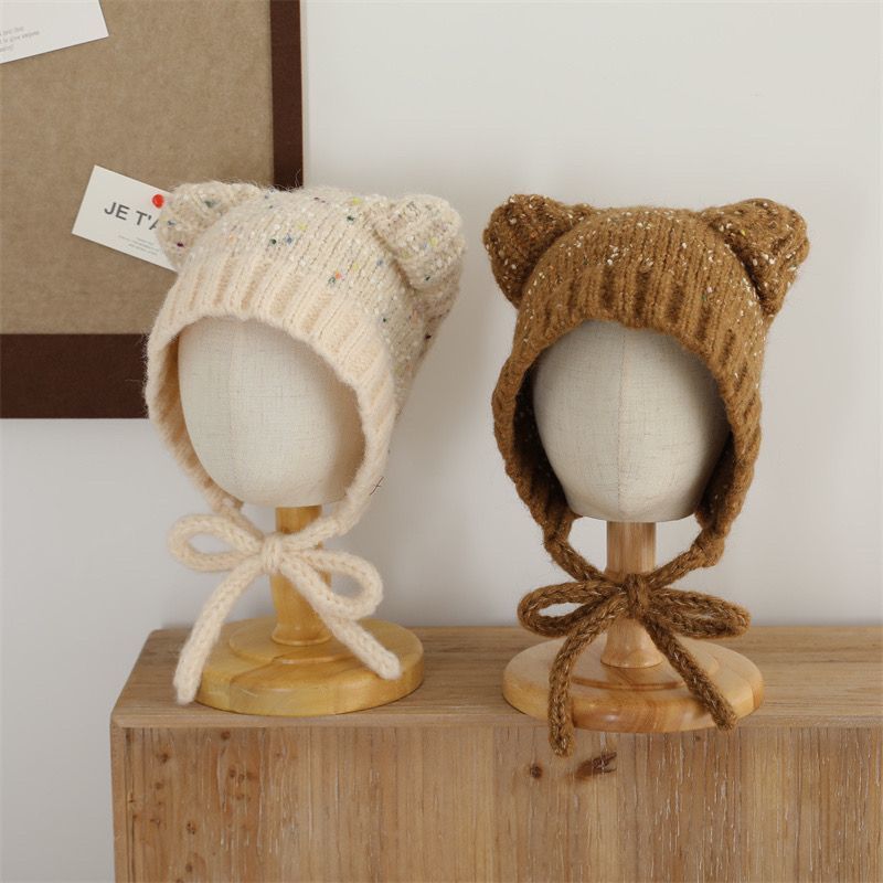 어린이 모자 가을과 겨울 한국 스타일 소녀 귀여운 곰 레이스 업 니트 귀 모자 소년 아기 울 모자 트렌디스토어 가기