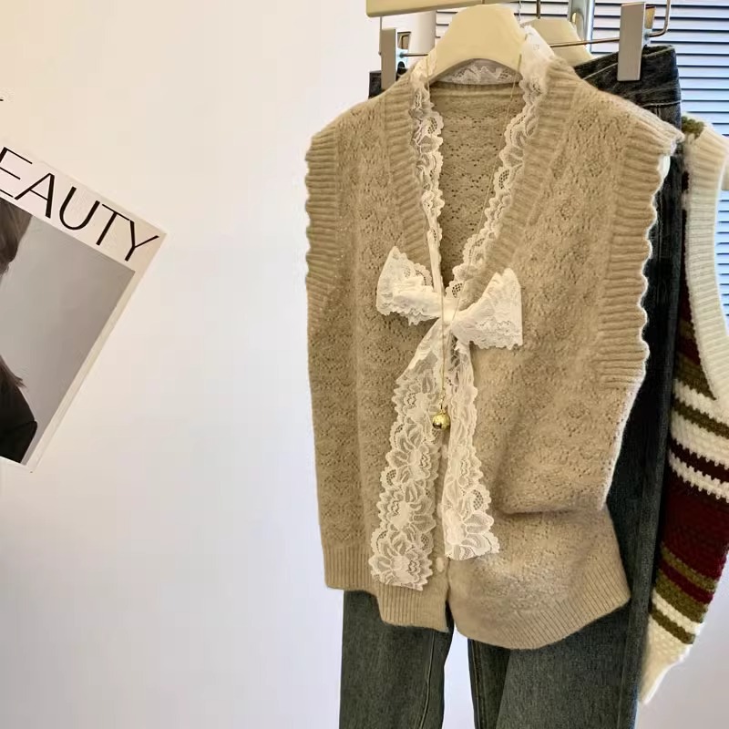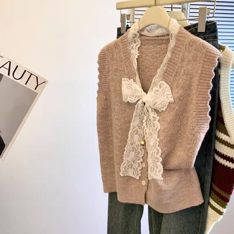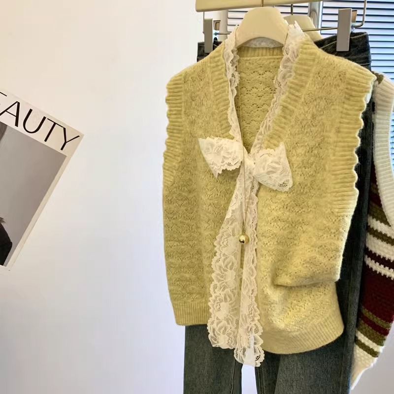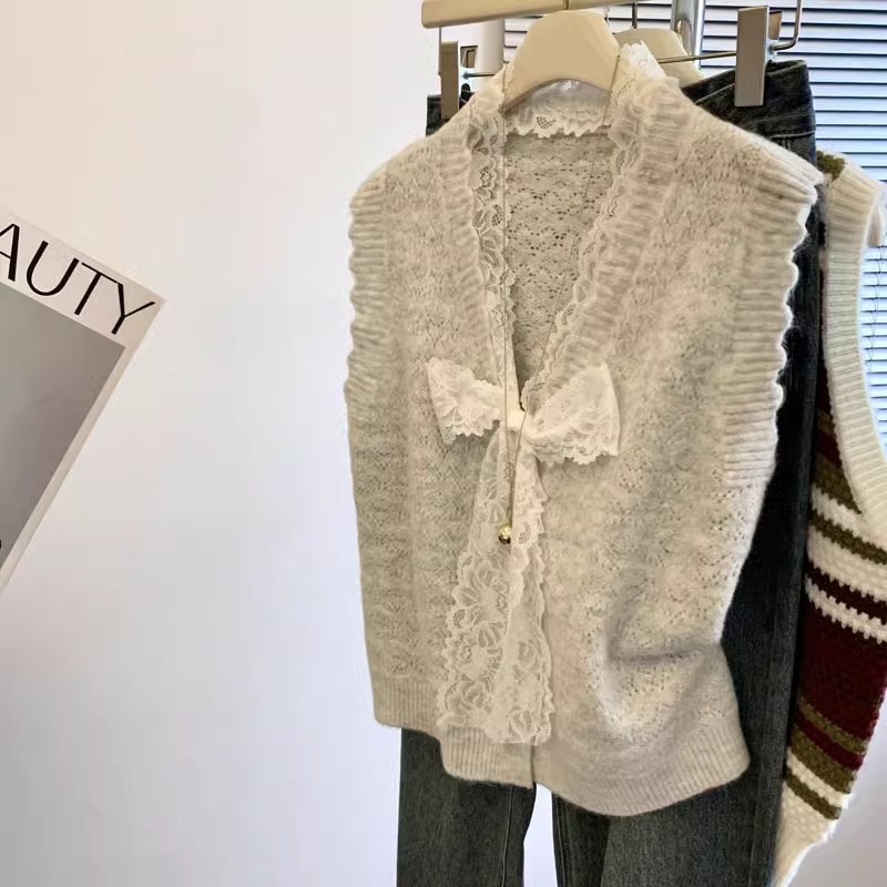 샤오샹풍 레이스 리본 조끼 니트 여성용 2024 신상 가을 겨울 아우터 레이어드 스웨터 조끼