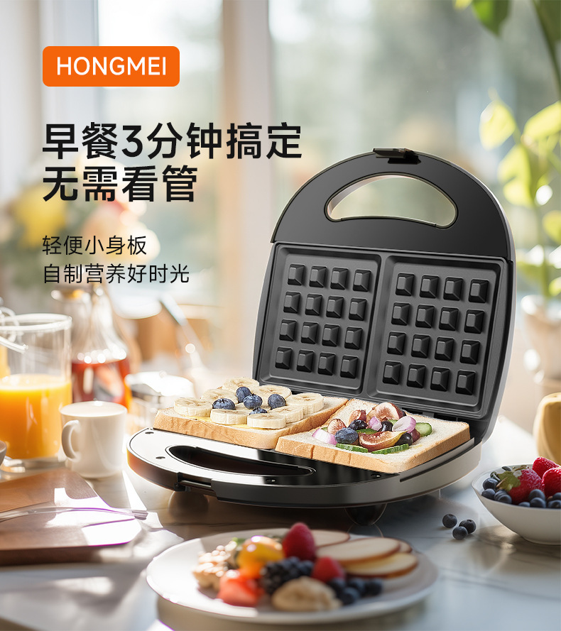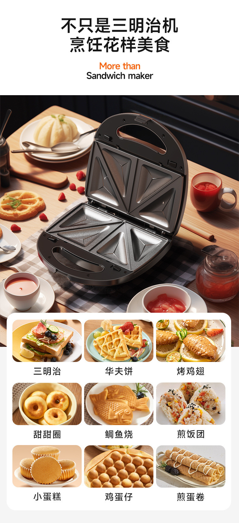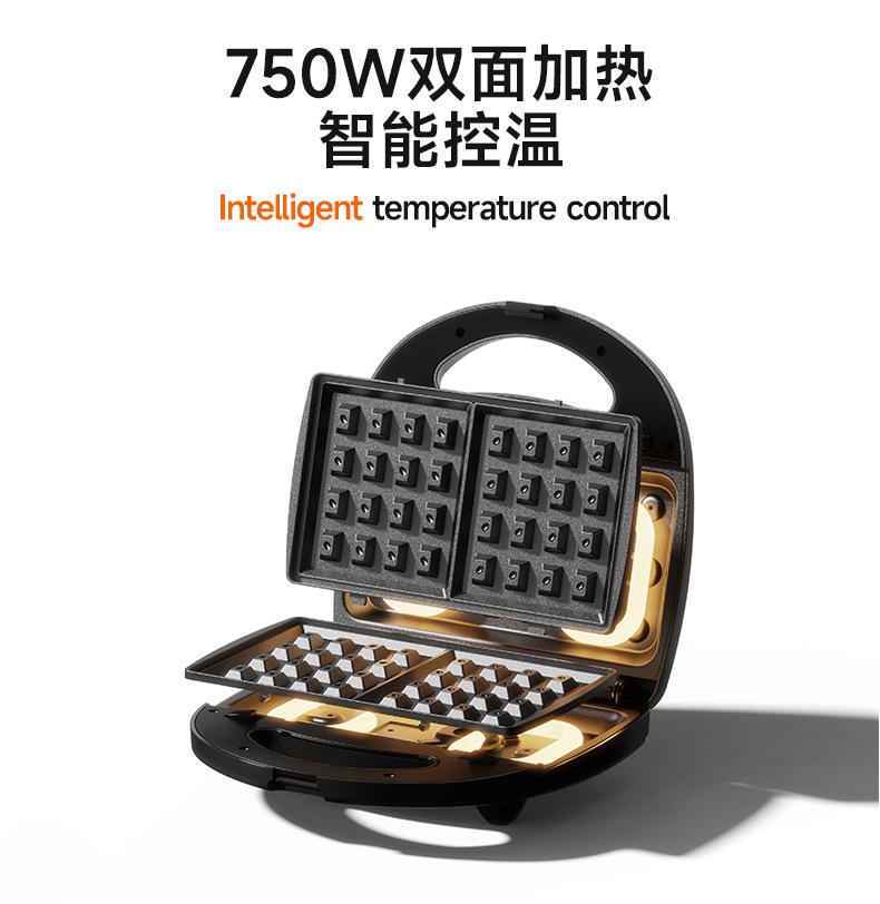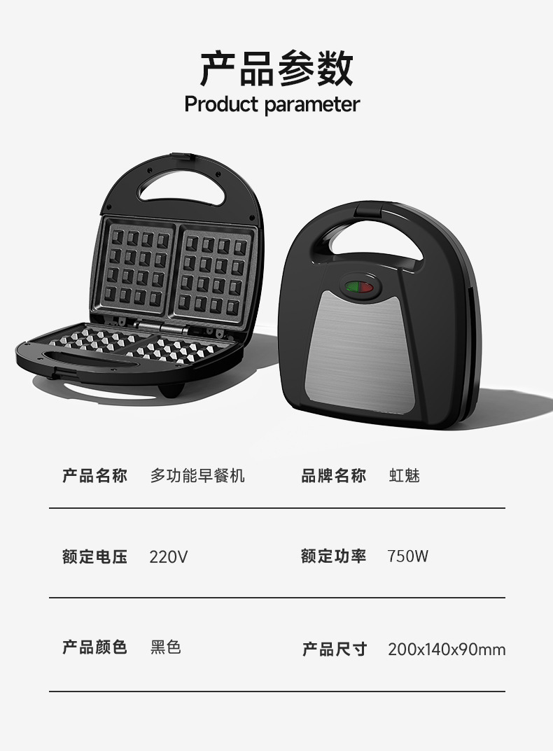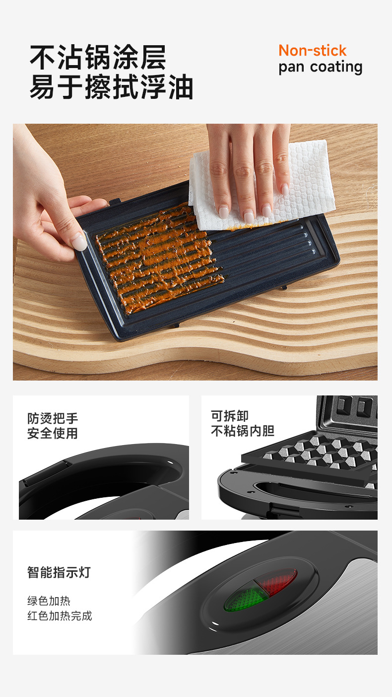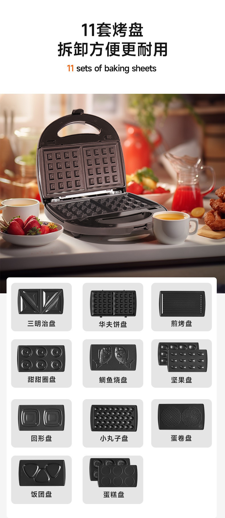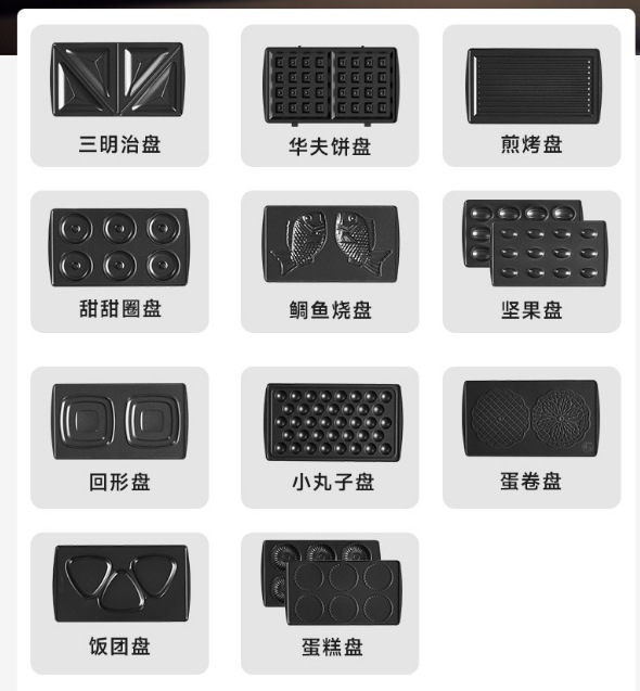 产品特点:可拆卸替换11种烤盘(三明治盘+华夫饼盘+条纹煎烤盘+甜甜圈盘+鲷鱼盘+坚果盘+回型盘+小丸子盘+蛋卷盘+饭团盘+蛋糕盘);750W双面加热,智能控温;不粘锅涂层烤盘,清洗方便;防烫把手,智能指示灯