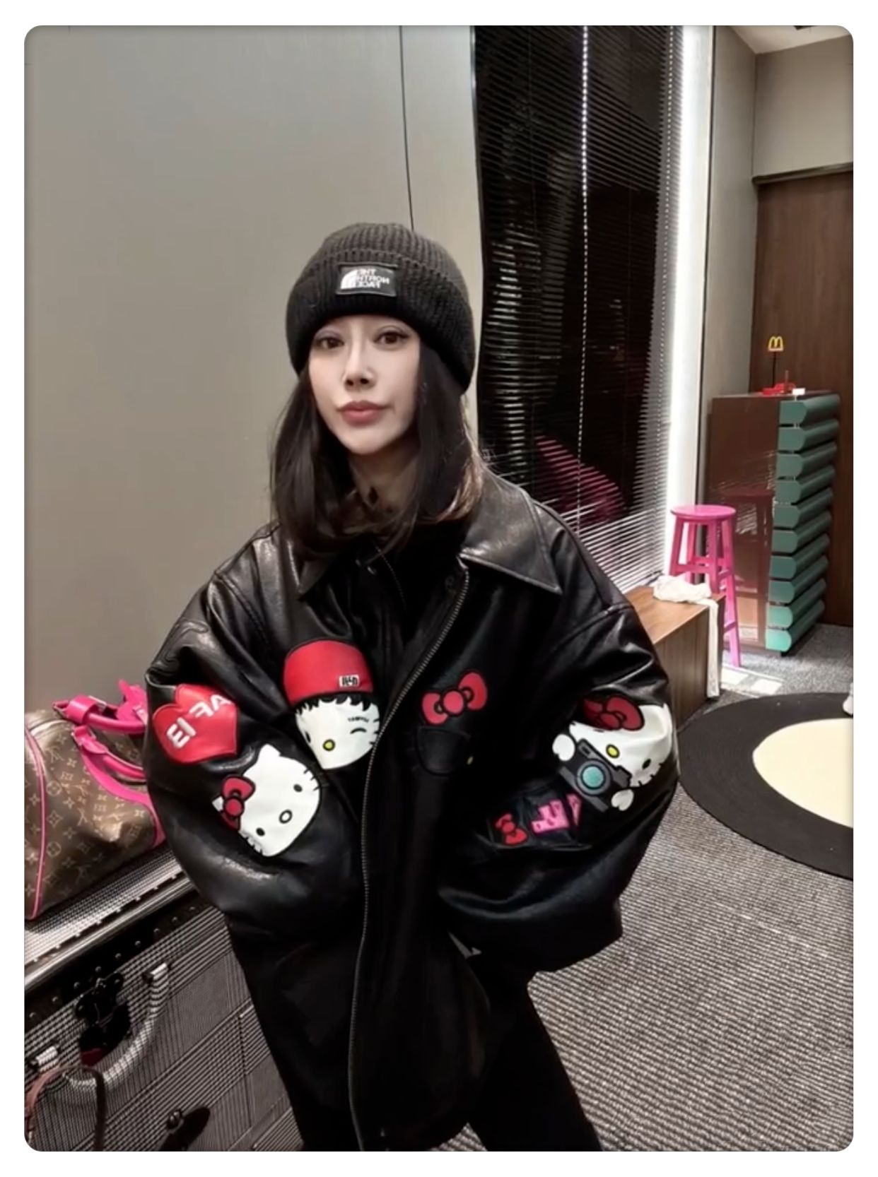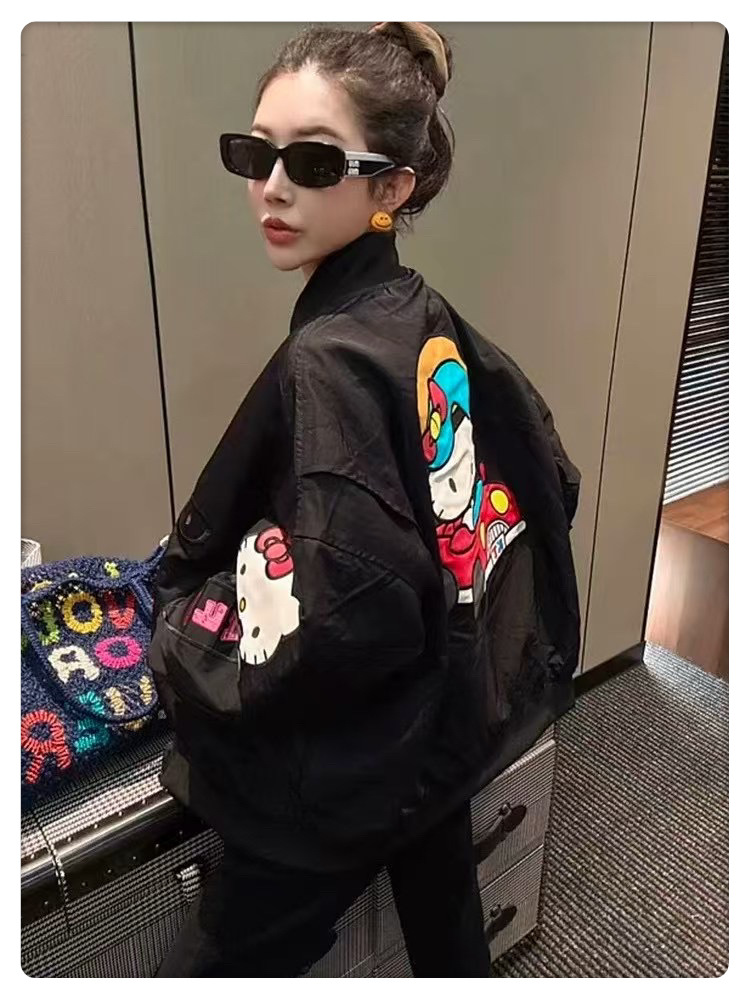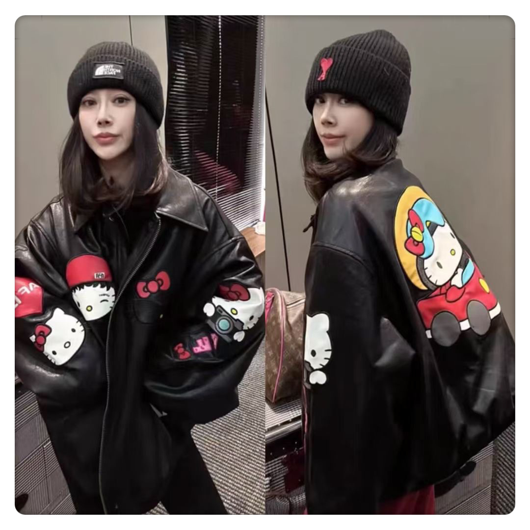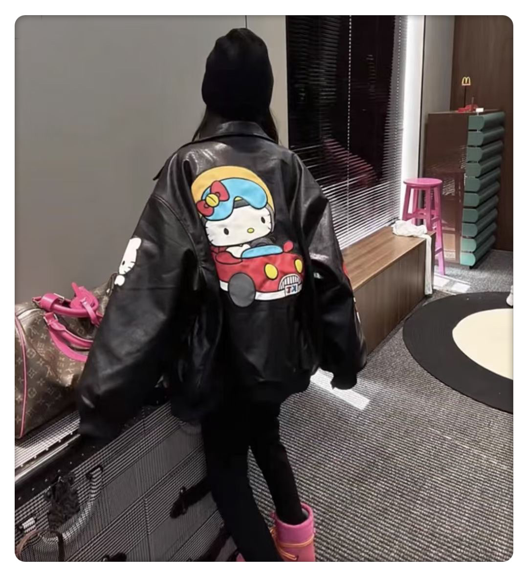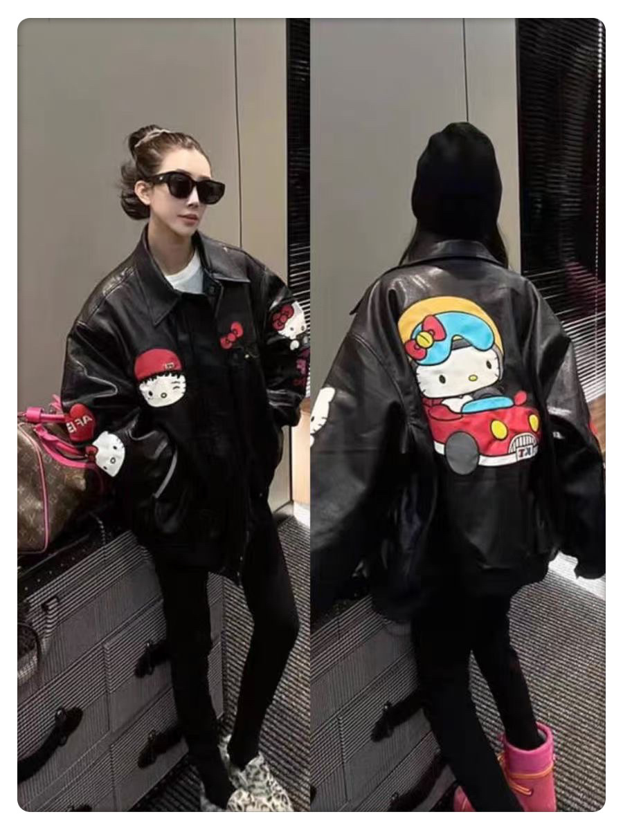 유럽 PU 가죽 자켓 여성의 2025 봄 새로운 블랙 무거운 자수 만화 고양이 느슨한 재킷 트렌디스토어 가기