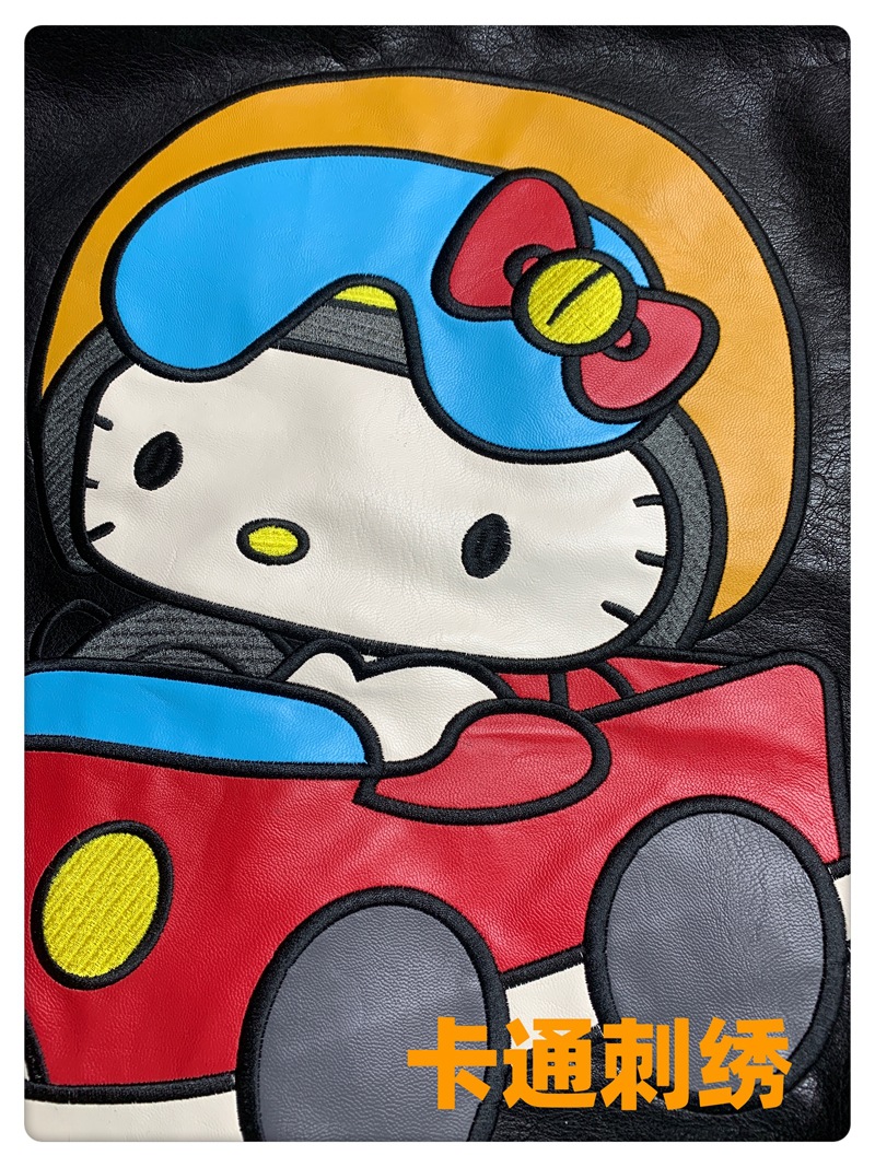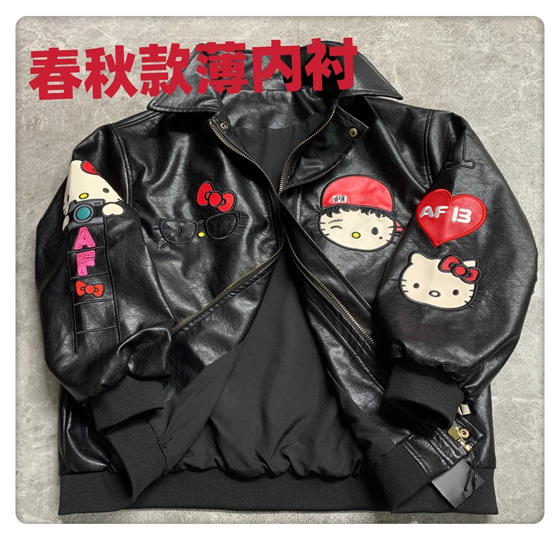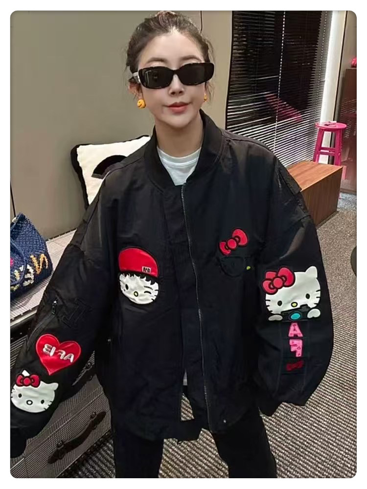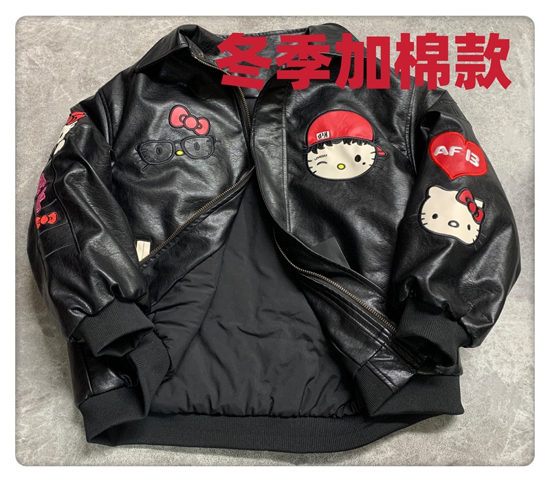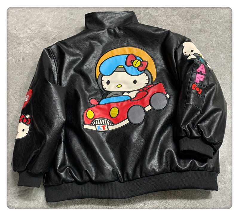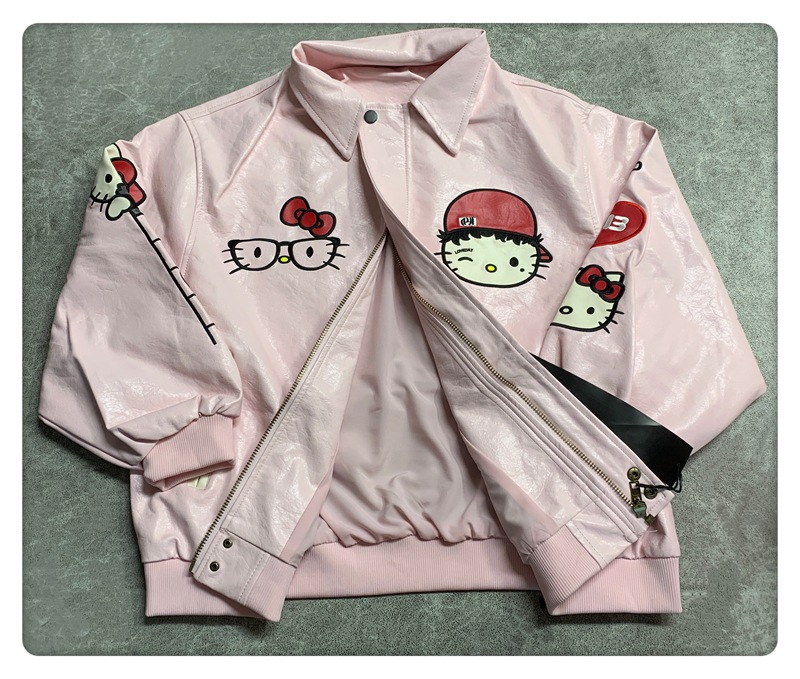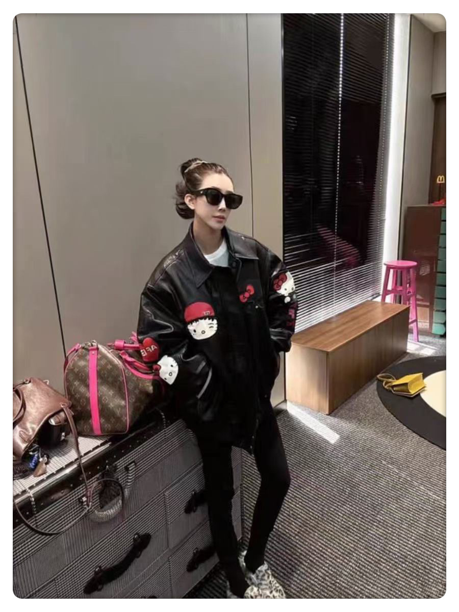 유럽 PU 가죽 자켓 여성의 2025 봄 새로운 블랙 무거운 자수 만화 고양이 느슨한 재킷 트렌디스토어 가기